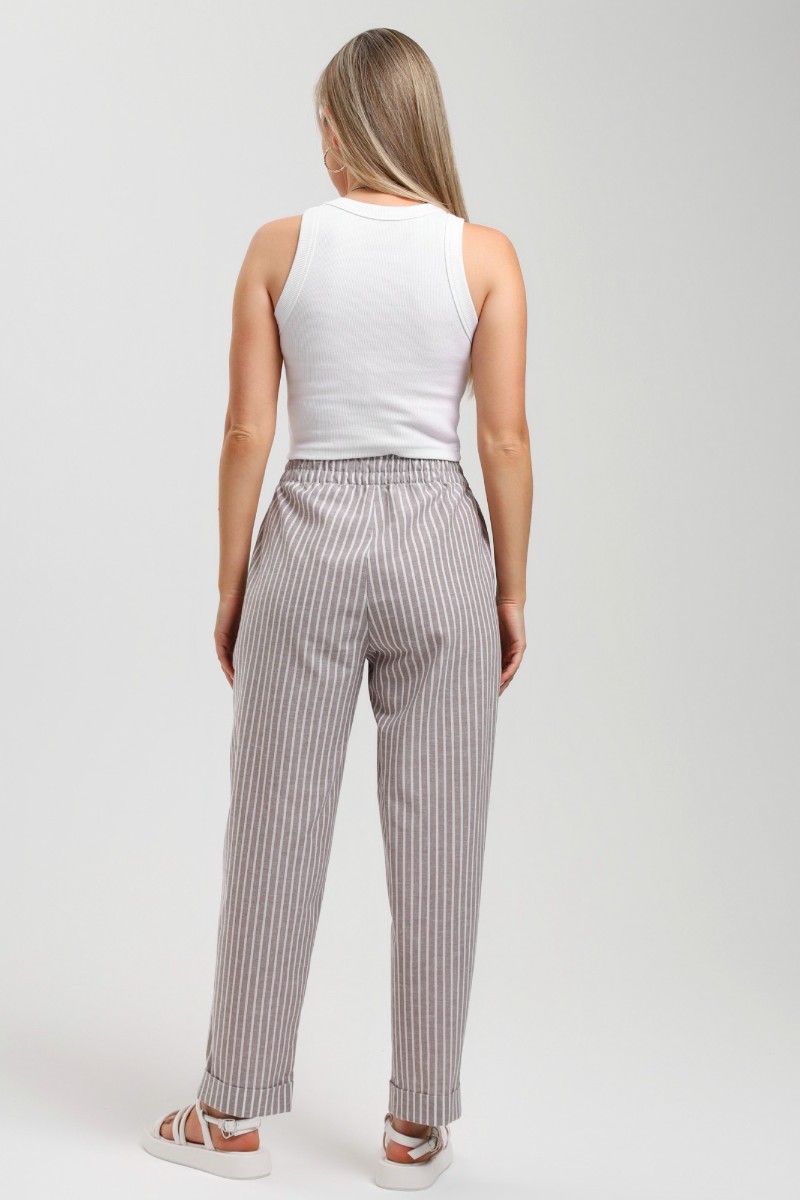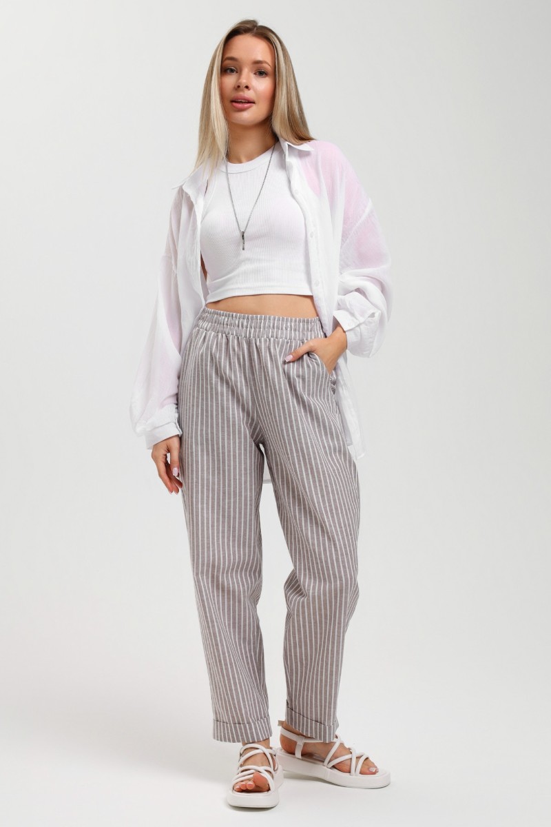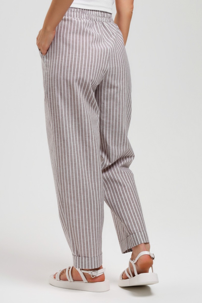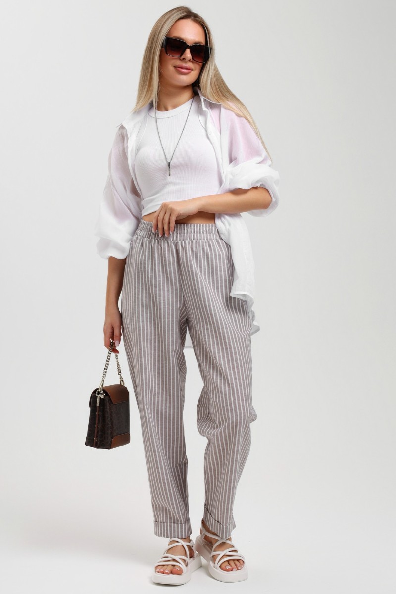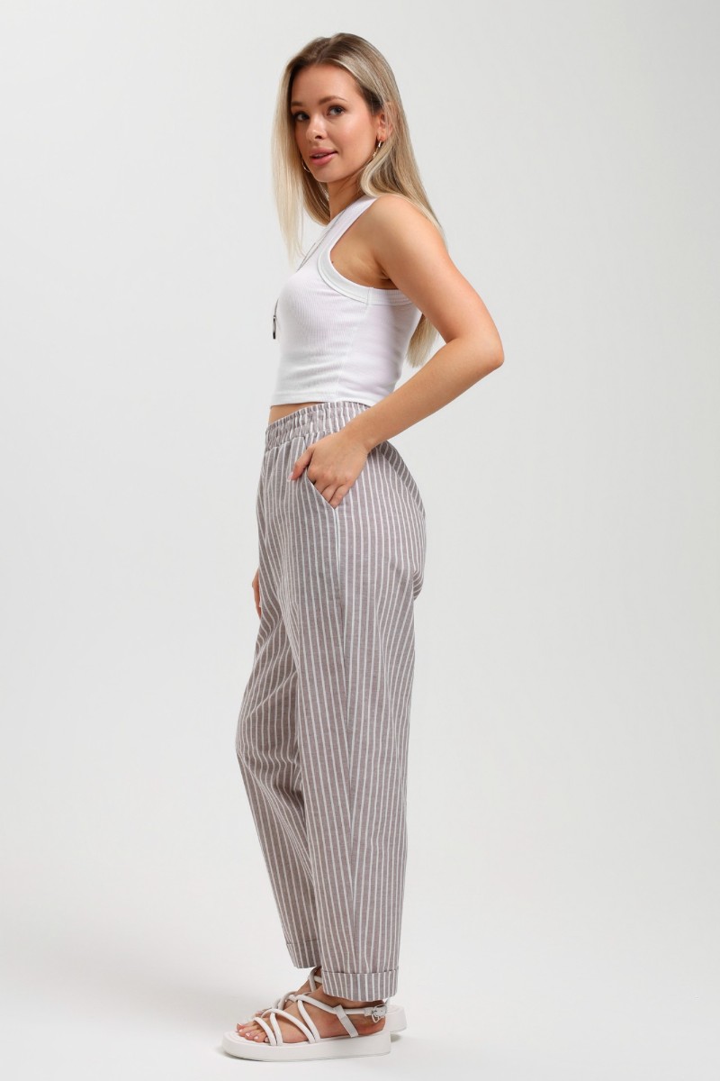 Представляем Вашему вниманию свободные женские брюки из тканого полотна с набивным рисунком в полоску, свободного покроя, с карманами в боковых швах, на притачном поясе с эластичной тесьмой внутри.