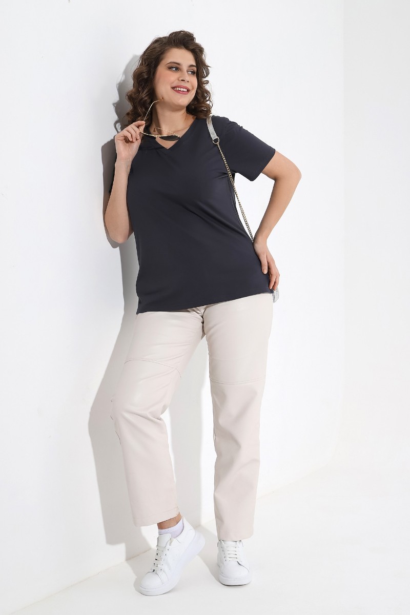 Представляем Вашему вниманию футболку из гладкокрашеного трикотажного полотна «кулирка с лайкрой» классического покроя, с короткими втачными рукавами, горловиной V-образной формы, обработанной втачной планкой и принтом на полочке.