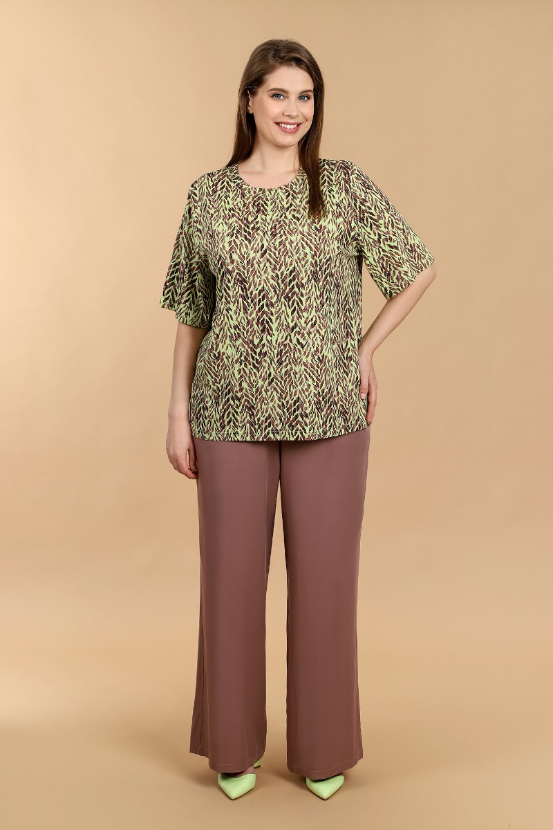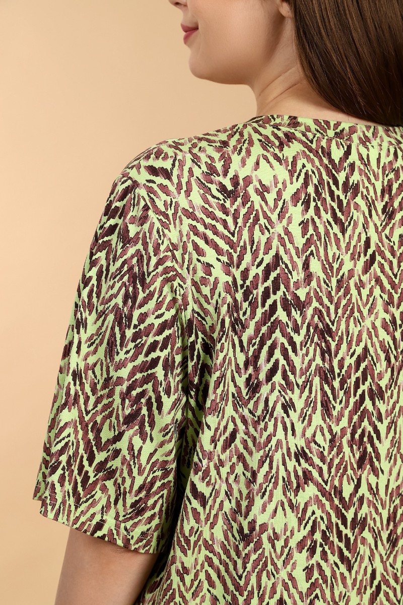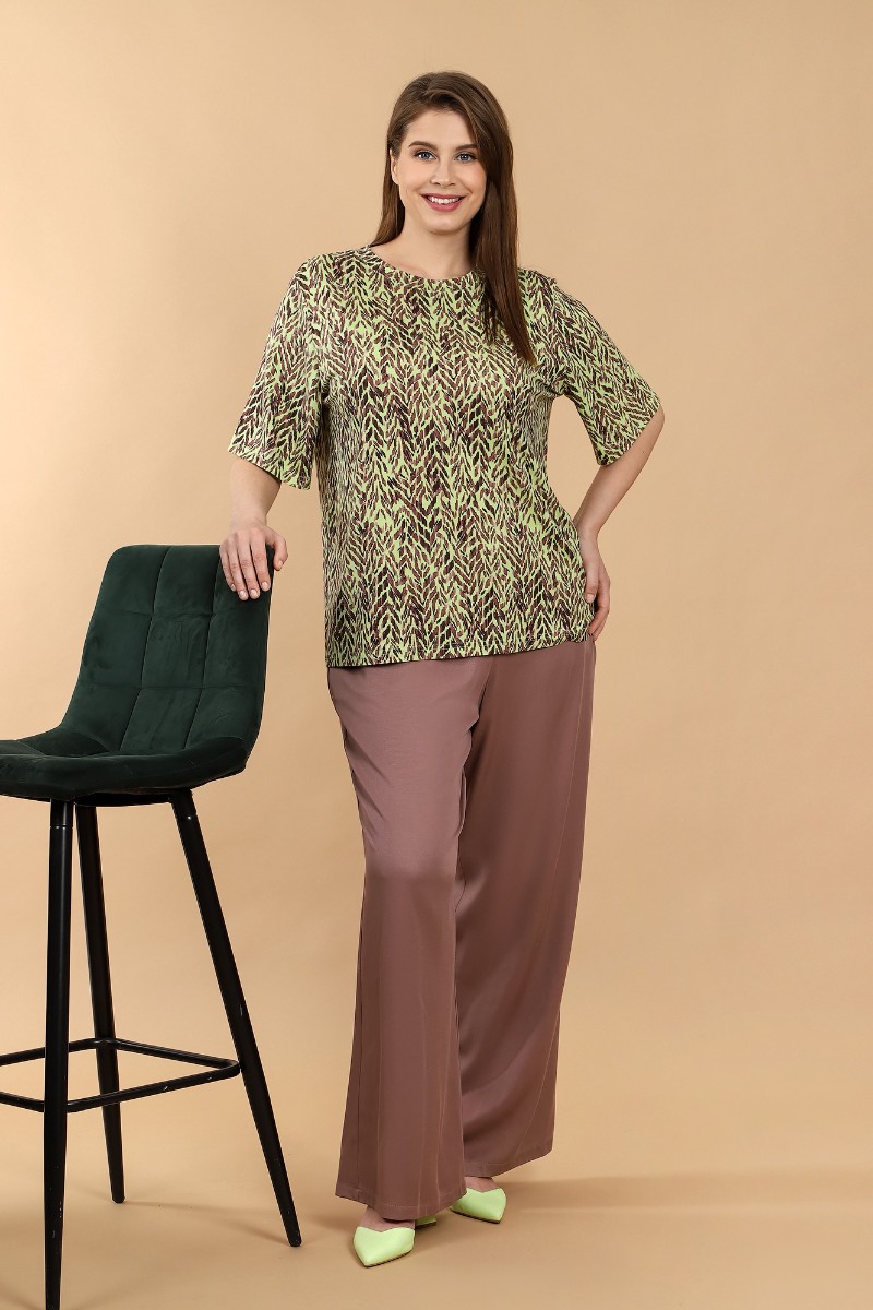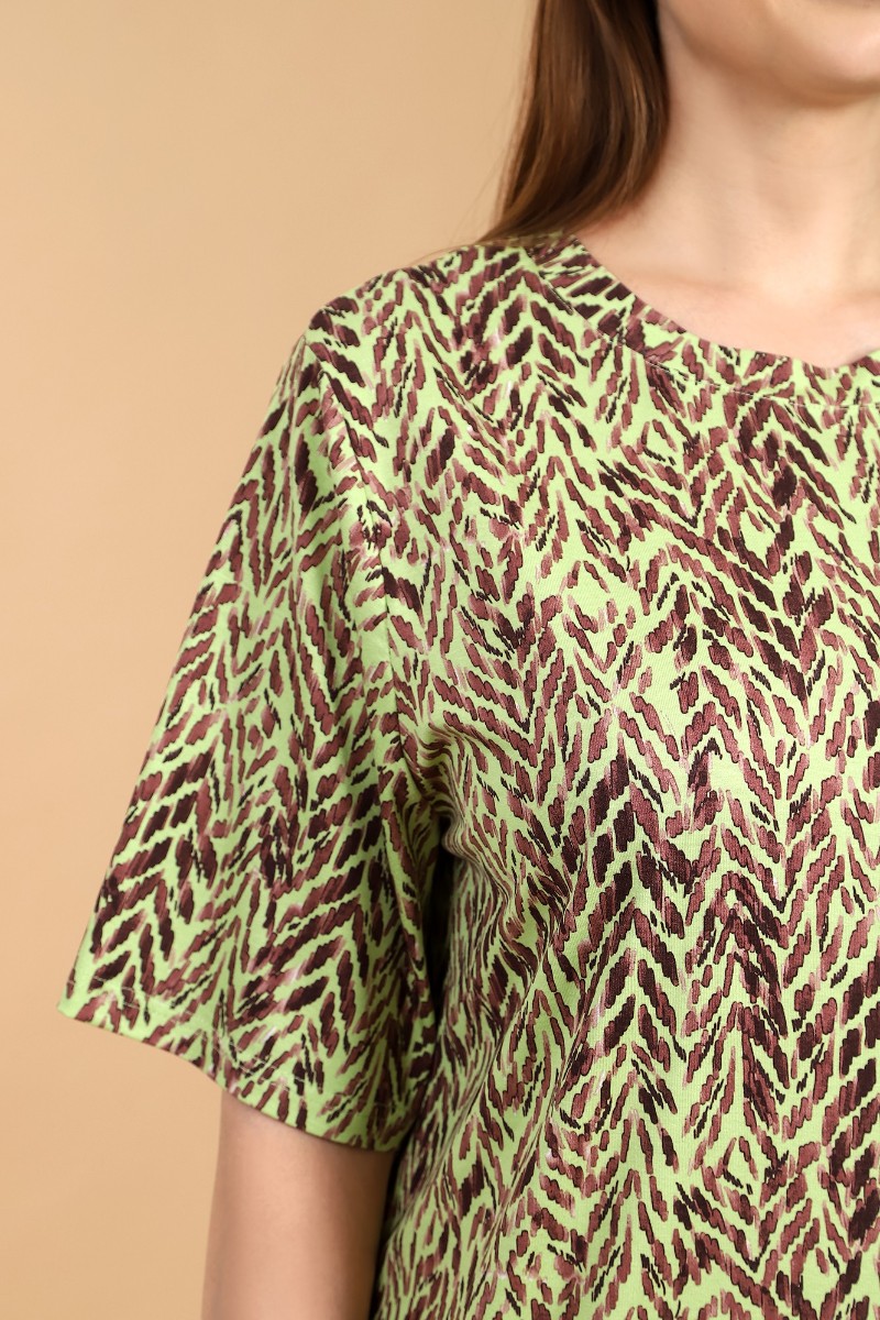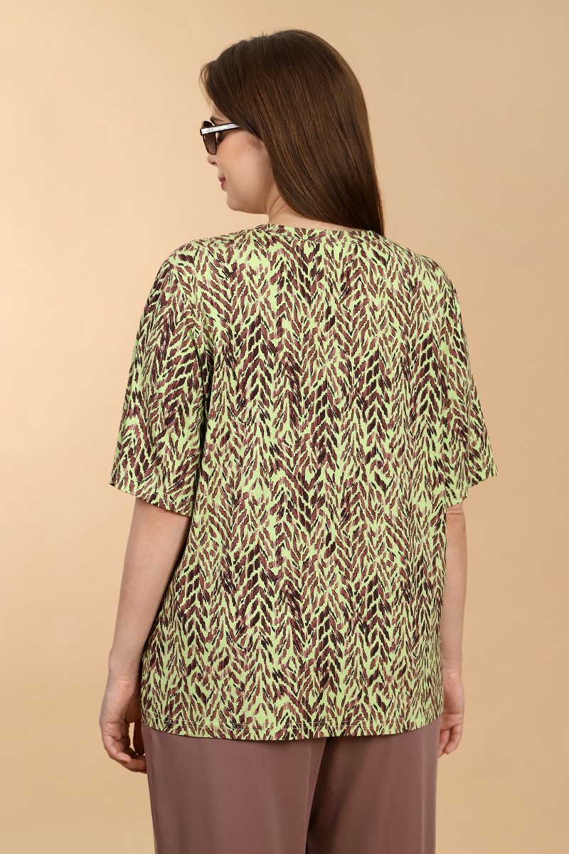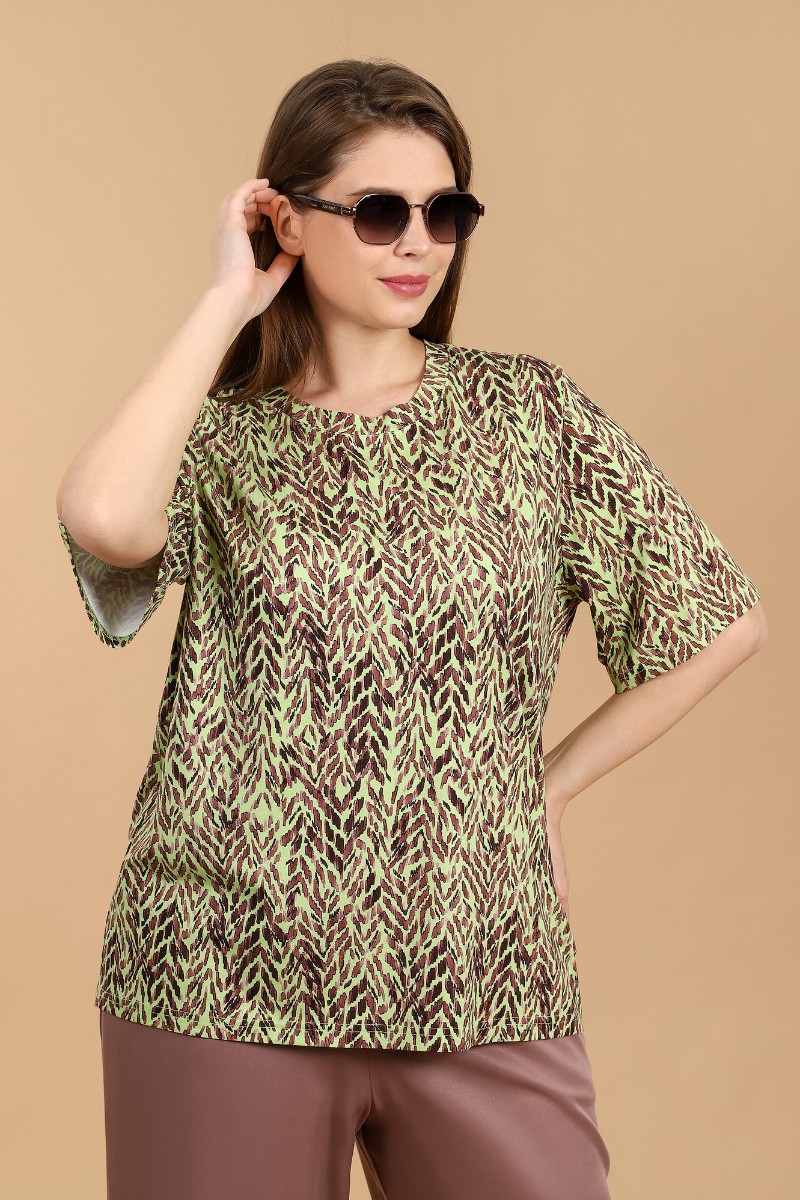 Представляем Вашему вниманию женскую футболку из вискозного трикотажного полотна с набивным рисунком, классического покроя, с горловиной овальной формы, обработанной широкой втачной планкой, с короткими втачными рукавами.