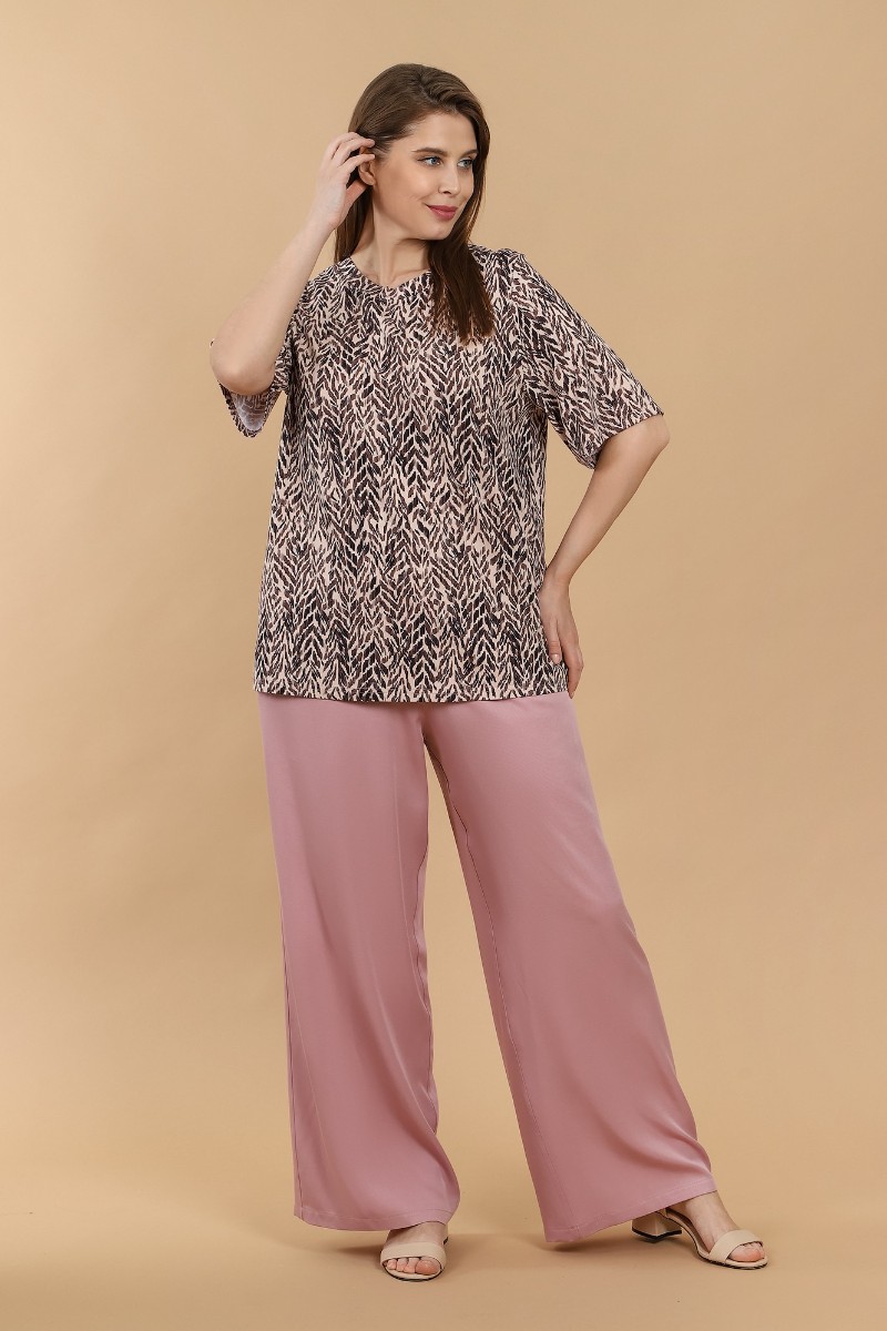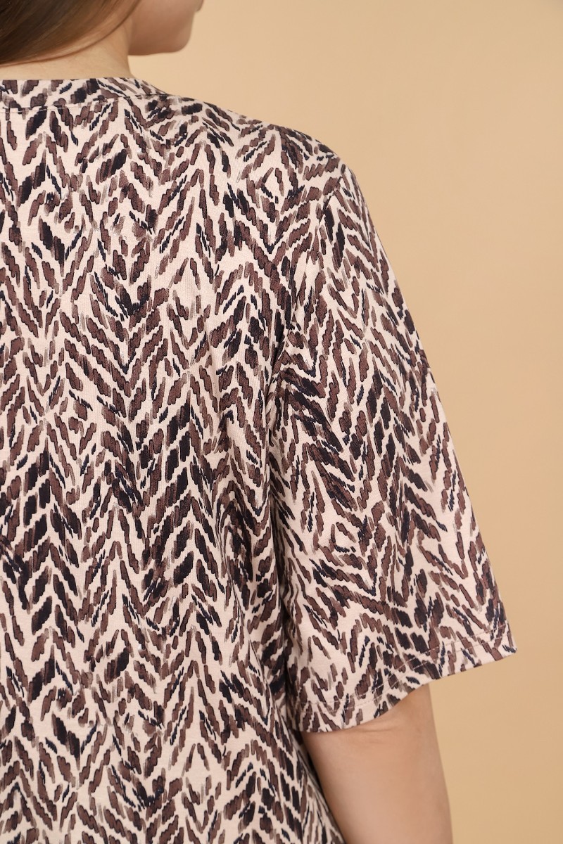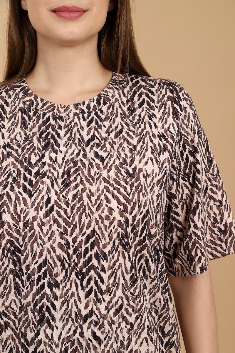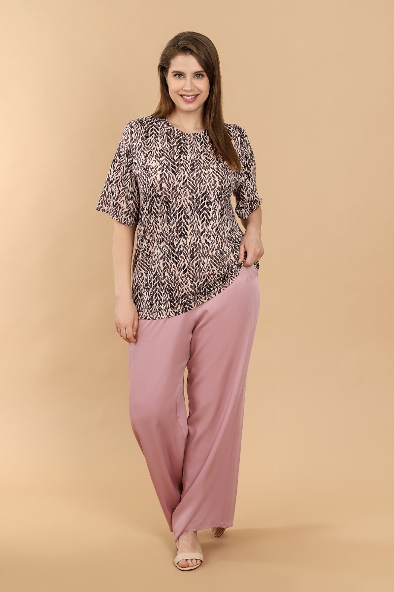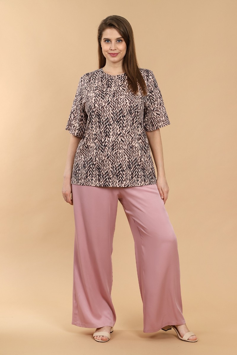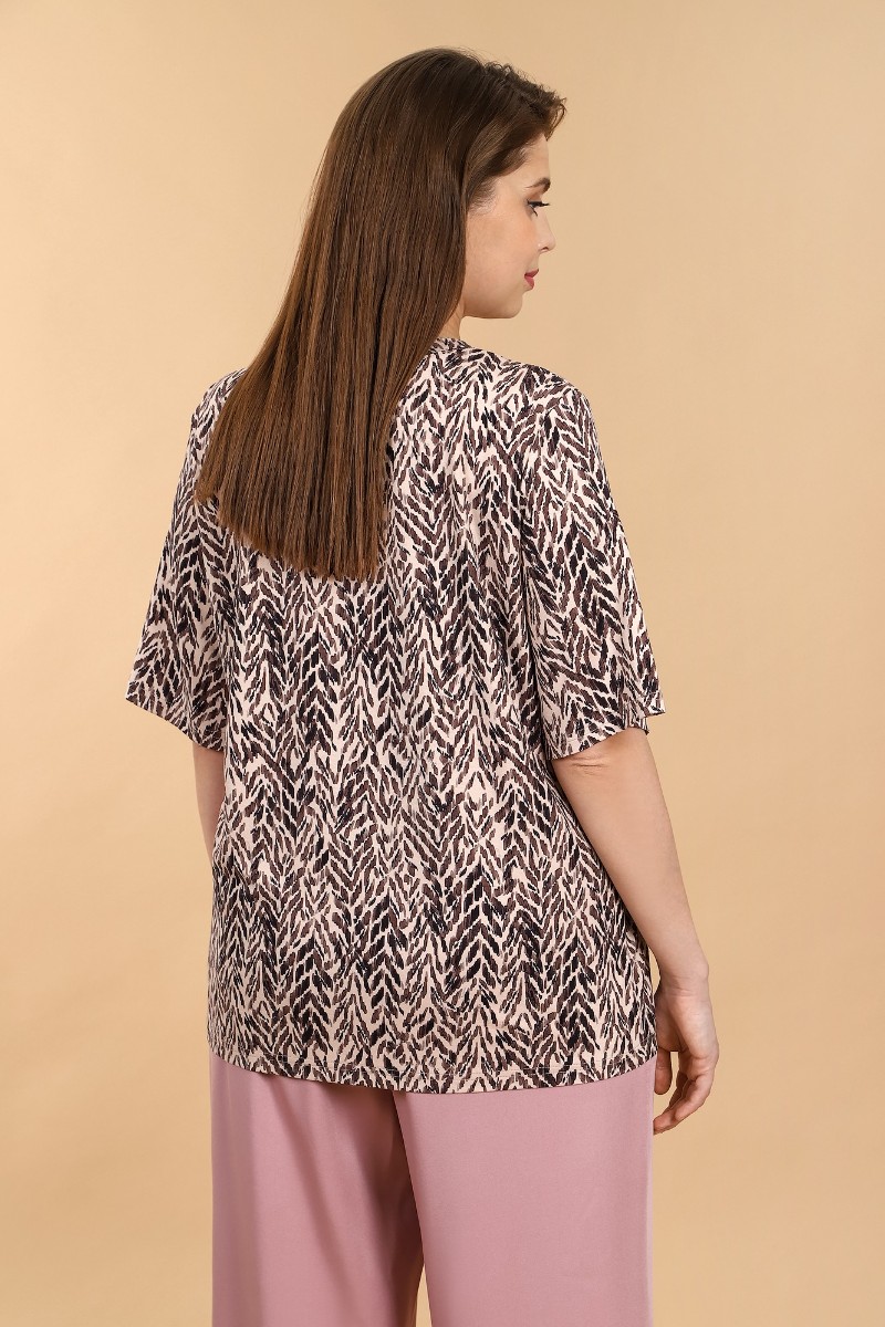 Представляем Вашему вниманию женскую футболку из вискозного трикотажного полотна с набивным рисунком, классического покроя, с горловиной овальной формы, обработанной широкой втачной планкой, с короткими втачными рукавами.