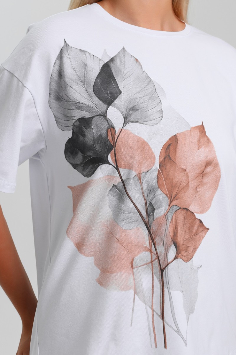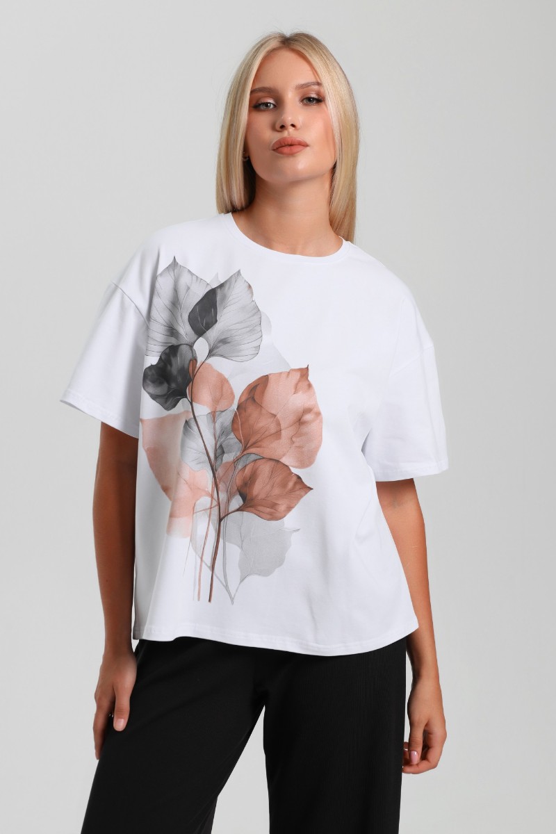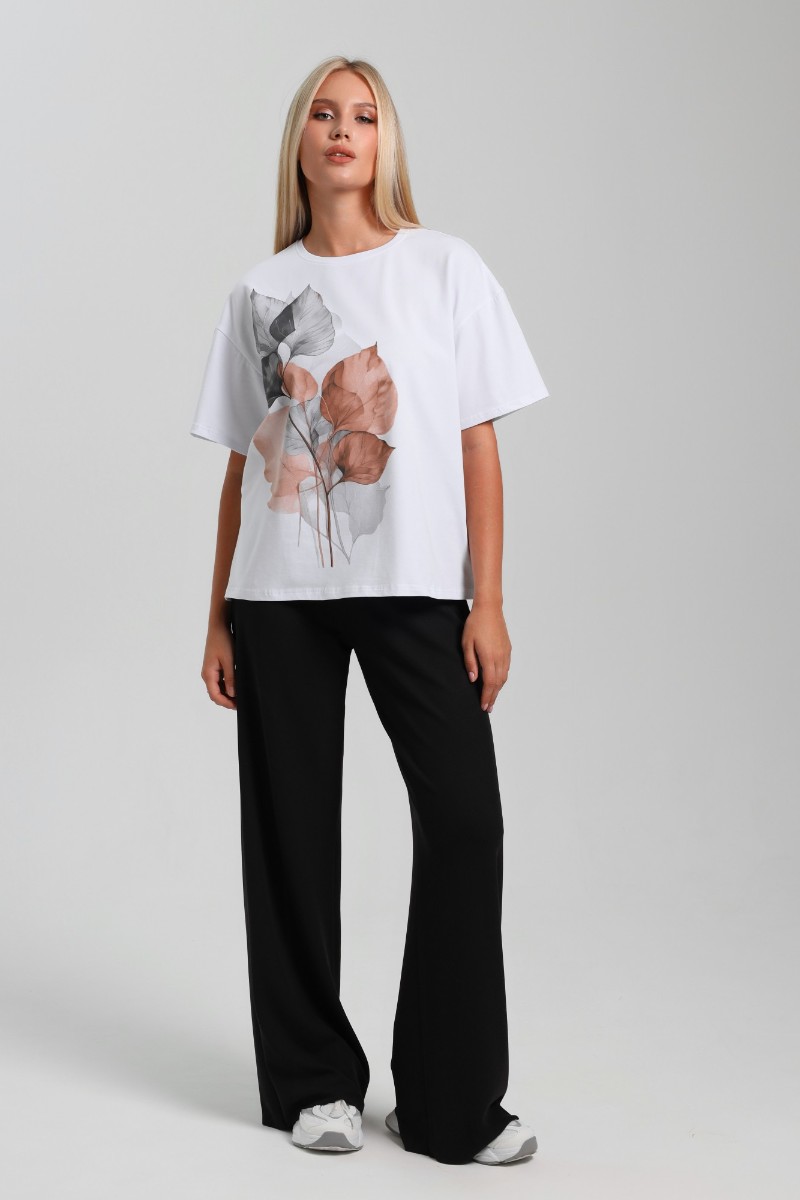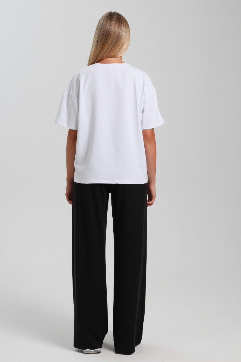 Представляем Вашему вниманию женскую футболку из гладкокрашеного трикотажного полотна «кулирка с лайкрой», классического покроя, с втачными короткими рукавами и печатью на полочке, выполненной в технике «шелкографии». Горловина овальной формы обработана втачной планкой с отделочной строчкой по шву притачивания.