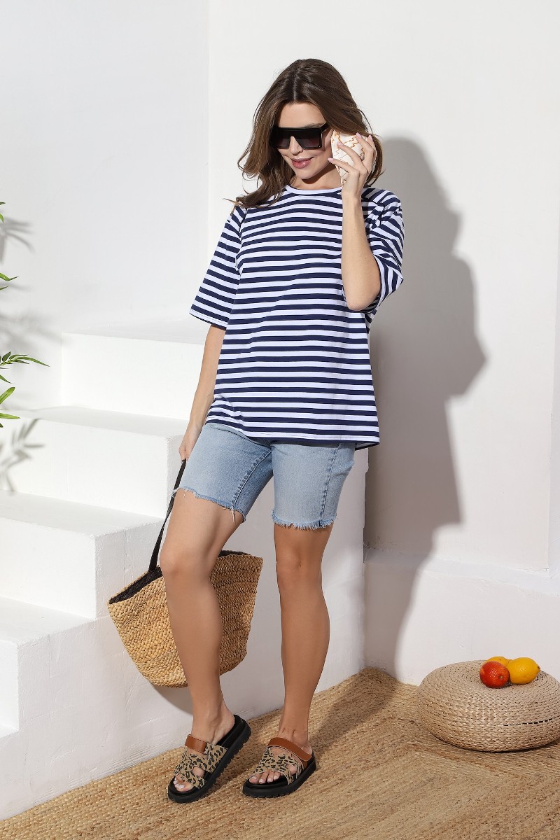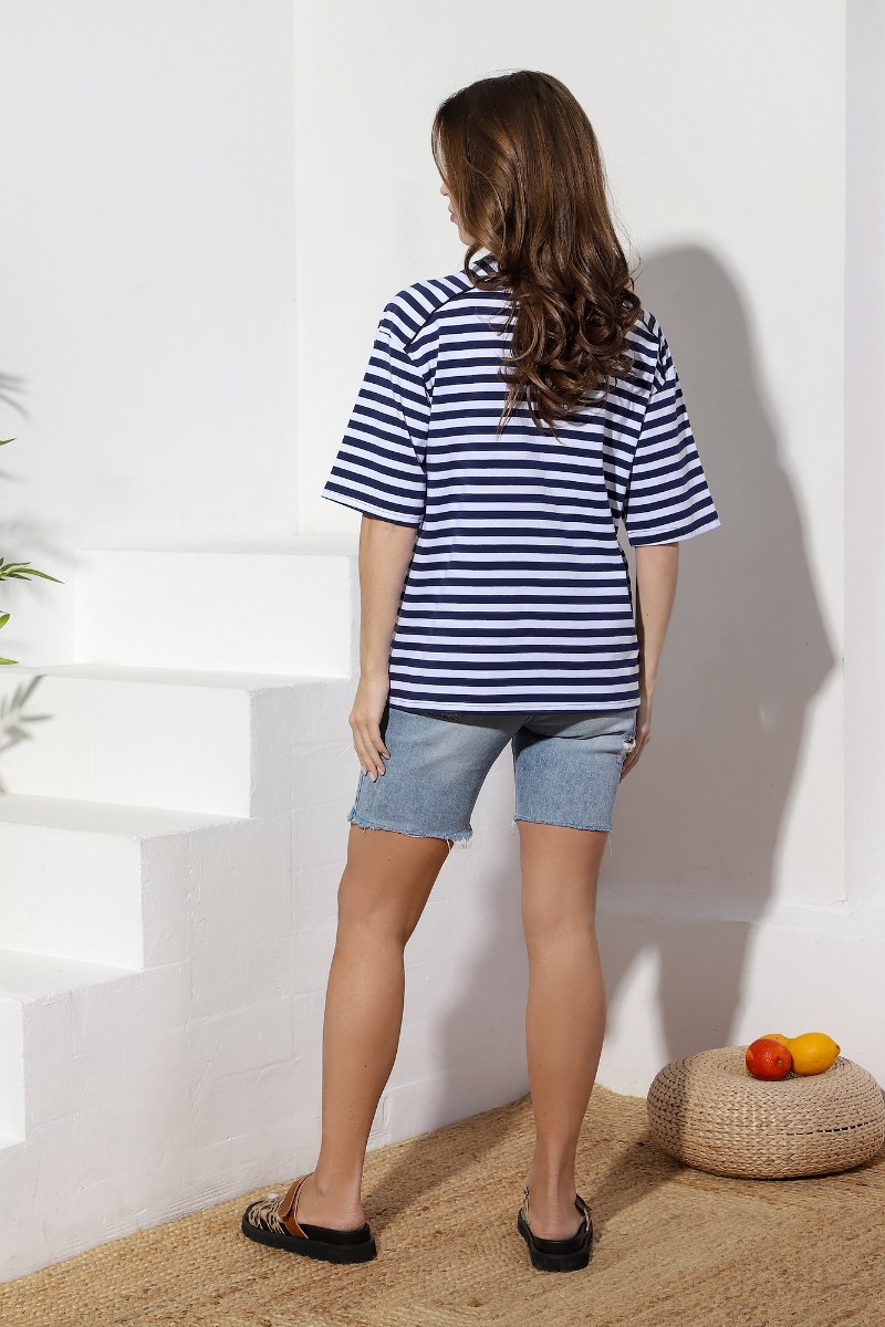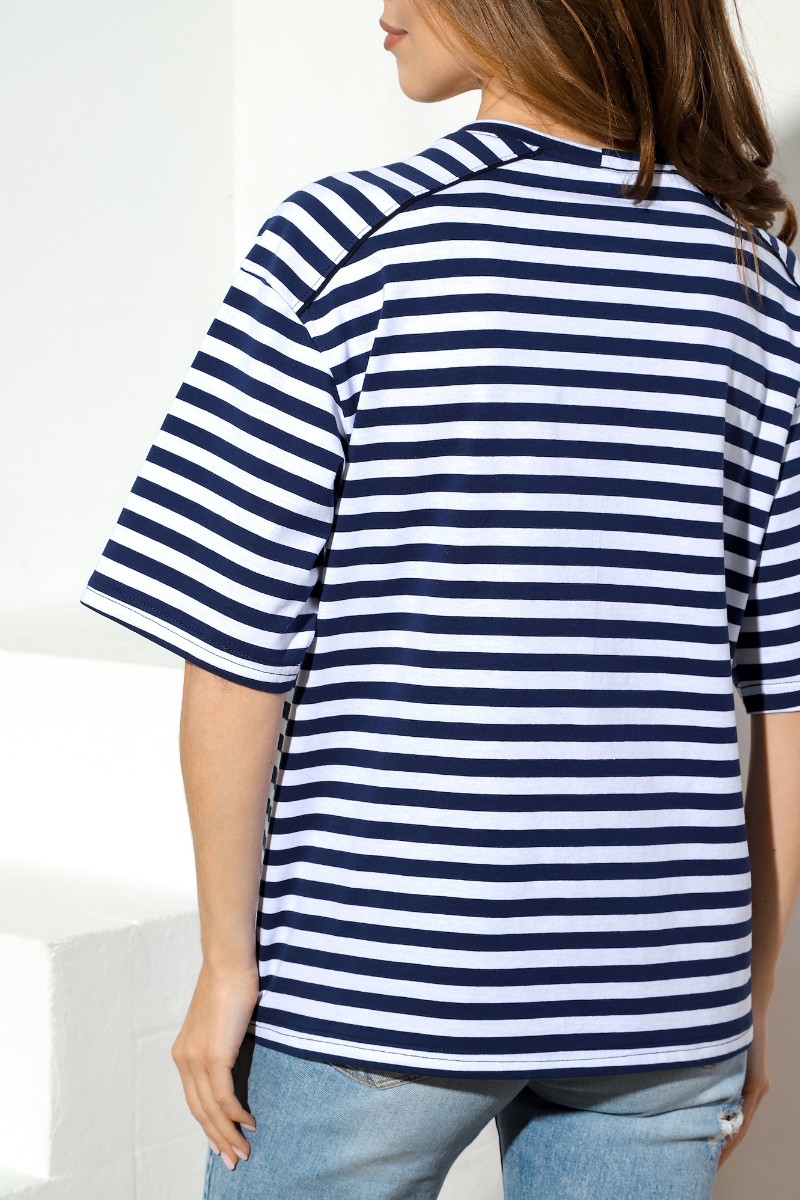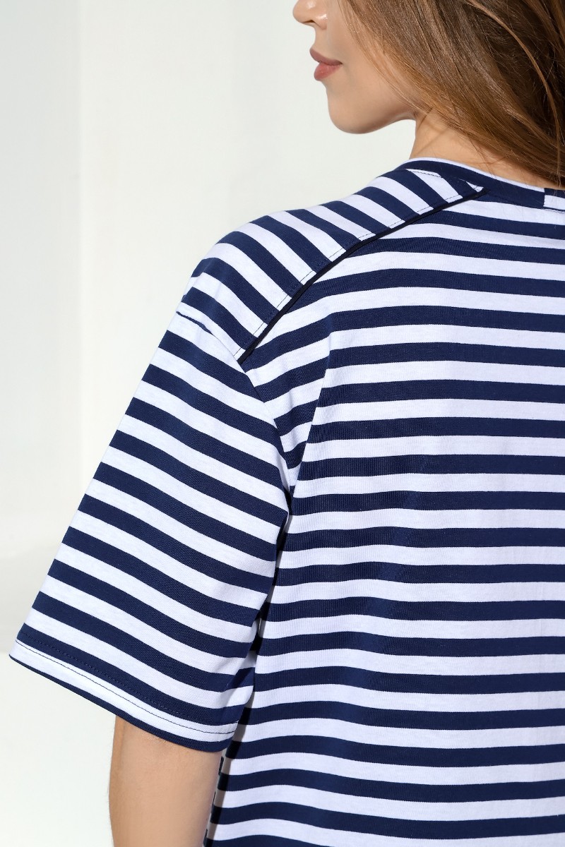 Представляем Вашему вниманию молодежную футболку из трикотажного полотна кулирка в полоску, свободная, с втачными рукавами, горловиной овальной формы, обработанной притачной бейкой из основного материала. Полочка и спинка с двумя небольшими косыми кокетками и отделочным кантом в швах соединения кокеток с основными деталями, кант из контрастного материала.