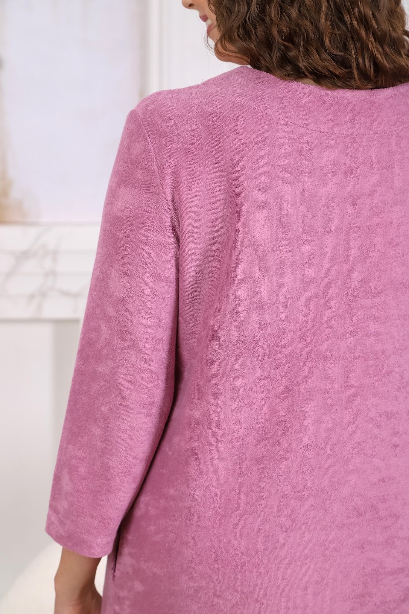 Представляем Вашему вниманию халат женский из гладкокрашеного трикотажного махрового полотна, прямого силуэта, горловиной овальной формы, с втачными рукавами длиной до локтя, карманами в боковых швах, центральной бортовой застежкой на петли и пуговицы. На полочках в области груди выполнены шесть декоративных складочек - «защипов».