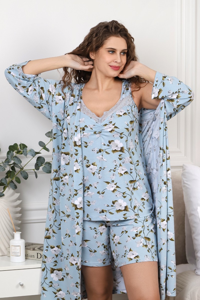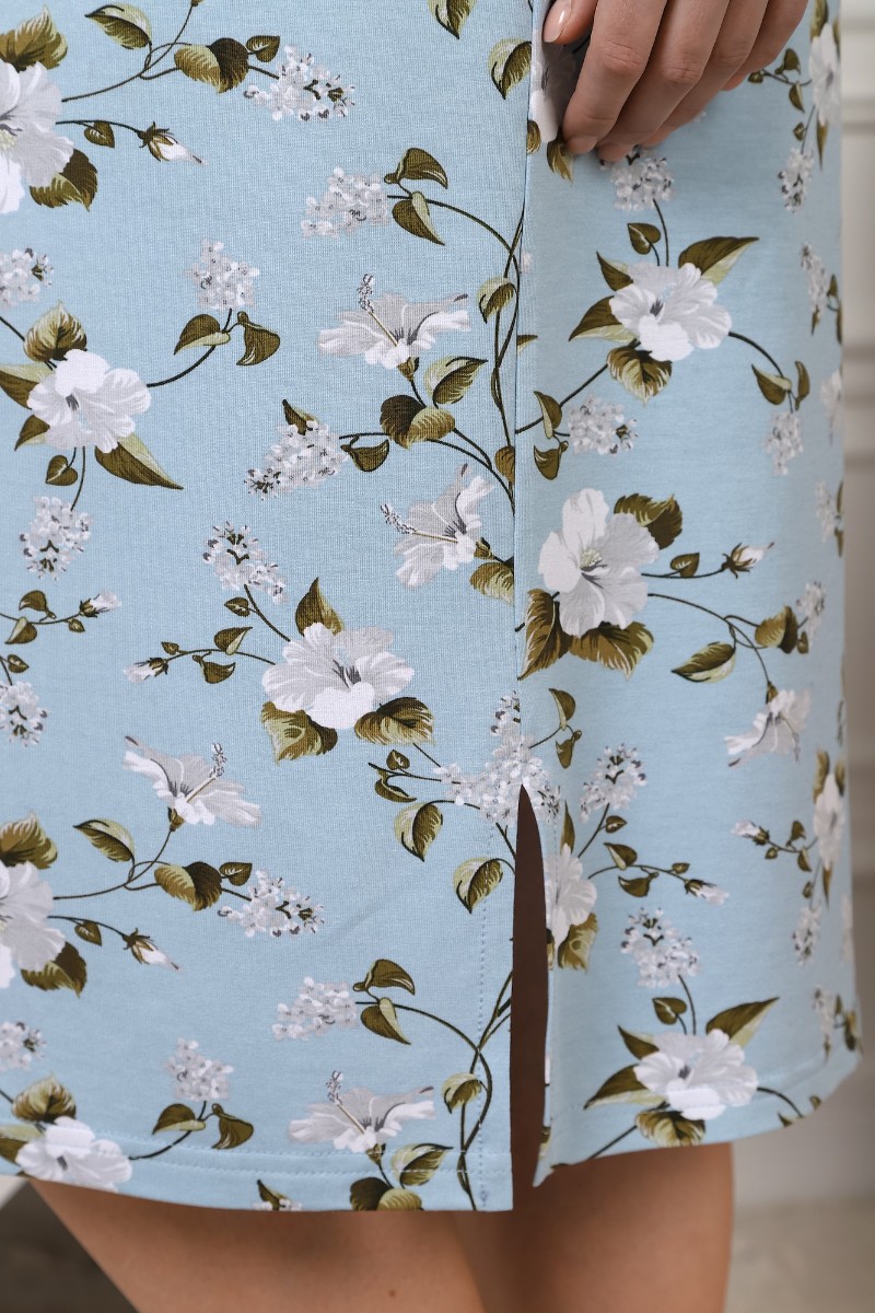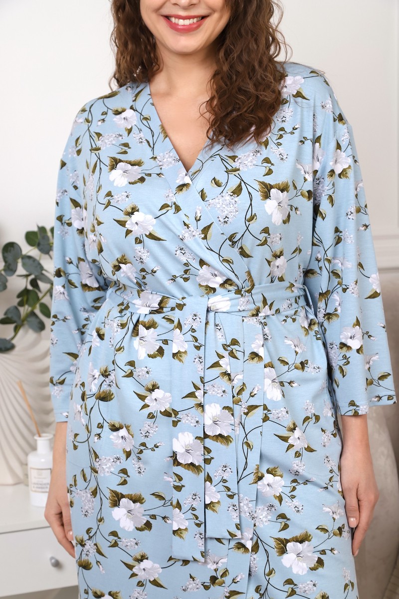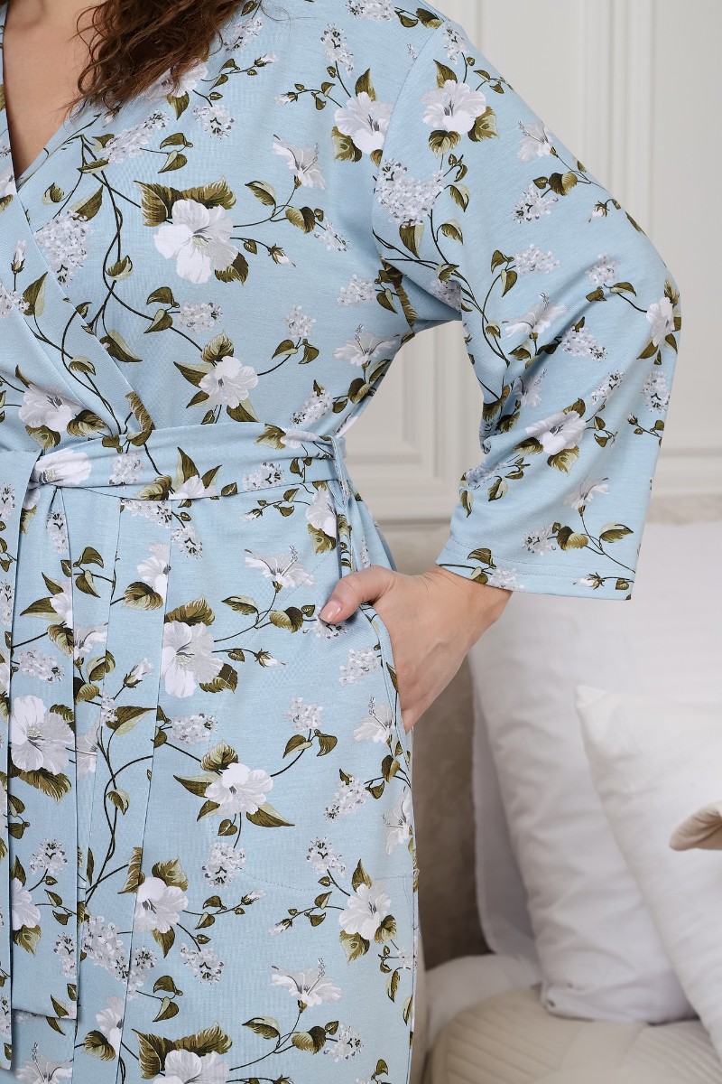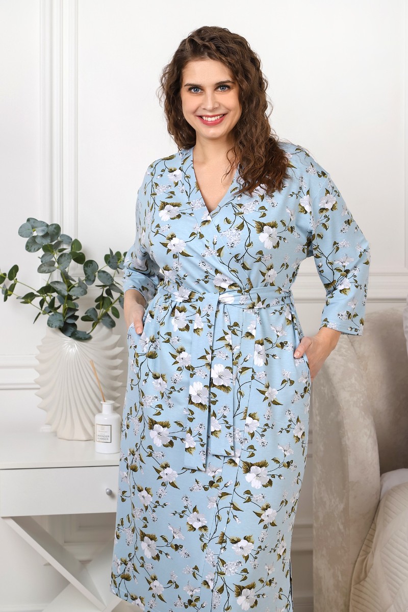 Представляем Вашему вниманию халат женский из трикотажного вискозного полотна с набивным рисунком, на запахе, с втачными рукавами длиной ¾, с карманами и небольшими разрезами в боковых швах. Изделие укомплектовано съемным поясом, продетым в две шлевки на уровне линии талии. Борта и горловина обработаны притачной планкой.