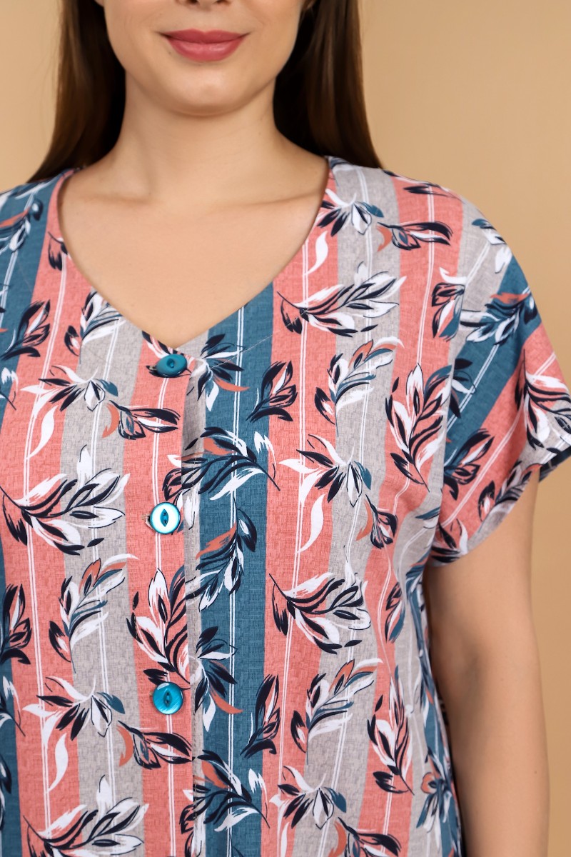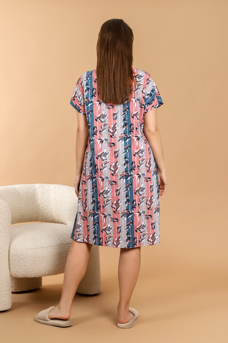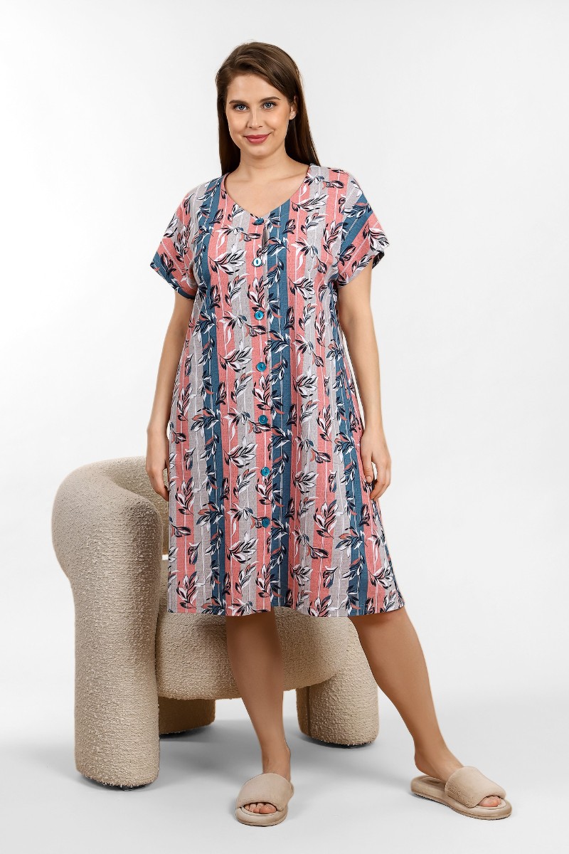 Представляем Вашему вниманию халат женский из трикотажного полотна «кулирка» с набивным рисунком, свободного покроя, с цельнокроеными рукавами, центральной бортовой застежкой на петли и пуговицы, карманами в боковых швах. обтачками, спинка окантована.