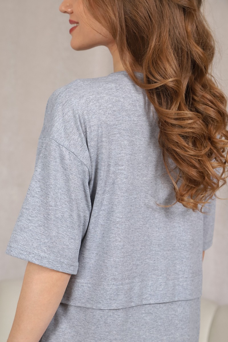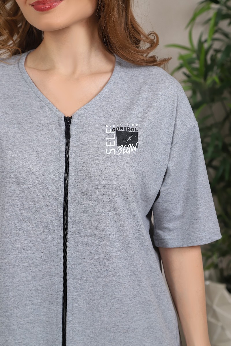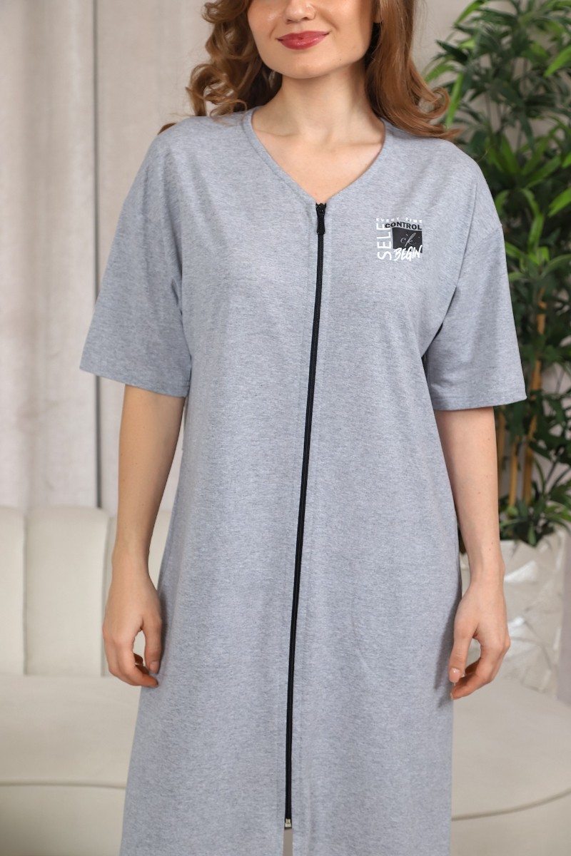Представляем Вашему вниманию женский халат из гладкокрашеного трикотажного полотна «кулирка» с меланжированным эффектом, прямого силуэта, со спущенной линией плеча, горловиной V-образной формы, втачными короткими рукавами, карманами в боковых швах и центральной бортовой застежкой на тесьму «молния». Горловина окантована основным материалом, на полочке печать, выполненная в технике «шелкографии», на спинке, на уровне талии заложена складка, делящая спинку пополам.