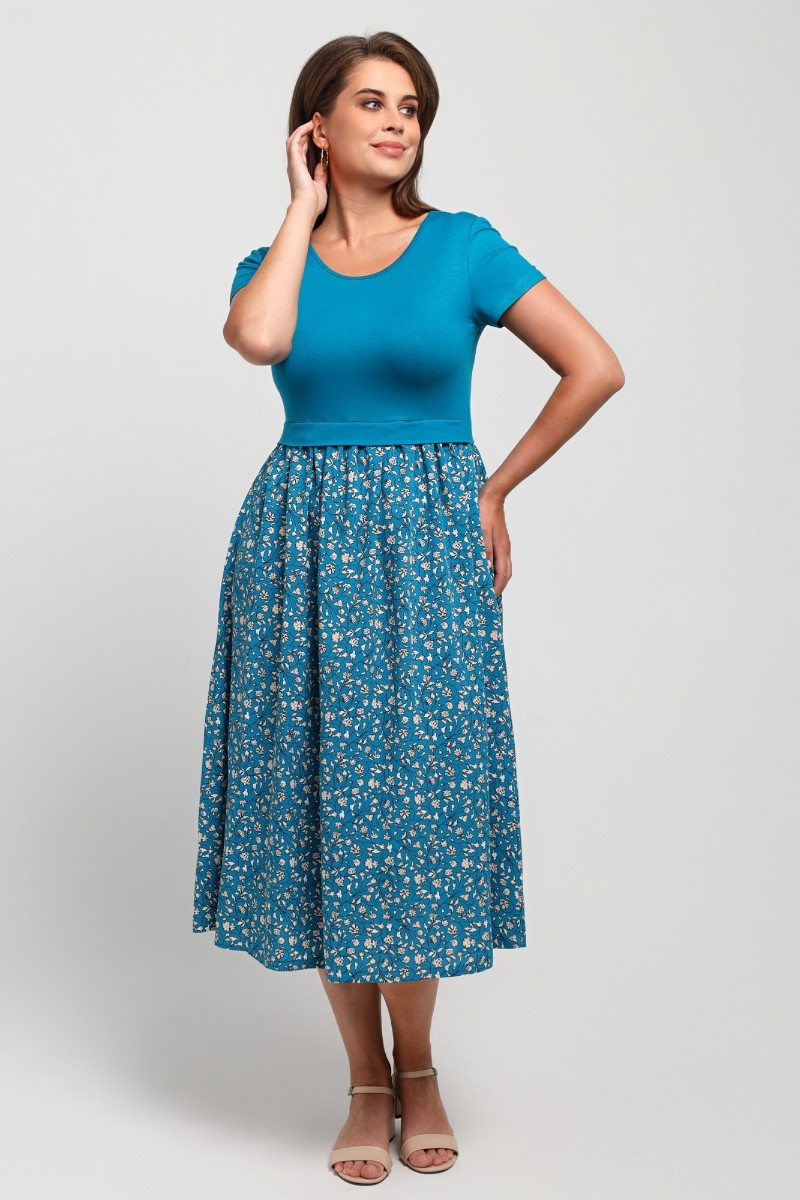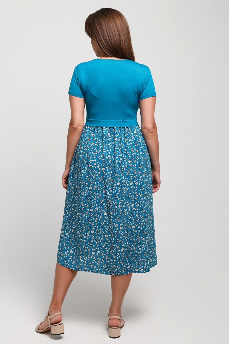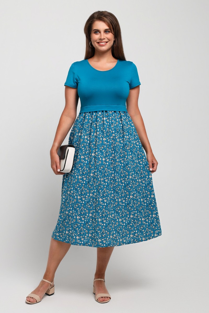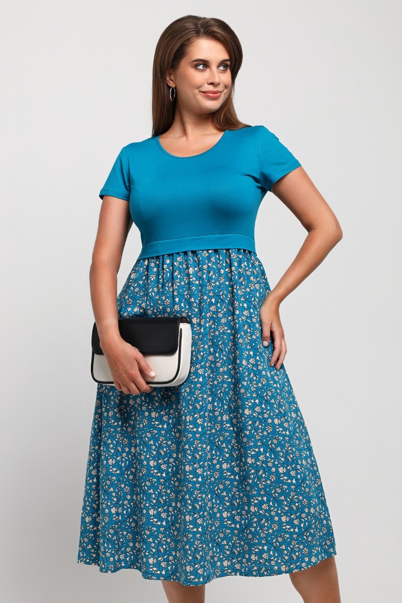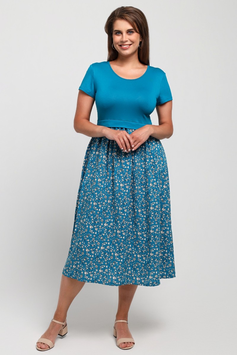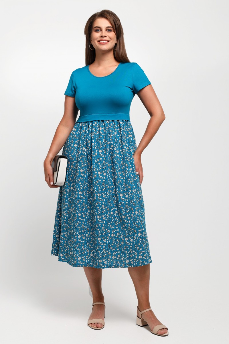 Представляем Вашему вниманию платье отрезное по талии в комбинации двух видов в единой цветовой гамме: гладкокрашеного полотна «кулирка» с лайкрой (лиф) и плательной штапельной ткани (юбка) с набивным рисунком, удлиненное, отрезное по талии, с короткими втачными рукавами, горловиной овальной формы, окантованной основным материалом и декоративной планкой в шве соединения лифа с юбкой. Юбка по шву соединения с лифом присборена.