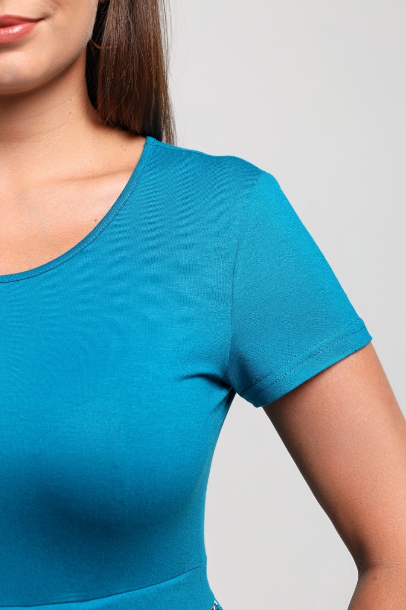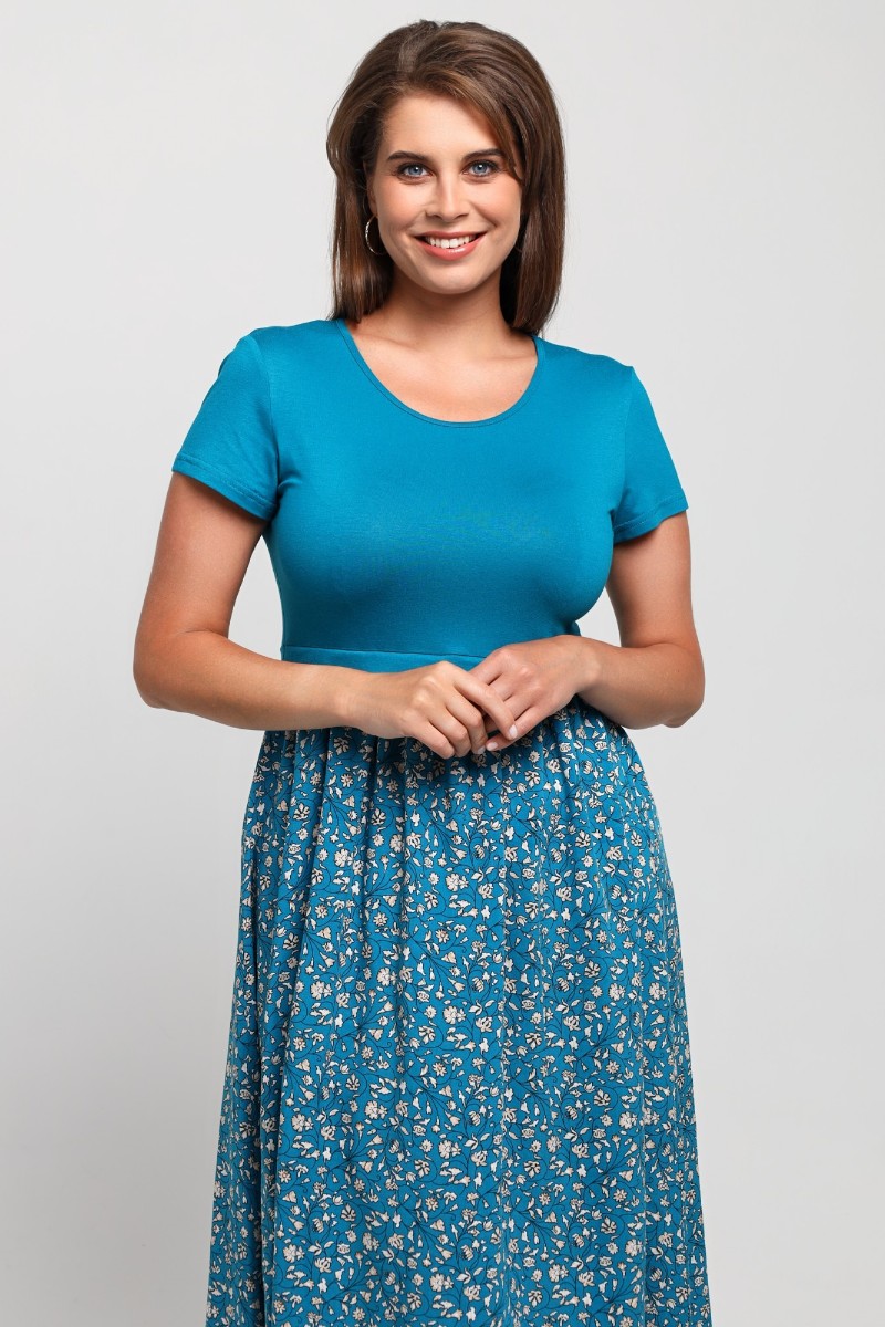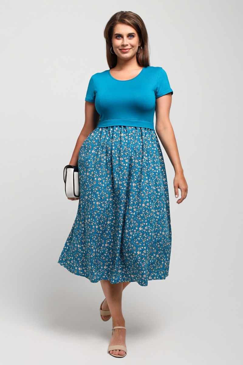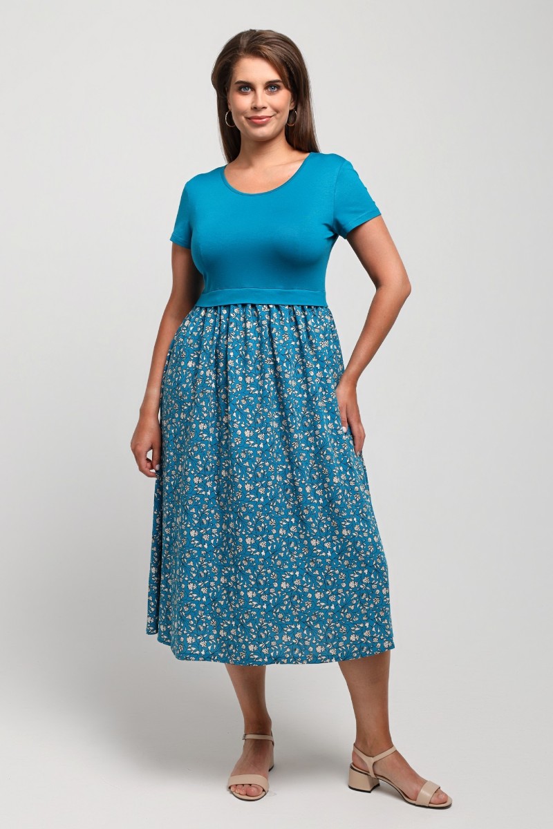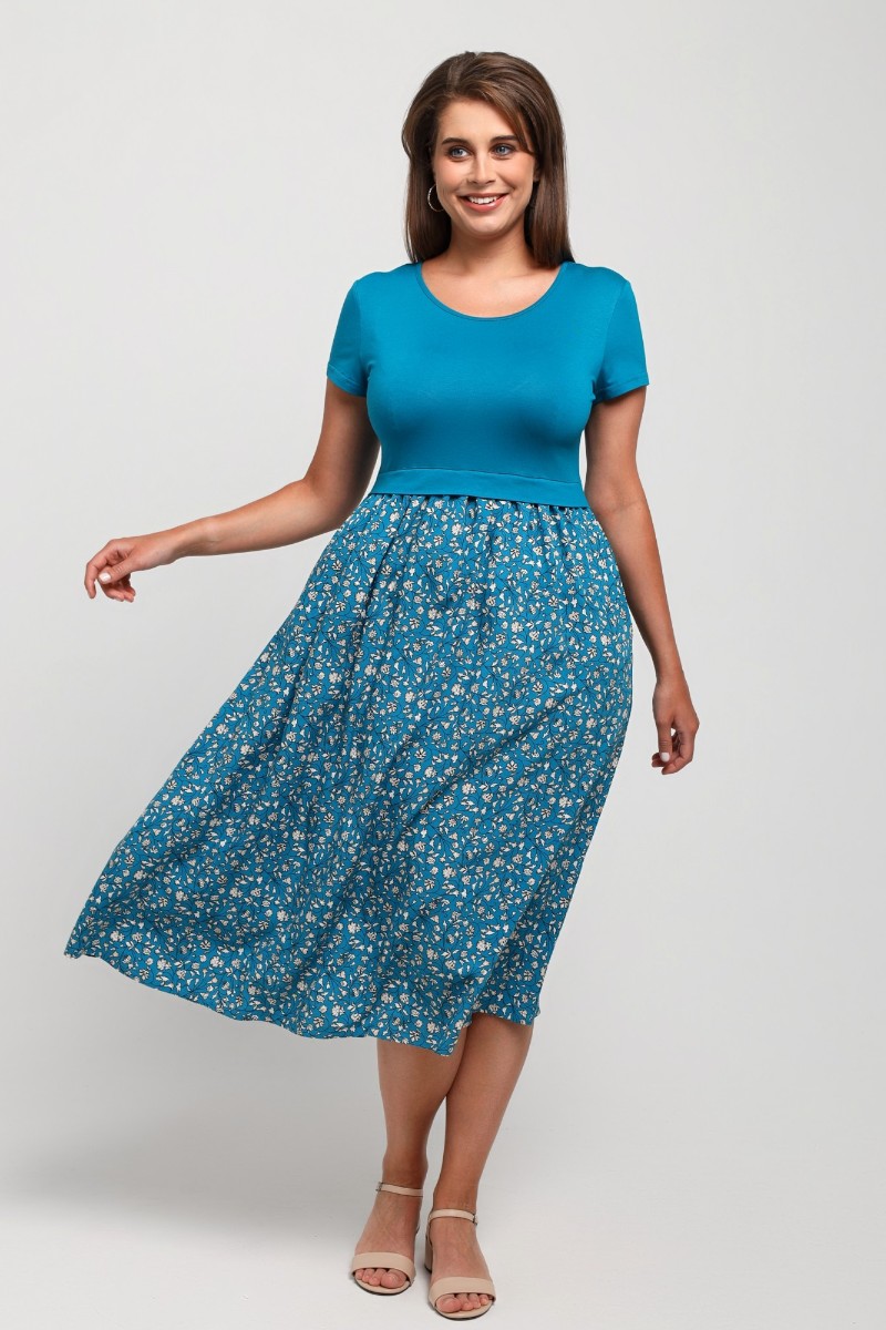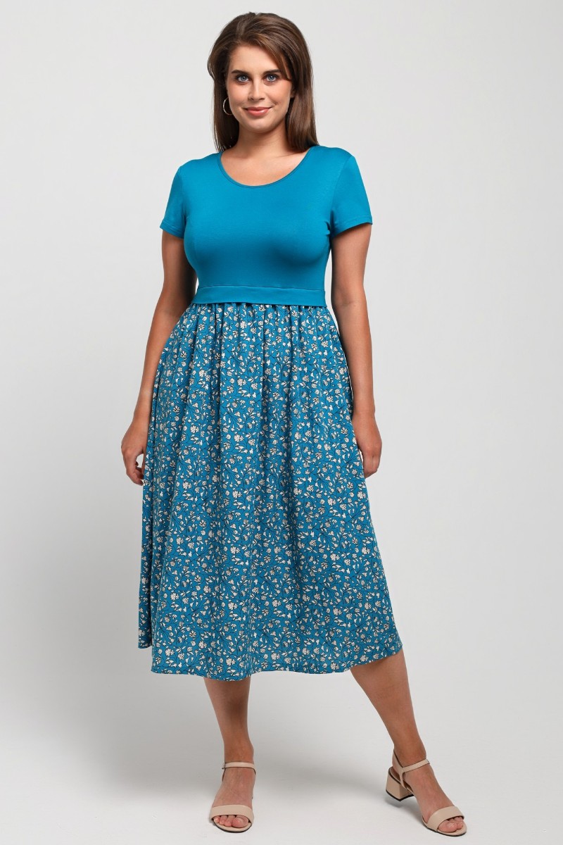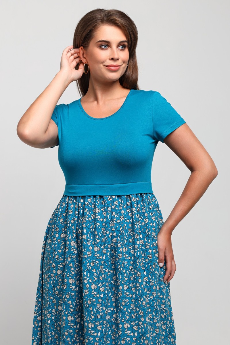 Представляем Вашему вниманию платье отрезное по талии в комбинации двух видов в единой цветовой гамме: гладкокрашеного полотна «кулирка» с лайкрой (лиф) и плательной штапельной ткани (юбка) с набивным рисунком, удлиненное, отрезное по талии, с короткими втачными рукавами, горловиной овальной формы, окантованной основным материалом и декоративной планкой в шве соединения лифа с юбкой. Юбка по шву соединения с лифом присборена.
