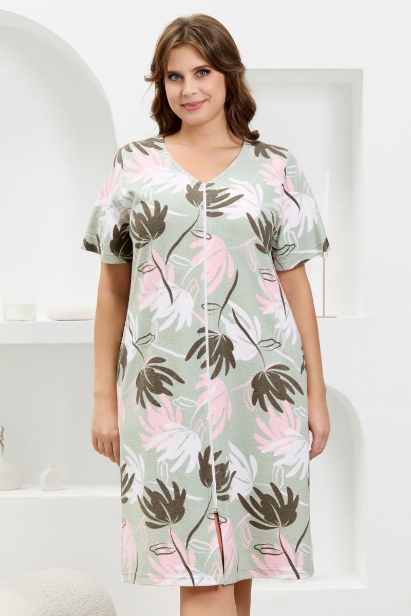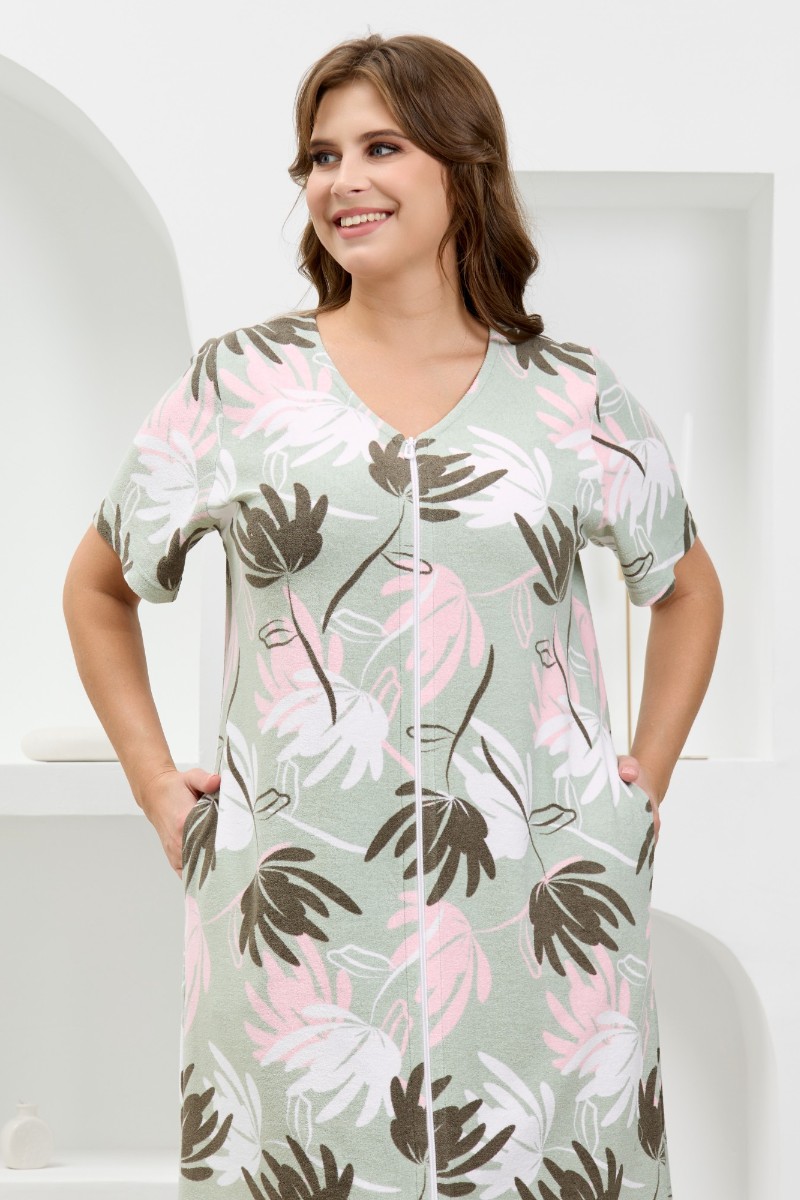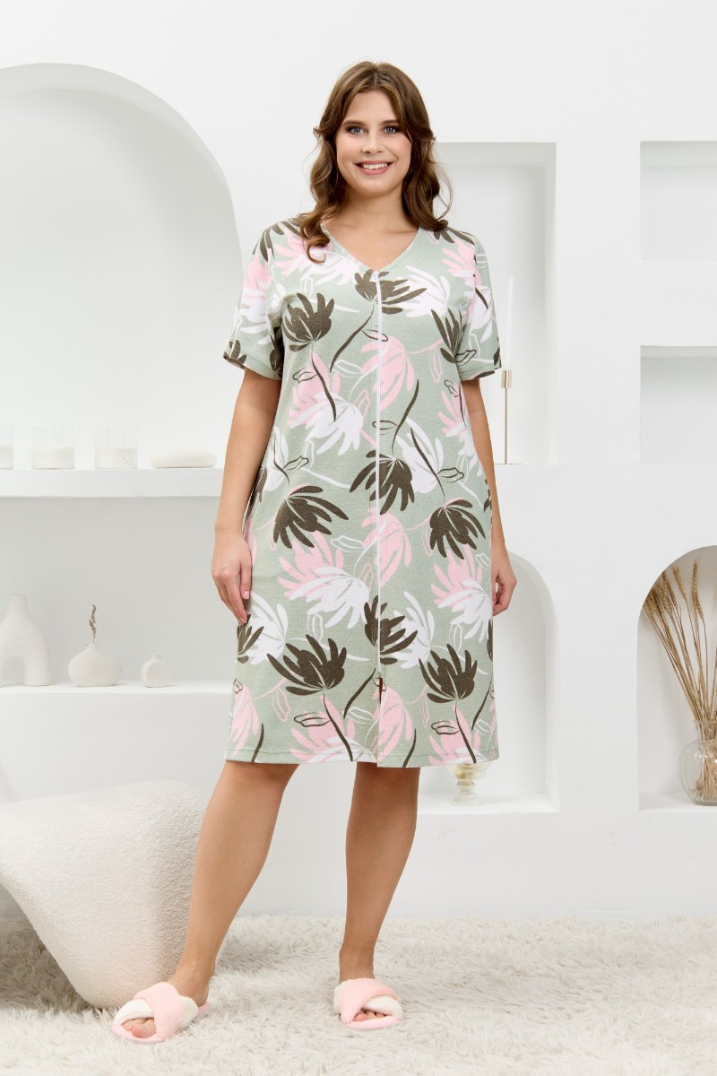 Представляем Вашему вниманию халат женский из трикотажного полотна «махра» с набивным рисунком. Изделие прямого силуэта, с короткими втачными рукавами, горловиной V- образной формы, карманами в боковых швах и центральной бортовой застежкой на тесьму «молния».