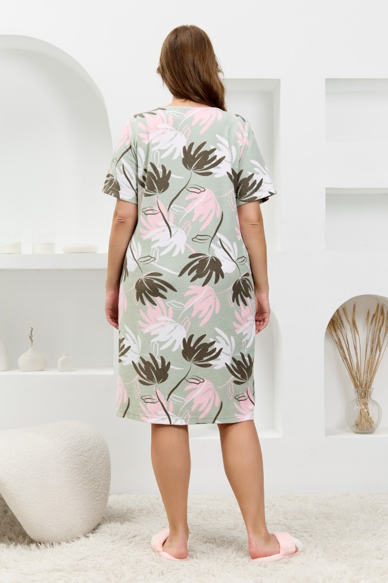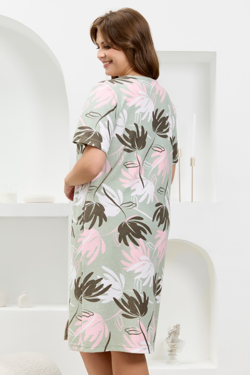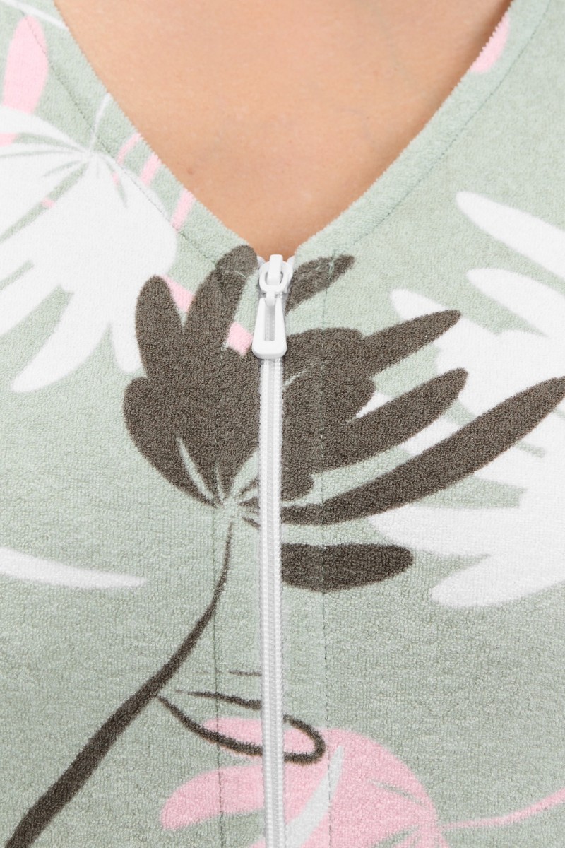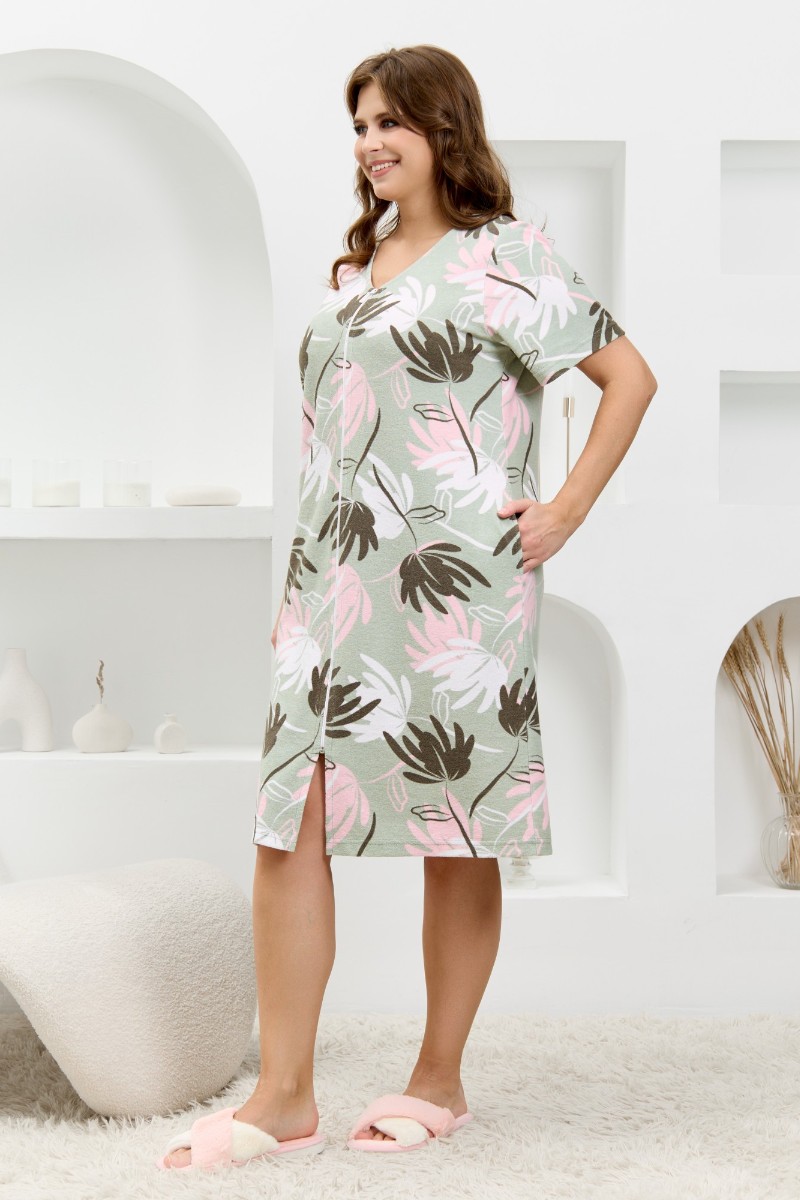 Представляем Вашему вниманию халат женский из трикотажного полотна «махра» с набивным рисунком. Изделие прямого силуэта, с короткими втачными рукавами, горловиной V- образной формы, карманами в боковых швах и центральной бортовой застежкой на тесьму «молния».