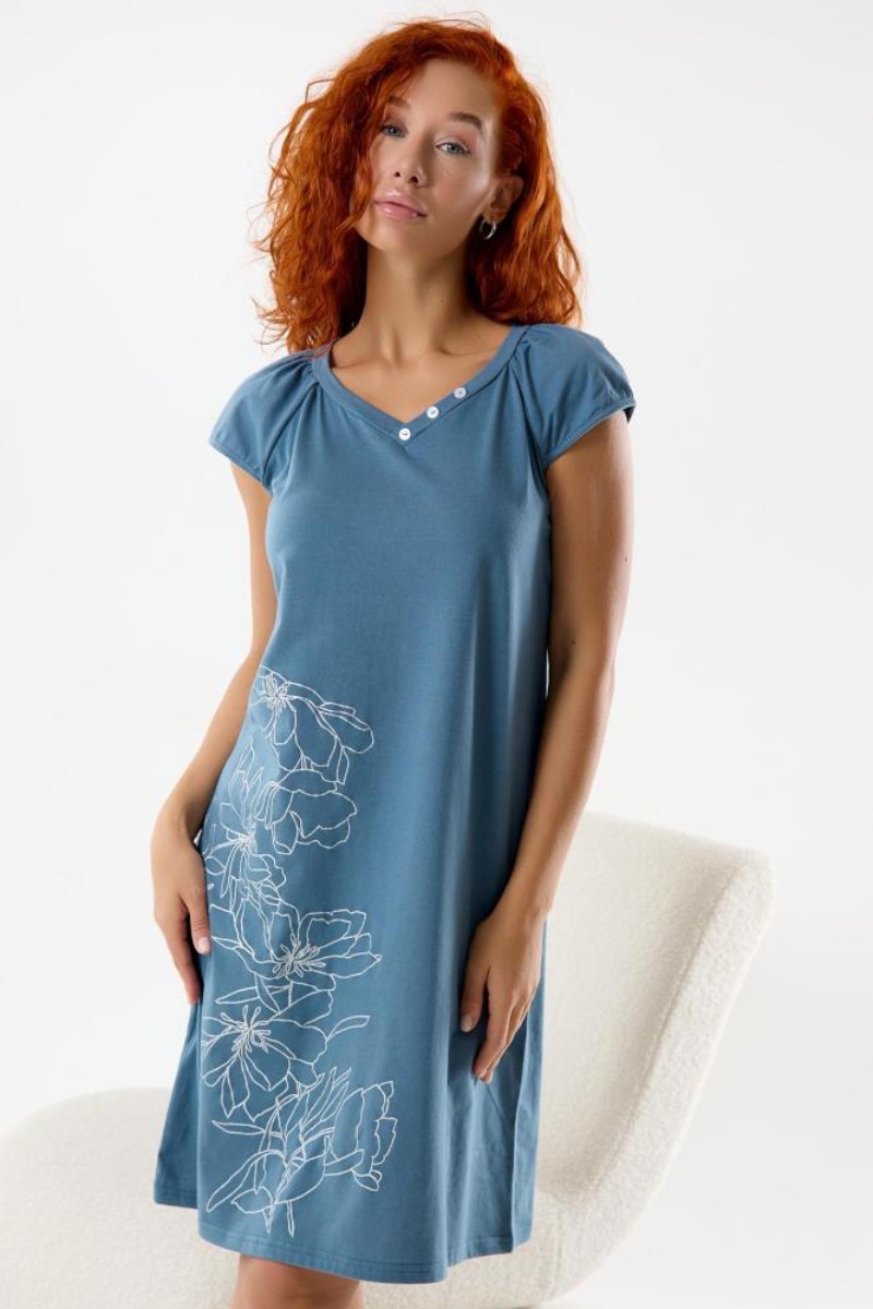 Представляем Вашему вниманию женскую ночную сорочку прямого кроя из качественного хлопкового полотна. Состав ткани и крой сорочки окунут Вас в комфортный и сладкий сон. Сорочка с коротким рукавом – реглан. Красивый V-образный вырез горловины с декоративными пуговицами. Длина сорочки до коленей. Полочку украшает крупный принт в виде цветов.