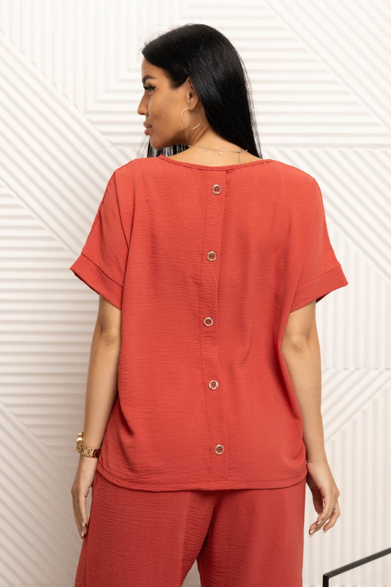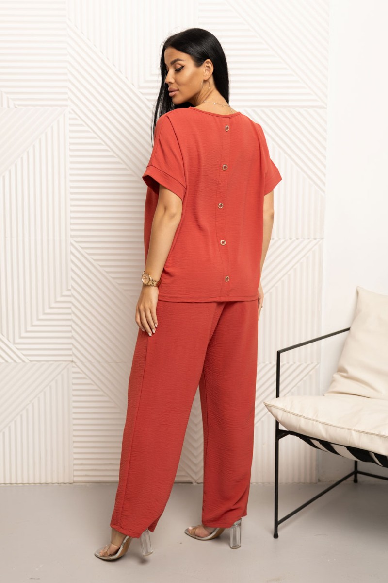 Представляем Вашему вниманию костюм женский свободного силуэта, состоящий из футболки с коротким рукавом и брюк модели - шаровары. Верх с округлым вырезом горловины и цельнокроеным рукавом с манжетой. На спинке декоративная застежка на пуговицы. Брюки с широким поясом на резинке, для надежной фиксации на уровне талии и повышенного комфорта при носке, а так же удобными карманами с отрезным бочком. Элегантная летняя модель для повседневной носки.