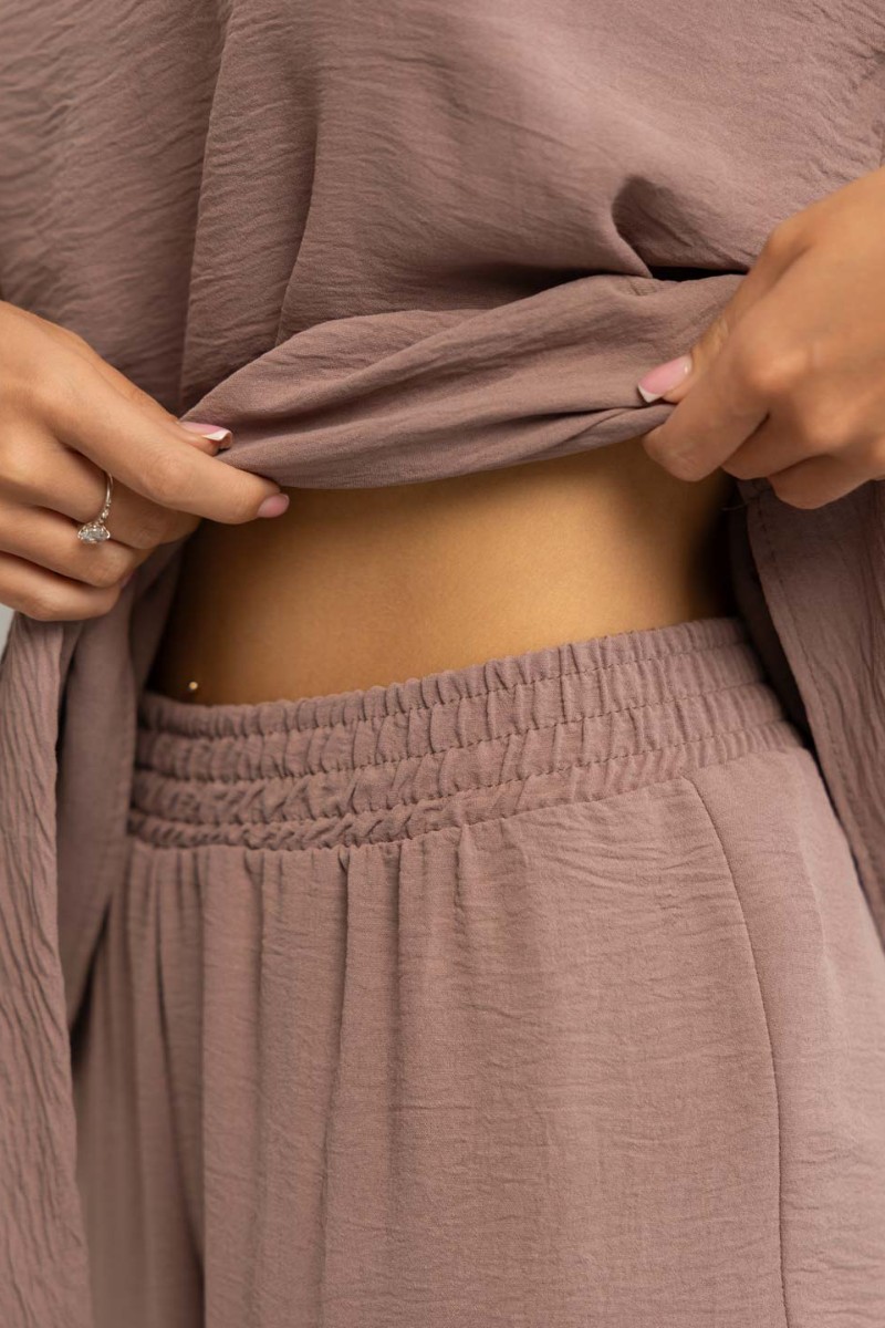 Представляем Вашему вниманию женский костюм с кофтой и брюками из легкой ткани. Костюм отлично подходит для ярких повседневных весенне-летних образов, а также можно создать праздничный образ, дополнив костюм обувью на каблуке и аксессуарами. Для кофты имеется пояс. Вещи по отдельности можно сочетать с другими элементами гардероба. Плечи спущенные. Брюки на резинке.