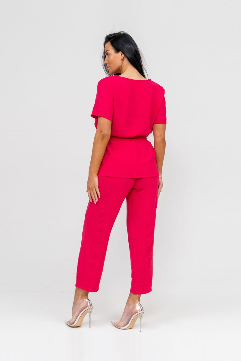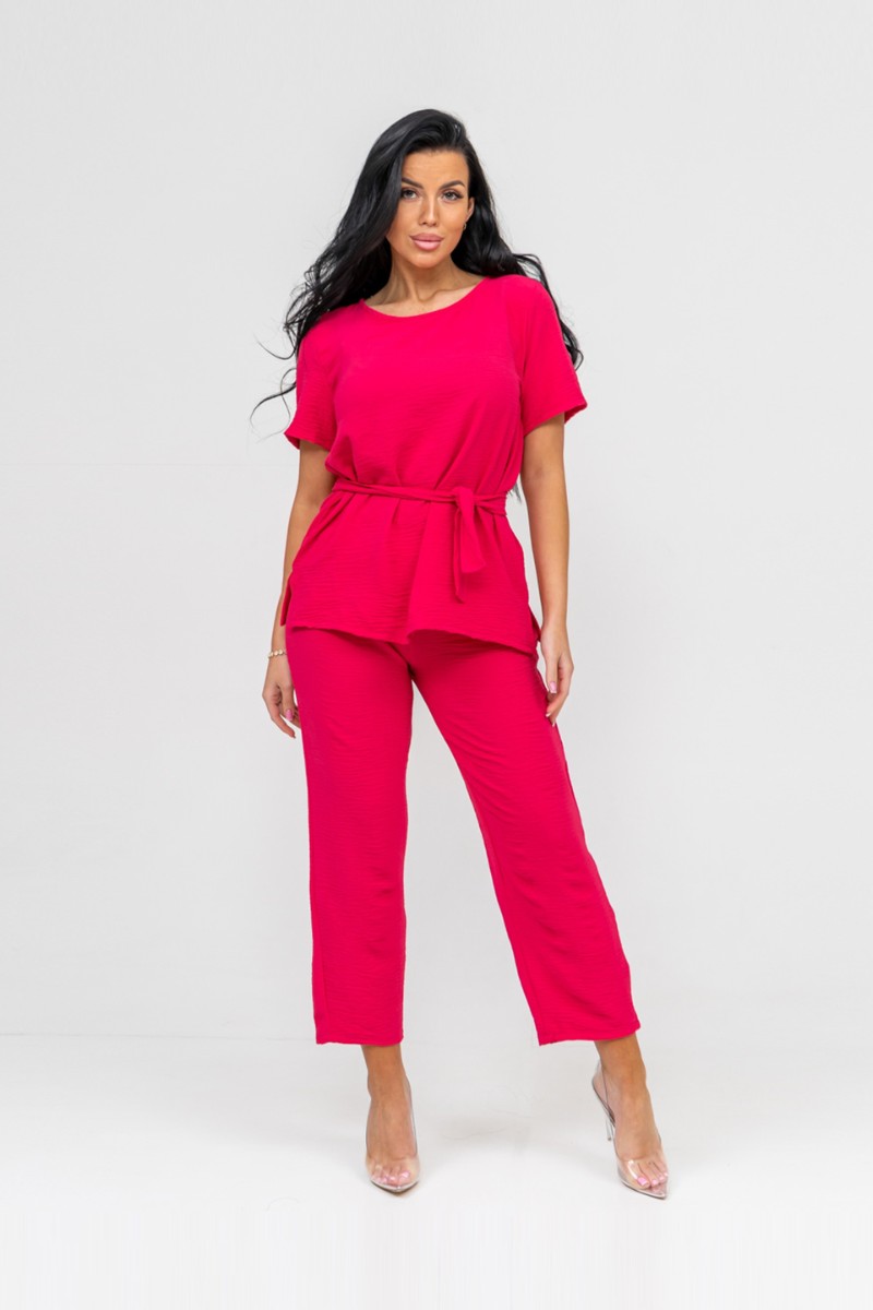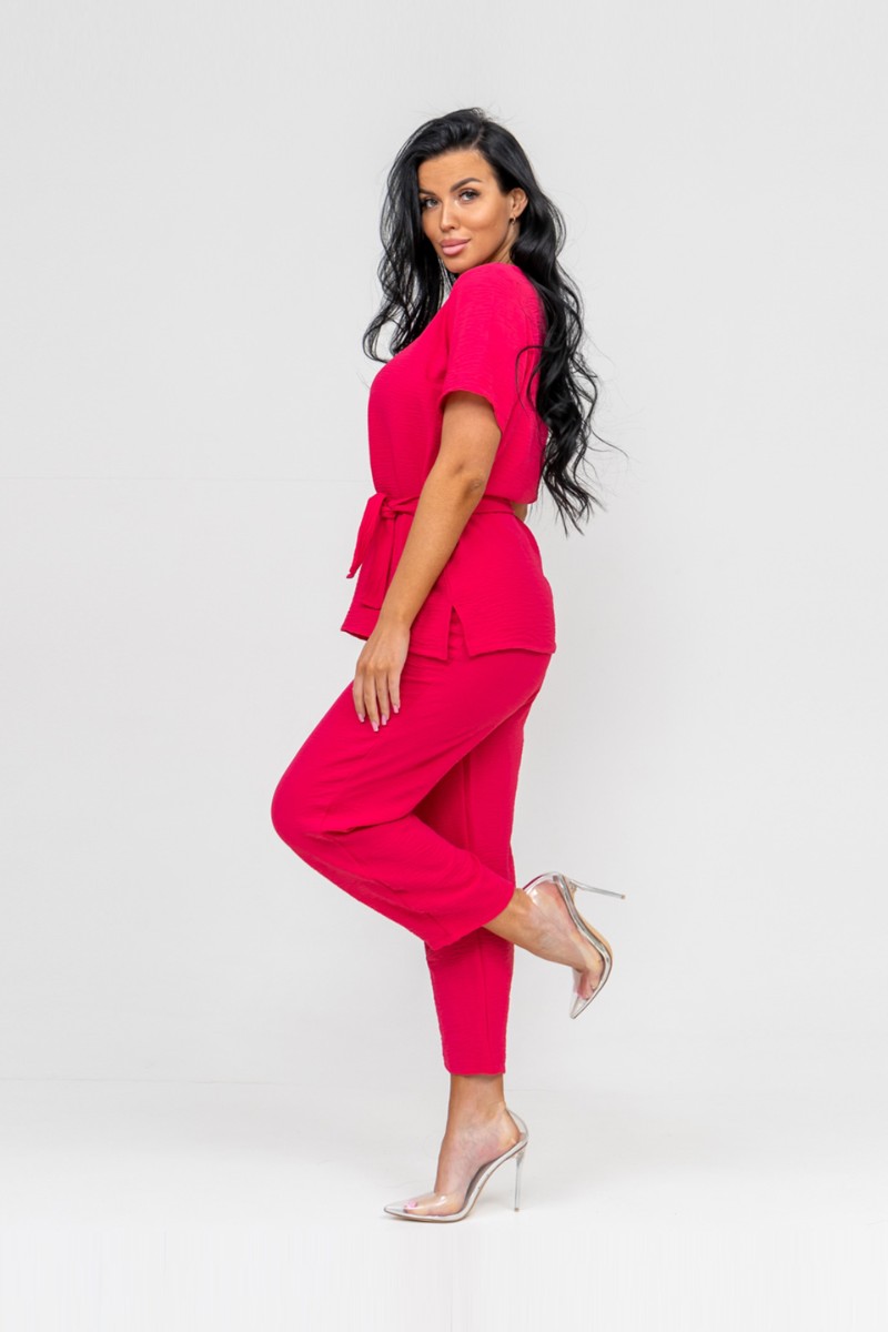 Представляем Вашему вниманию женский костюм с кофтой и брюками из легкой ткани. Костюм отлично подходит для ярких повседневных весенне-летних образов, а также можно создать праздничный образ, дополнив костюм обувью на каблуке и аксессуарами. Для кофты имеется пояс. Вещи по отдельности можно сочетать с другими элементами гардероба. Плечи спущенные. Брюки на резинке.