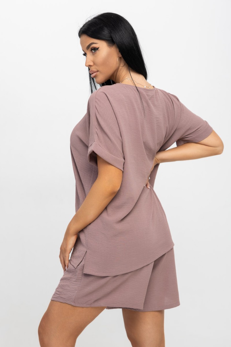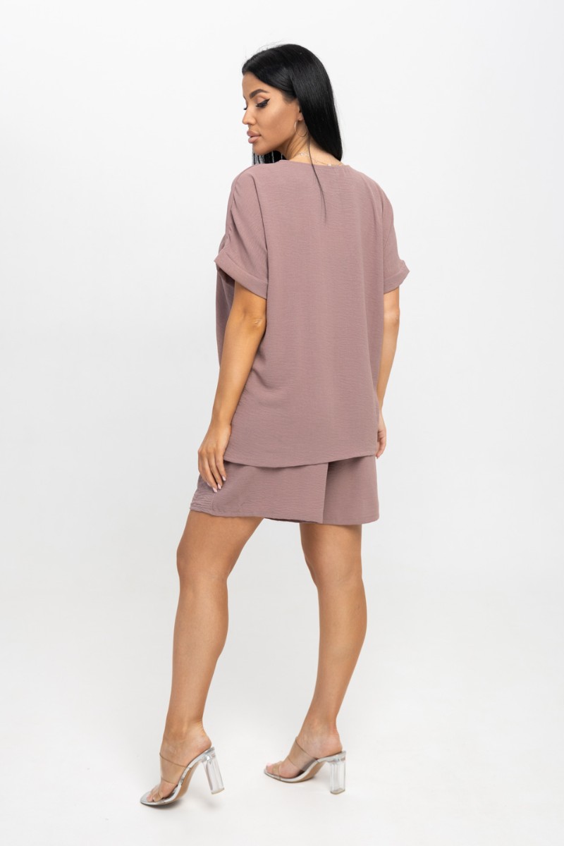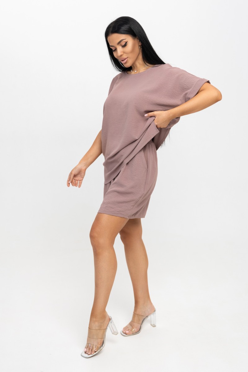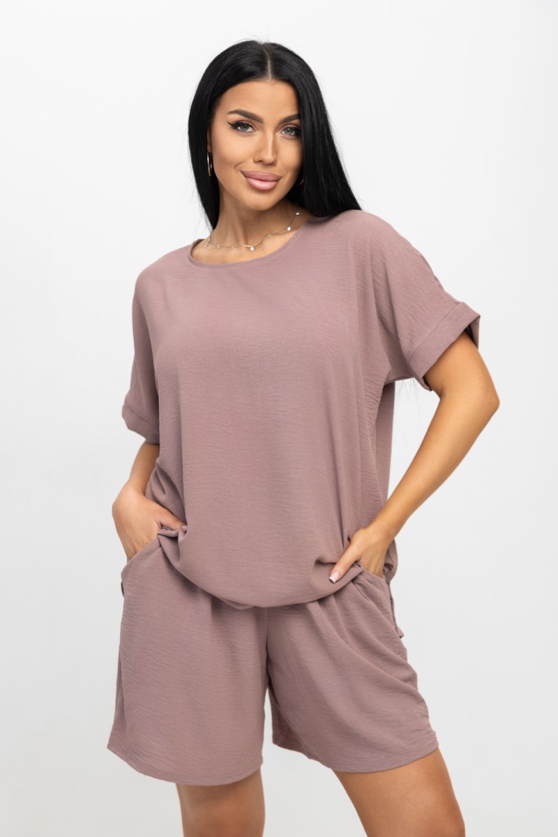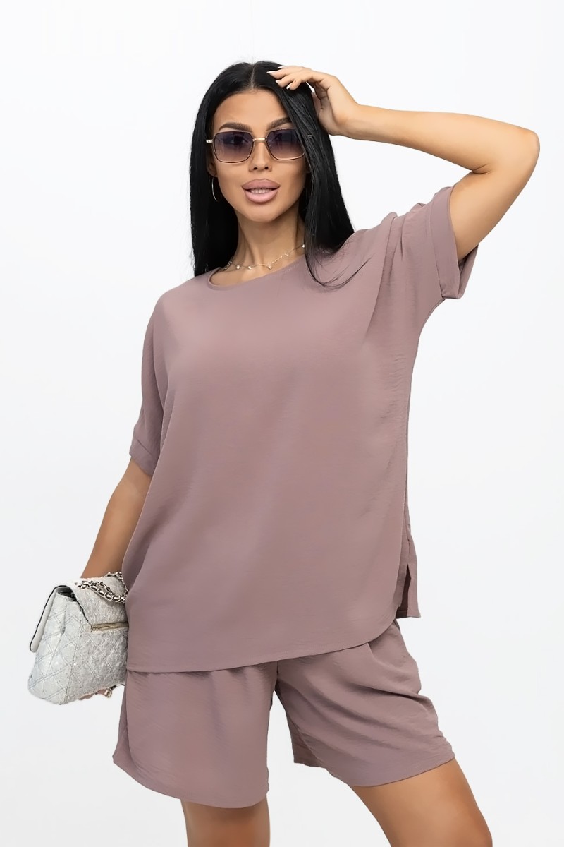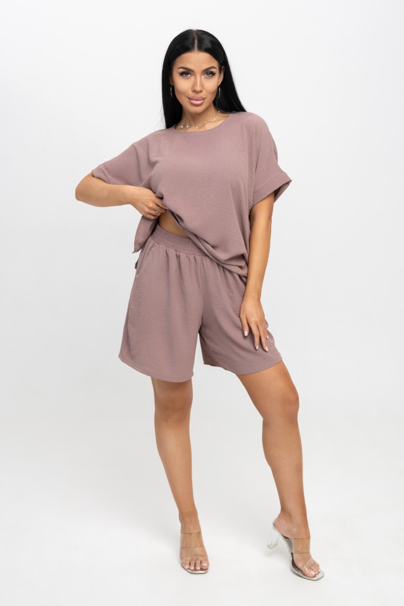 Представляем Вашему вниманию ультрамодный костюм из жатки, очень легкий, гигроскопичный материал, обеспечивающий прохладу и комфорт в жаркую погоду. Свободная футболка с цельнокроеным рукавом, манжетой по низу рукава и О-образной горловиной. Шорты свободного кроя с карманами, будут отлично смотреться как с кроссовками, так и с летними босоножками.