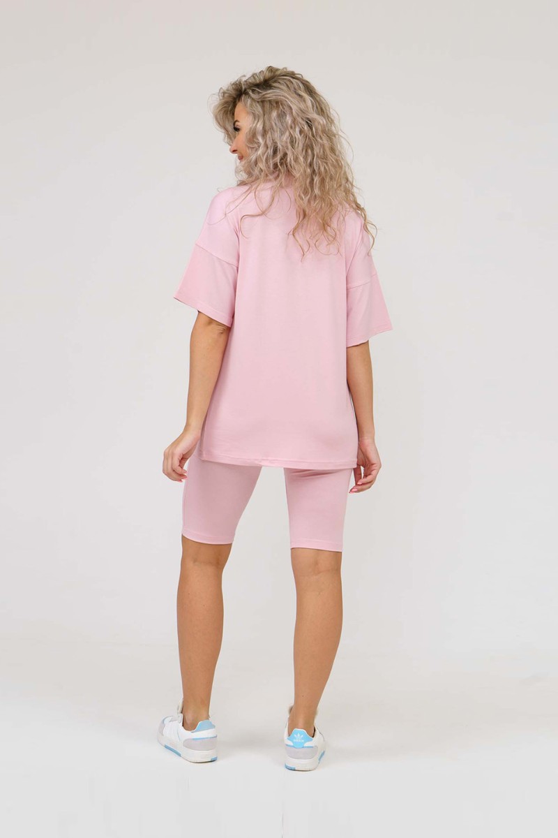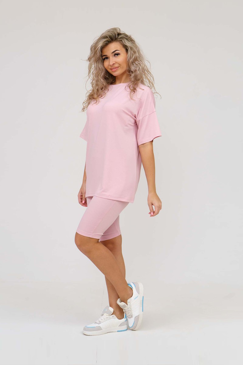 Представляем Вашему вниманию молодежный костюм из вискозы. Футболка в стиле оверсайз с О-образной горловиной, длиной до середины бедра. Велосипедки прилегающей силуэтной формы выше уровня колена.