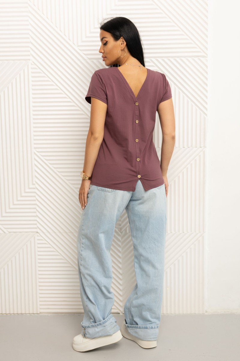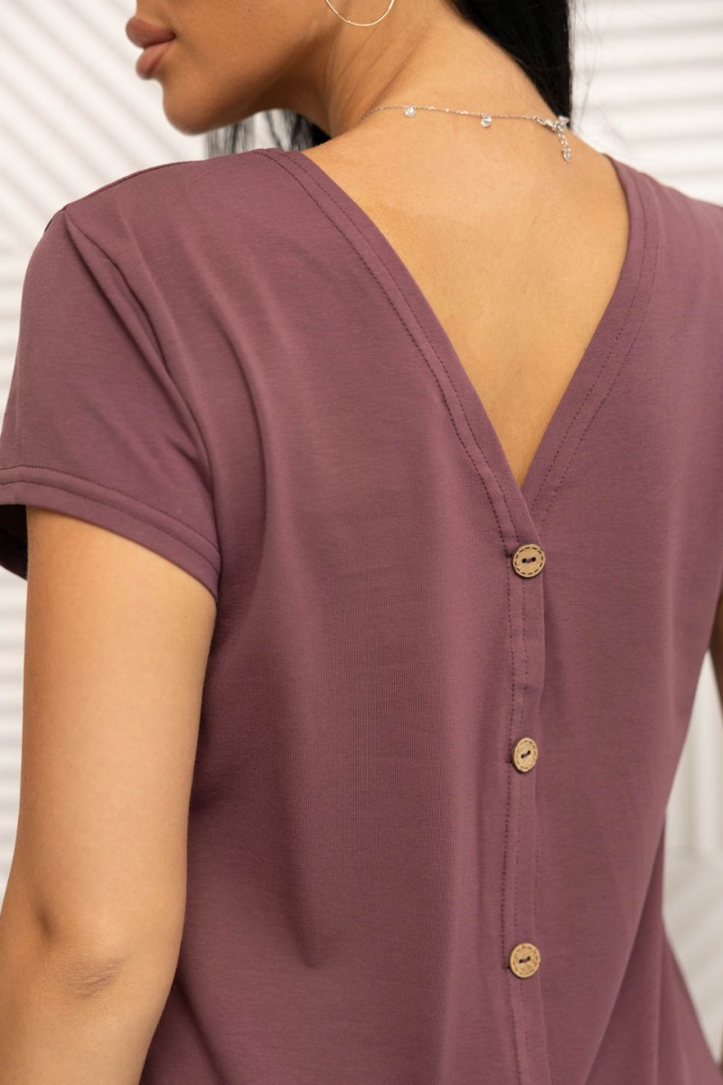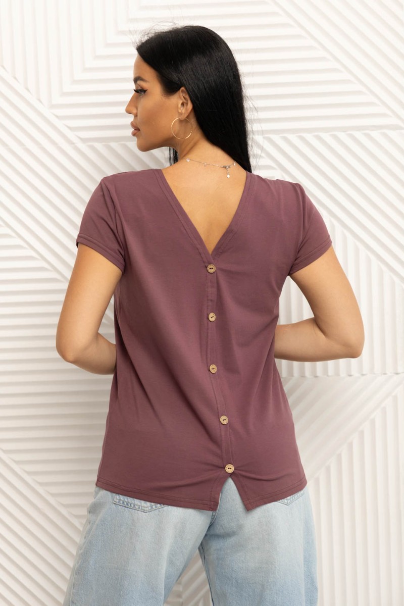 Представляем Вашему вниманию женскую футболку с оригинальным кроем, спинка выполнена на запах с фальшивой застежкой на пуговицы. Изделие представлено в нескольких базовых цветах.