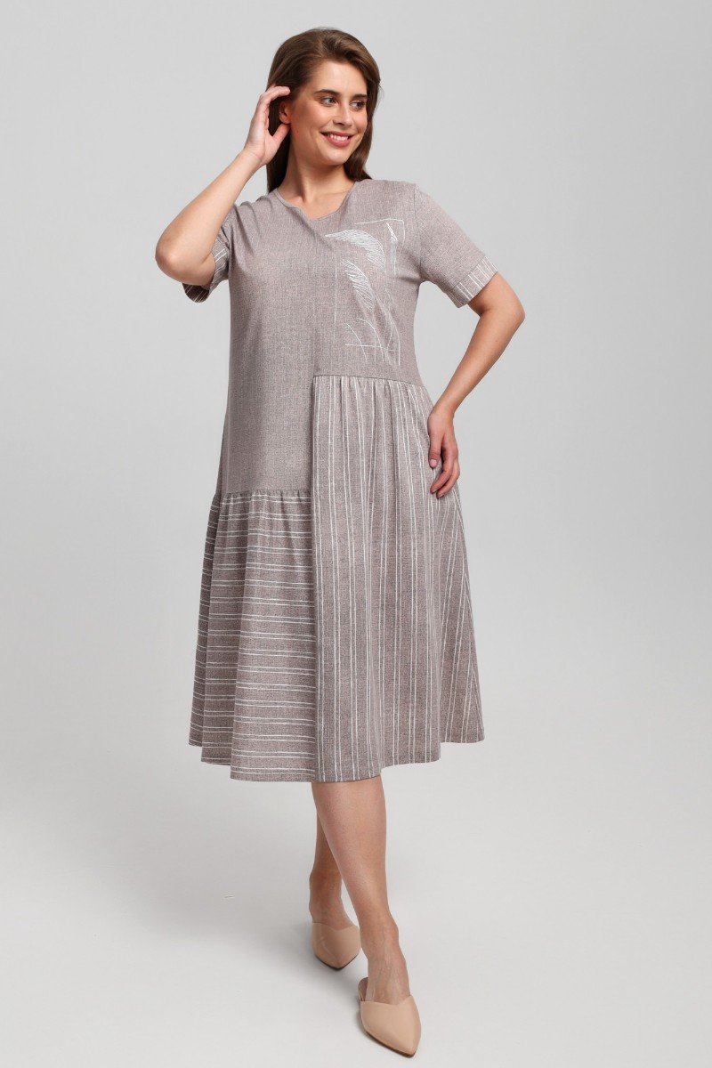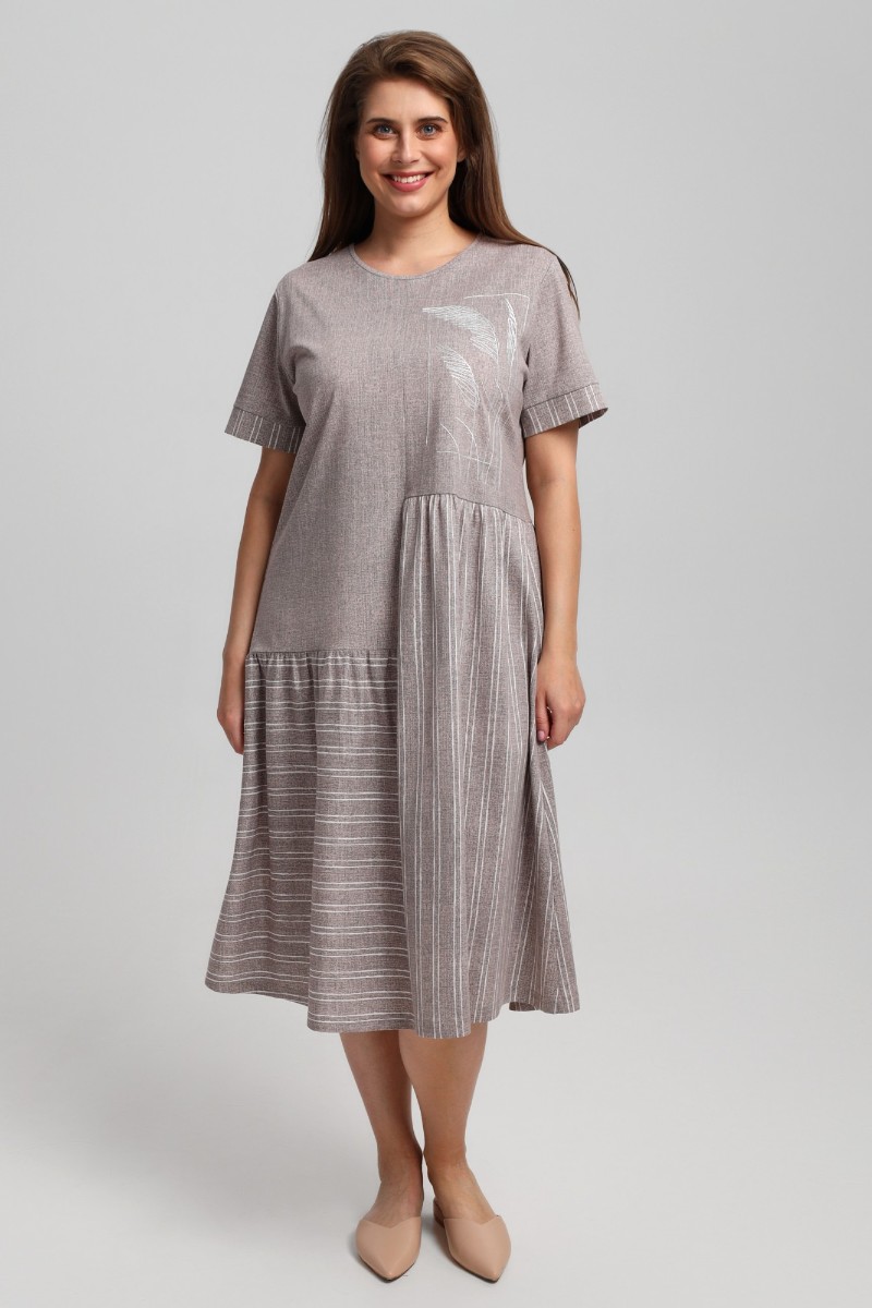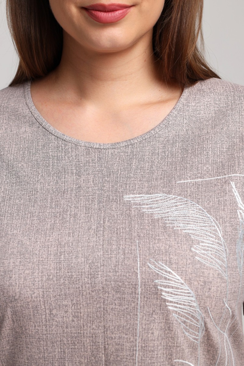 Представляем Вашему вниманию платье женское из трикотажного полотна «кулирка» с набивным рисунком в комбинации двух видов полотен в единой цветовой гамме, свободного покроя, удлиненное, с короткими втачными рукавами и горловиной овальной формы. Детали переда и спинки с центральным швом, правые и левые детали полочки и спинки отрезные по линии талии и бедер, нижние детали присборены по швам соединения с верхними. На левой полочке выполнена вышивка.