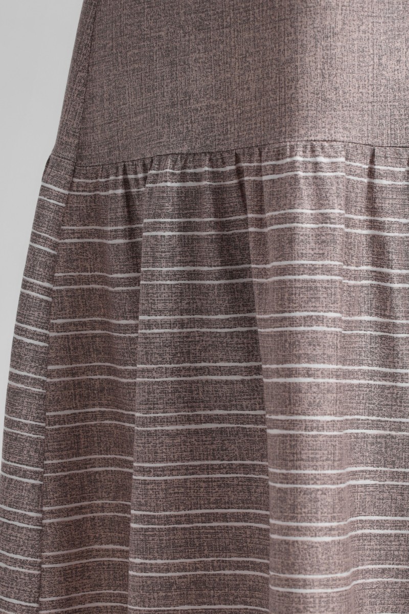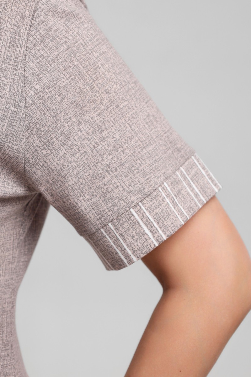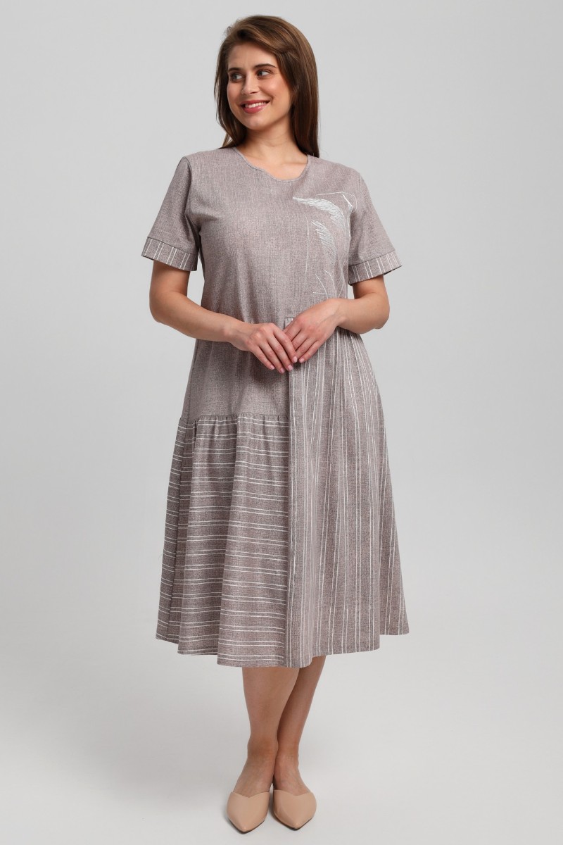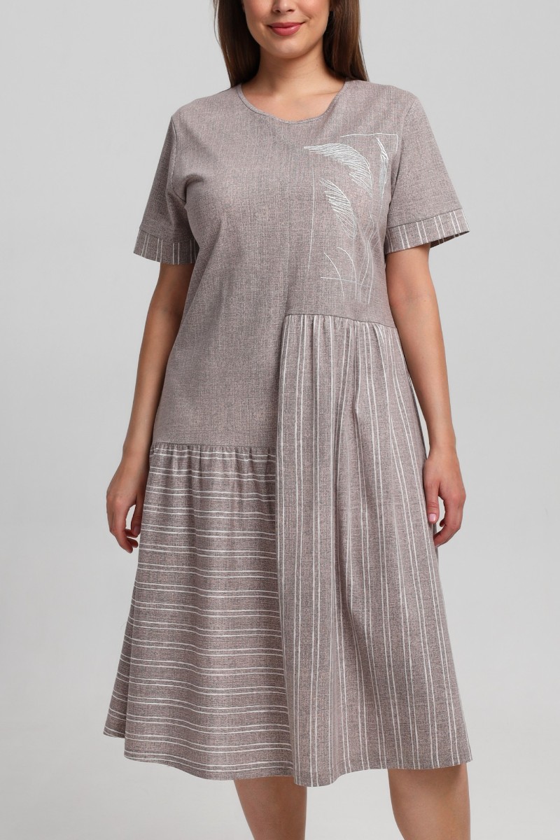 Представляем Вашему вниманию платье женское из трикотажного полотна «кулирка» с набивным рисунком в комбинации двух видов полотен в единой цветовой гамме, свободного покроя, удлиненное, с короткими втачными рукавами и горловиной овальной формы. Детали переда и спинки с центральным швом, правые и левые детали полочки и спинки отрезные по линии талии и бедер, нижние детали присборены по швам соединения с верхними. На левой полочке выполнена вышивка.