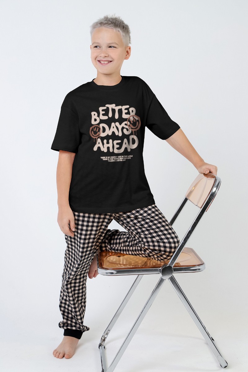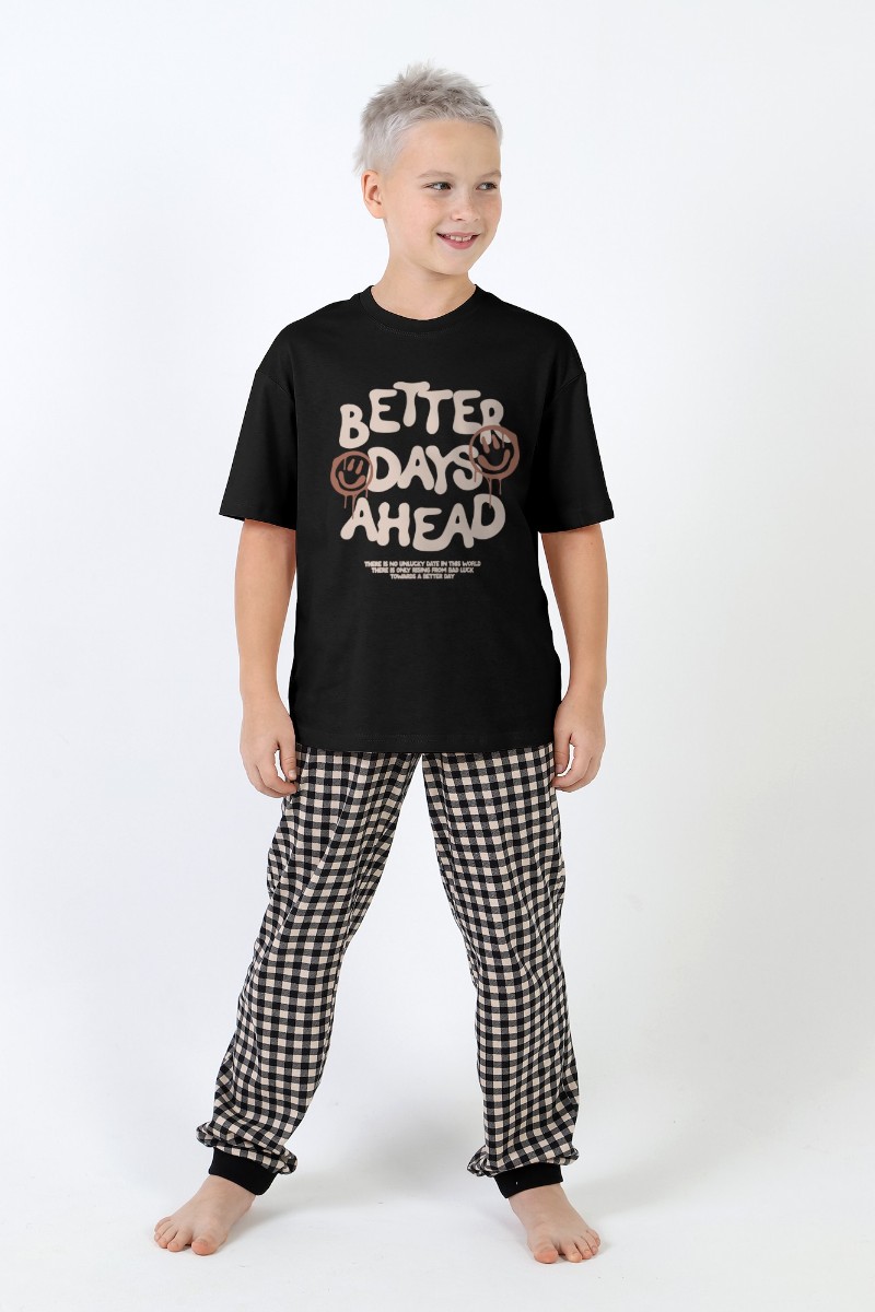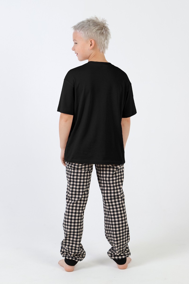 Представляем Вашему вниманию пижаму для мальчика, состоящую из футболки и брюк. Футболка - из гладкокрашеного трикотажного полотна "кулирка", классического покроя: с короткими втачными рукавами, горловиной овальной формы, обработанной втачной планкой и принтом в центре переда, выполненным в технике шелкографии. Брюки - из трикотажного полотна "кулирка" в клетку, длинные, с эластичной тесьмой на поясе и притачными манжетами из полотна "кашкорсе" черного цвета.