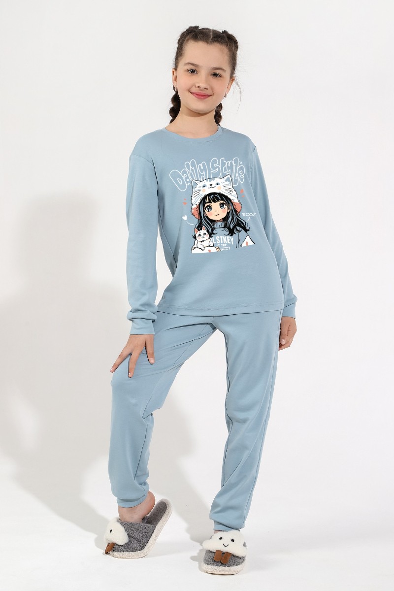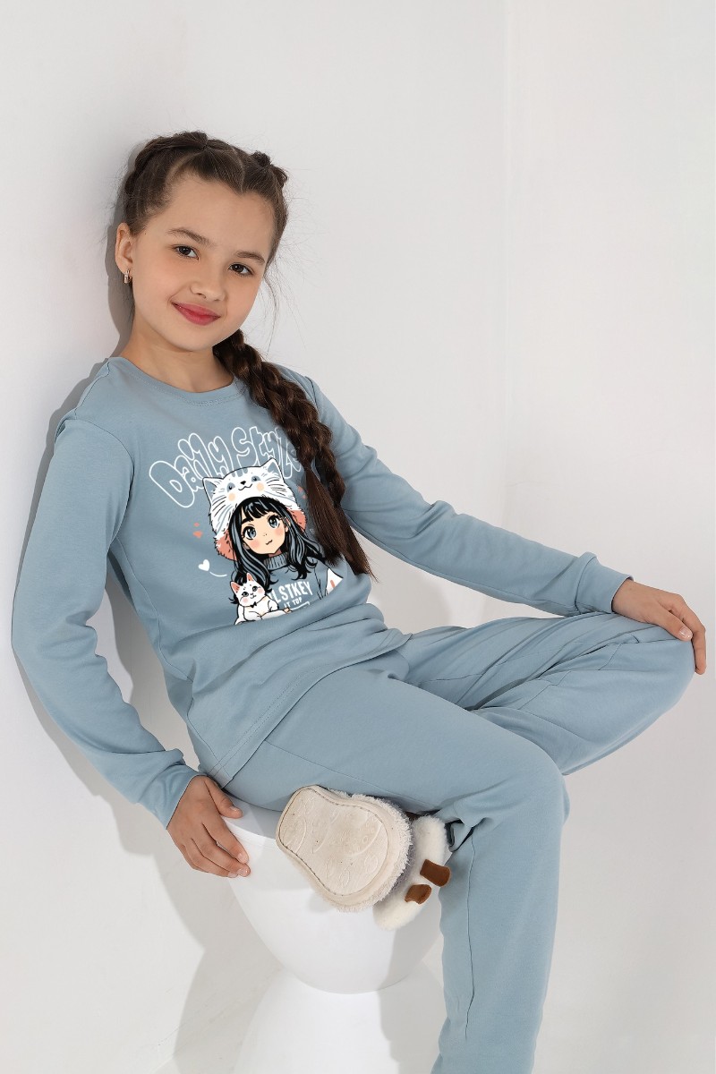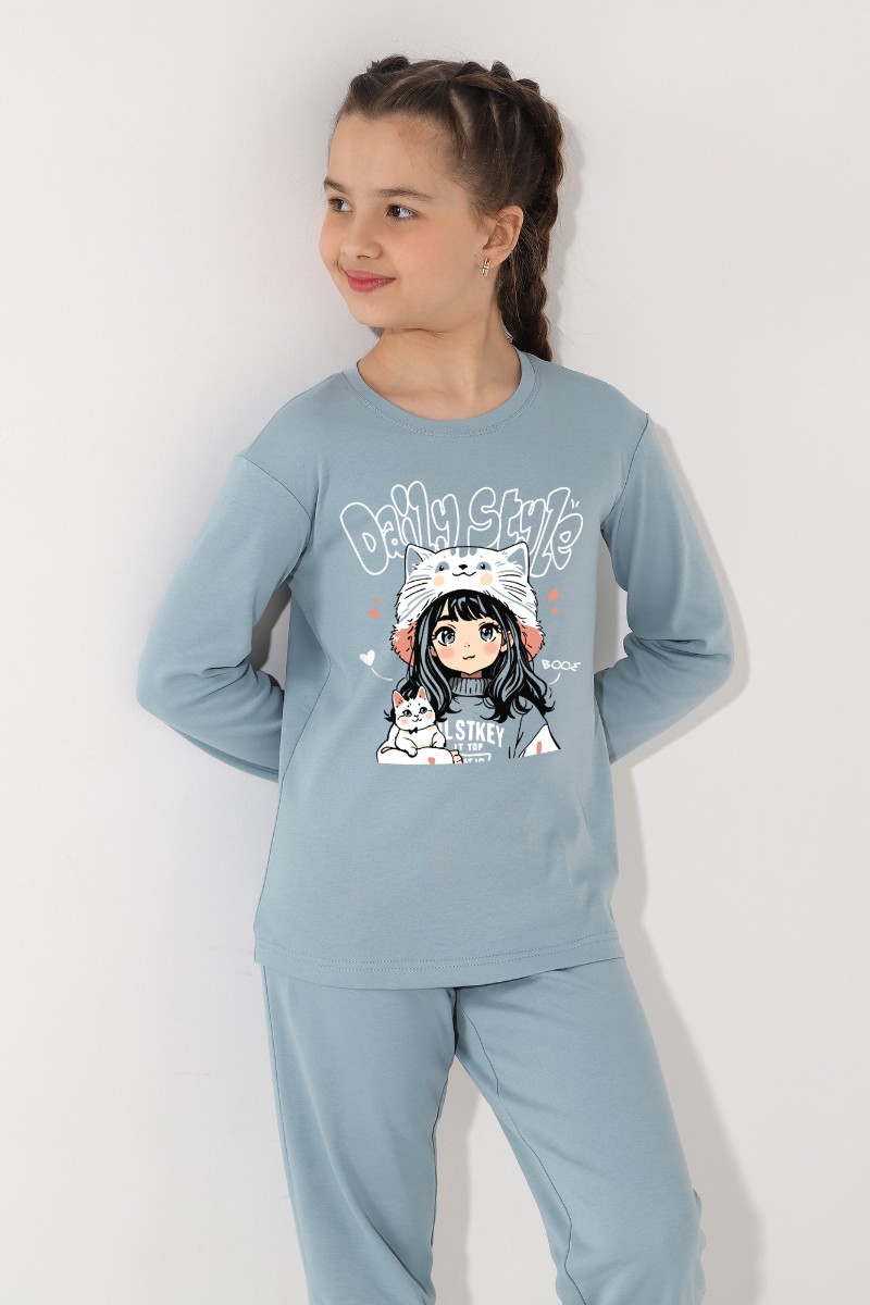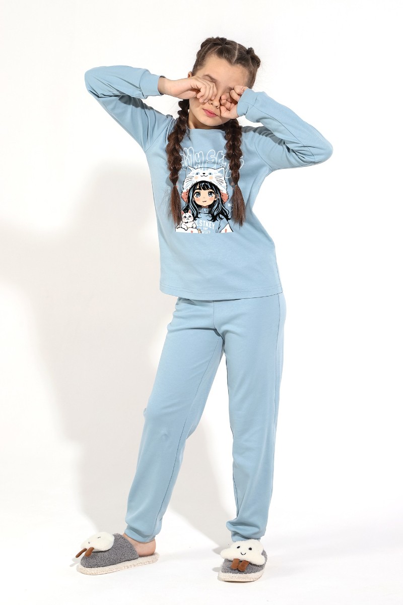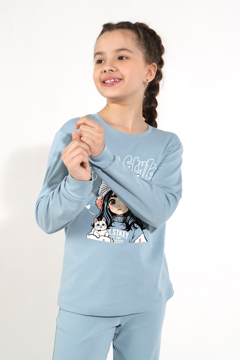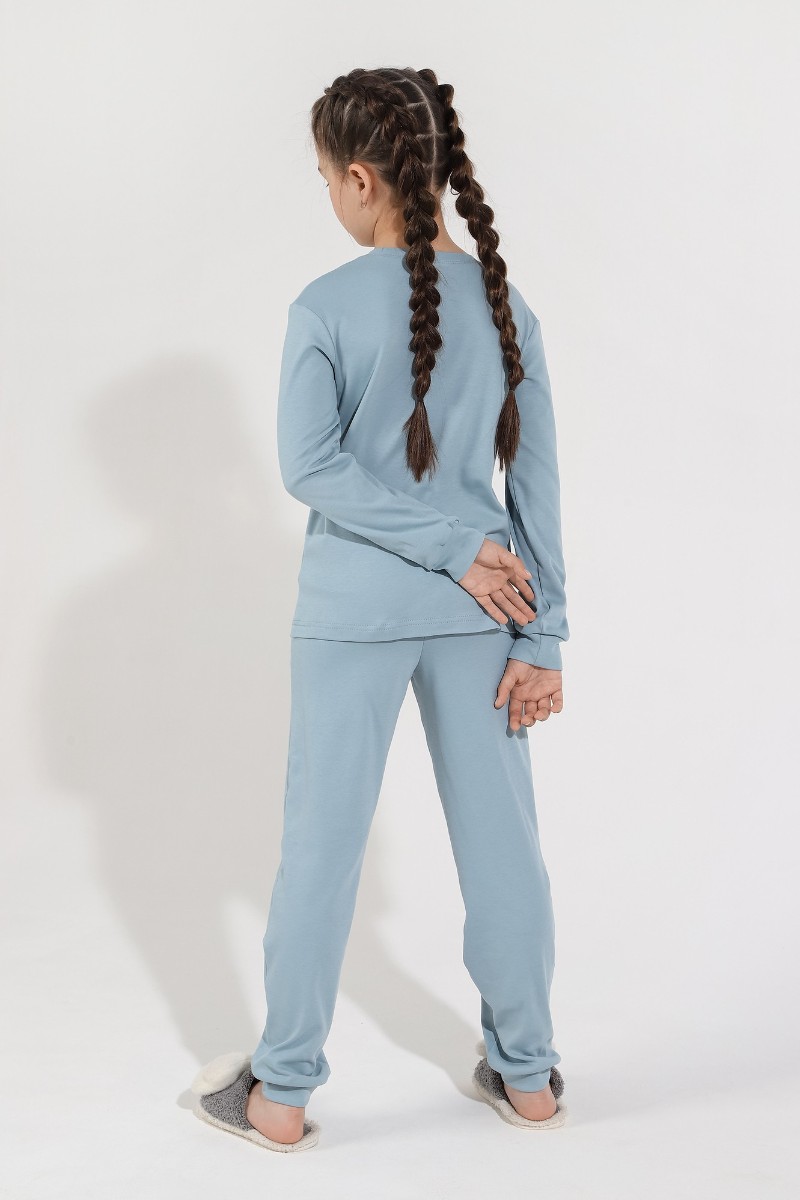Представляем Вашему вниманию пижаму из интерлока для девочки, состоящую из джемпера и брюк. Джемпер со слегка спущенной линией плеч, с принтом на переде. Низ рукавов и брючек на манжетах.