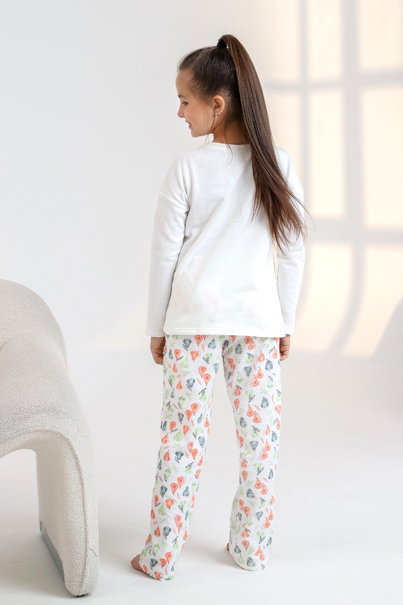 Представляем Вашему вниманию теплую детскую пижаму. Джемпер однотонный, с принтом, спущенной линией плеч, длинными рукавами. Брюки на эластичной тесьме по линии талии.