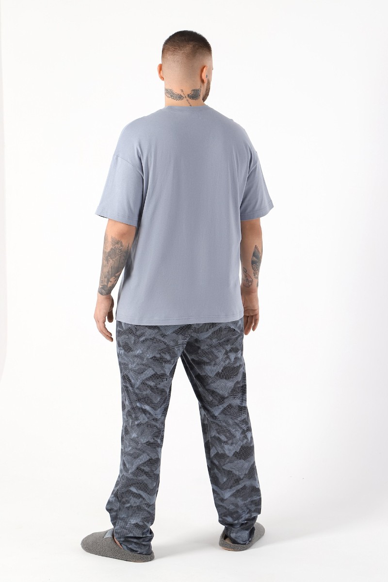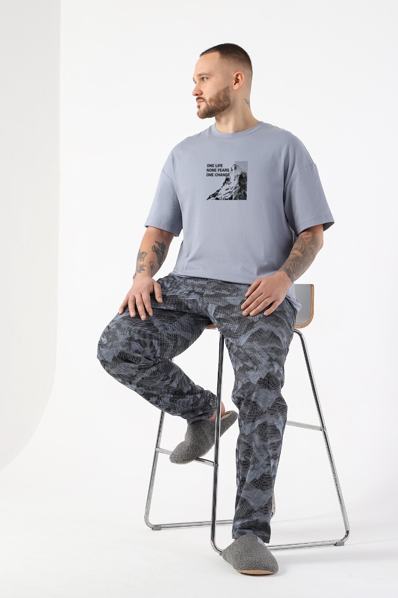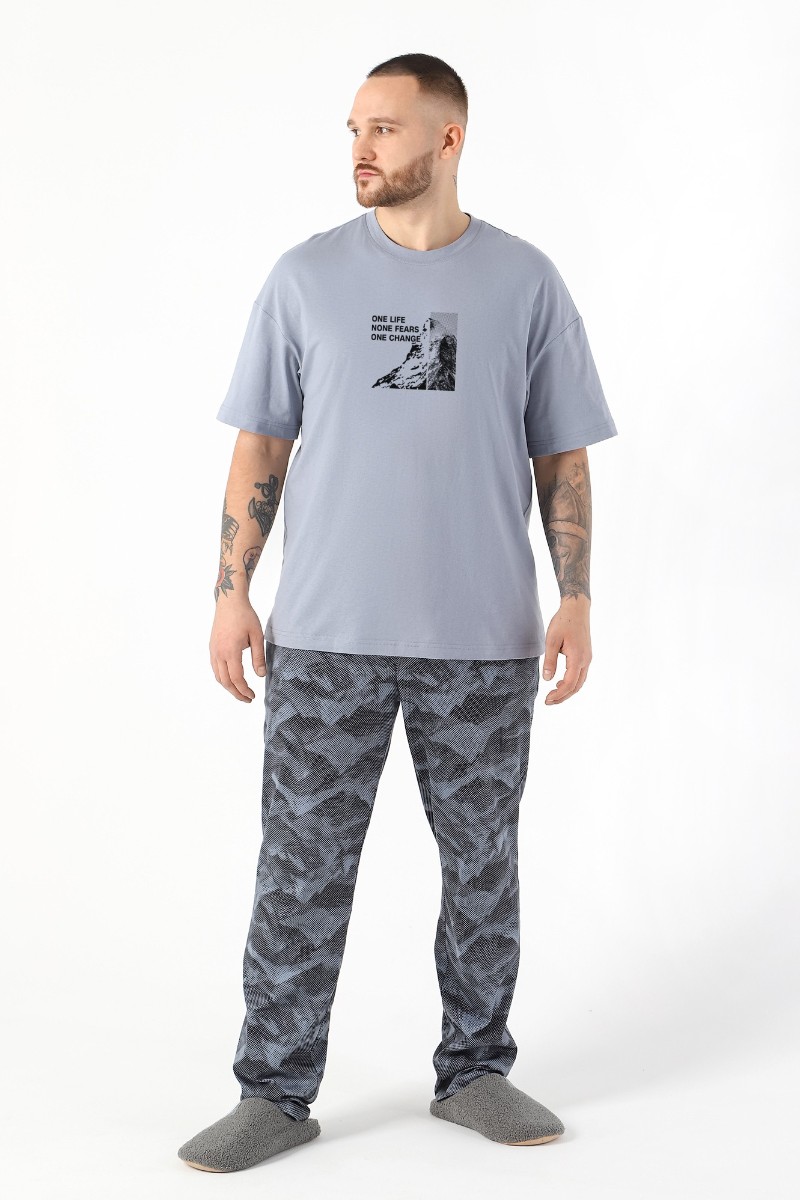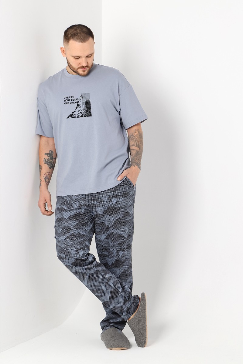 Представляем Вашему вниманию костюм мужской из трикотажного полотна "кулирка" в комбинации двух видов , состоящий из футболки и брюк. Футболка - из гладкокрашеного полотна, свободного покроя, со спущенным плечом, короткими втачными рукавами, горловиной овальной формы, обработанной втачной планкой, и принтом в центре переда. По шву втачивания планки настрочена двойная отделочная строчка. Брюки - из полотна с набивным рисунком, на притачном поясе с эластичной тесьмой внутри, с карманами в боковых швах. Входы в карманы окантованы основным материалом.