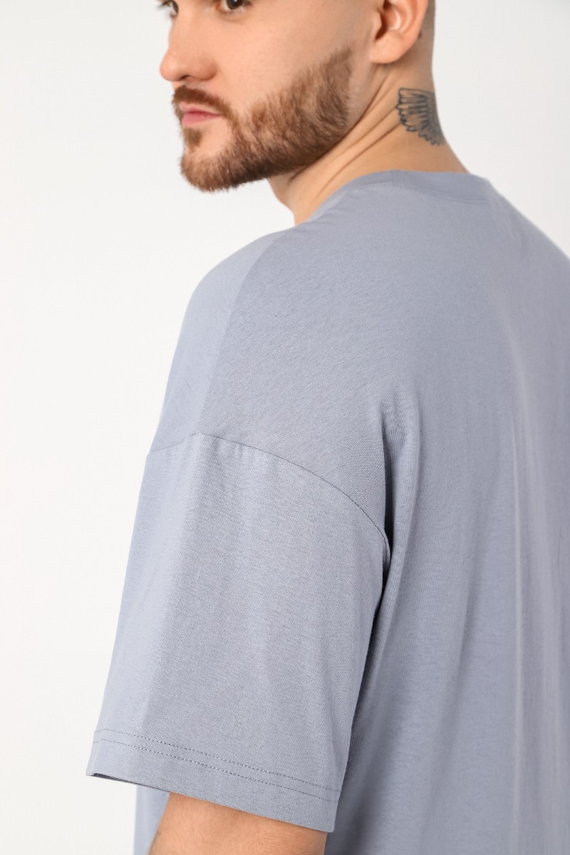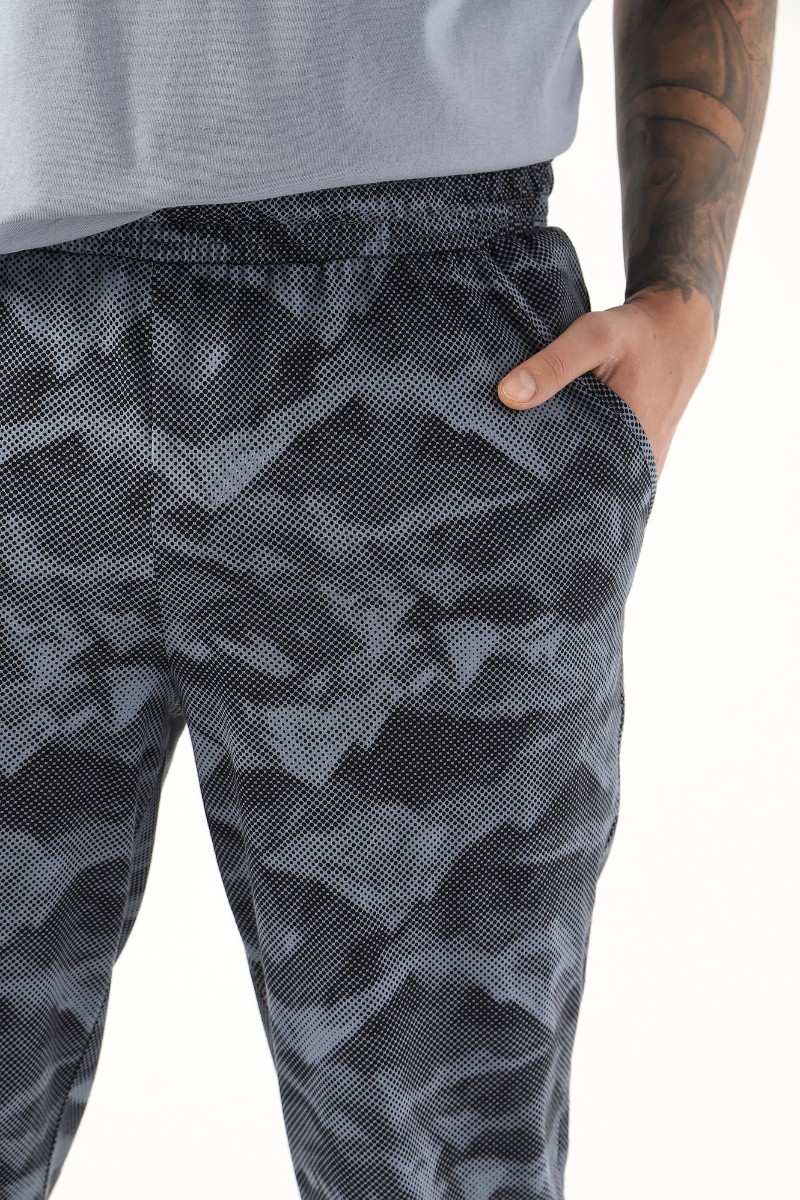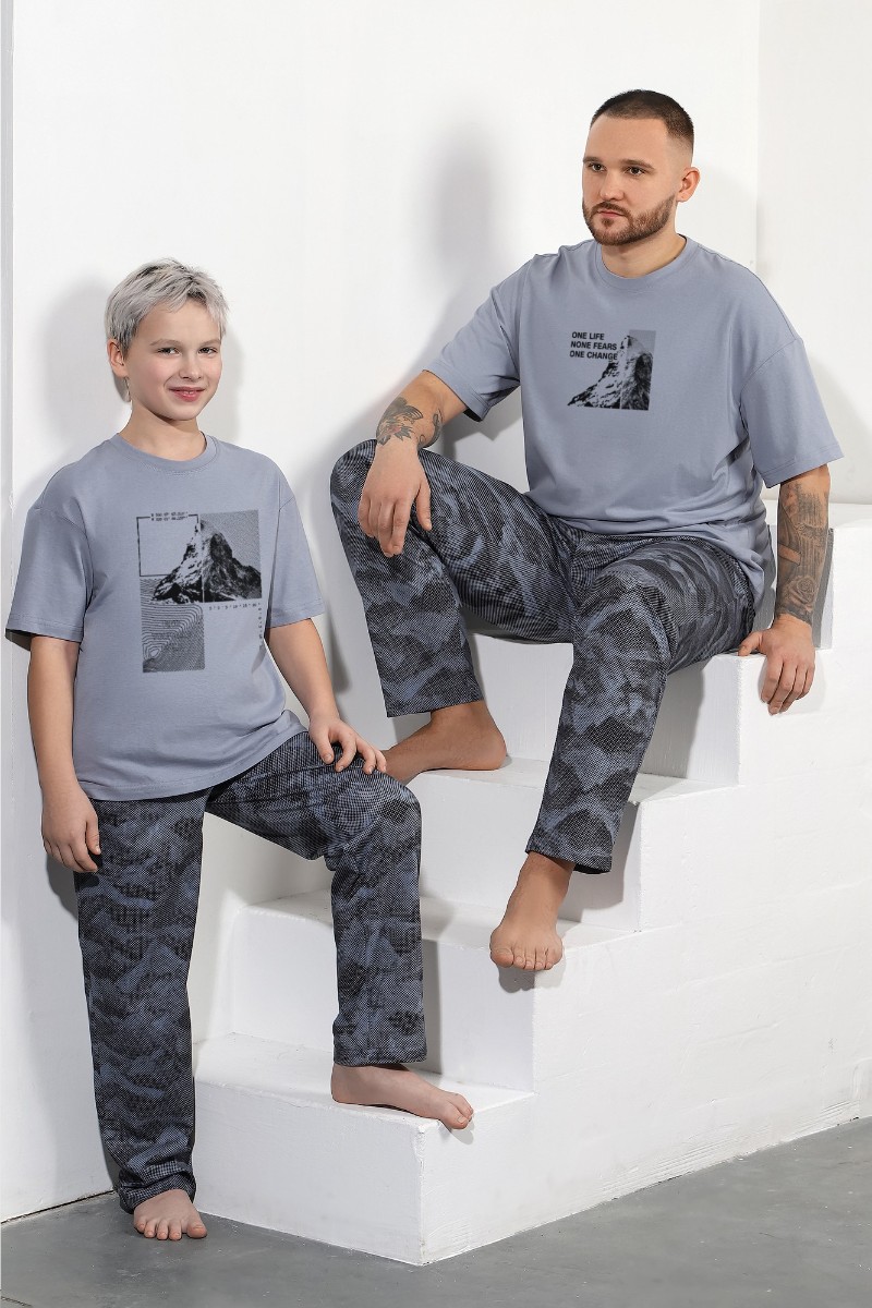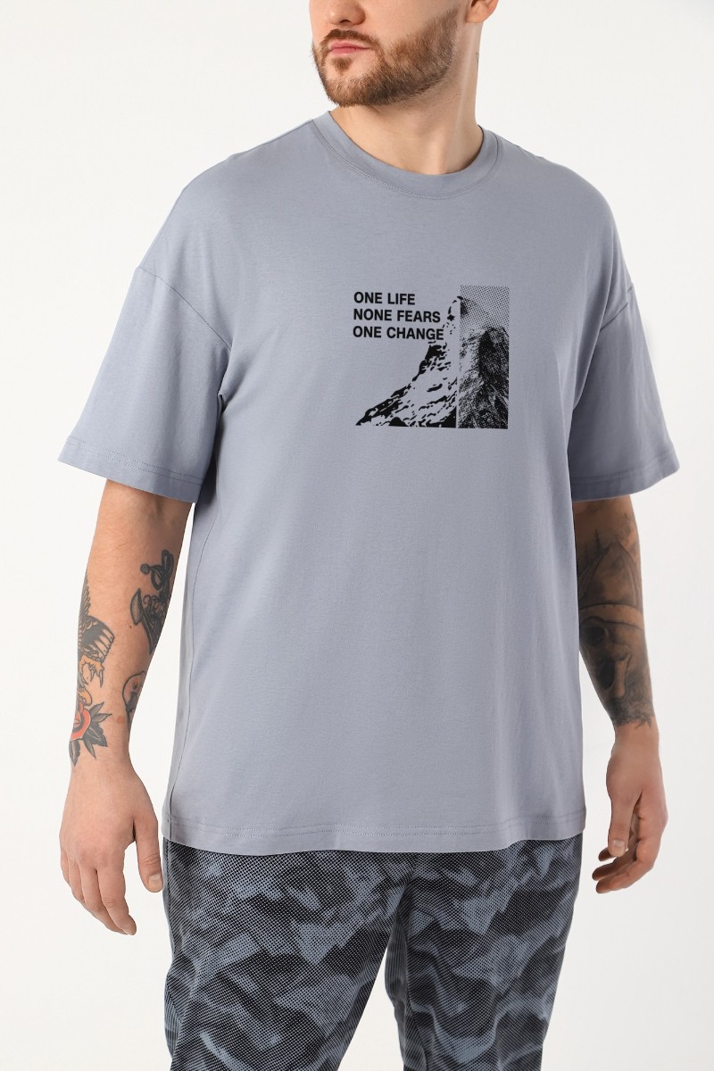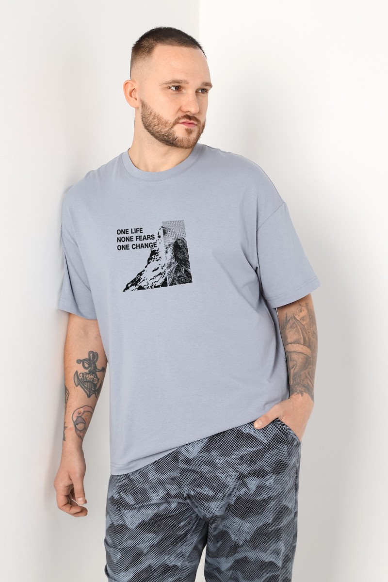 Представляем Вашему вниманию костюм мужской из трикотажного полотна "кулирка" в комбинации двух видов , состоящий из футболки и брюк. Футболка - из гладкокрашеного полотна, свободного покроя, со спущенным плечом, короткими втачными рукавами, горловиной овальной формы, обработанной втачной планкой, и принтом в центре переда. По шву втачивания планки настрочена двойная отделочная строчка. Брюки - из полотна с набивным рисунком, на притачном поясе с эластичной тесьмой внутри, с карманами в боковых швах. Входы в карманы окантованы основным материалом.