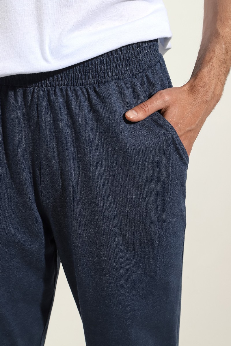 Представляем Вашему вниманию брюки мужские из меланжированного трикотажного полотна "кулирка", прямого силуэта, с карманами в боковых швах, на притачном поясе с эластичной тесьмой внутри. В центре пояса - две обметанные петли , через которые продет шнурок для регулирования степени прилегания шорт по талии.