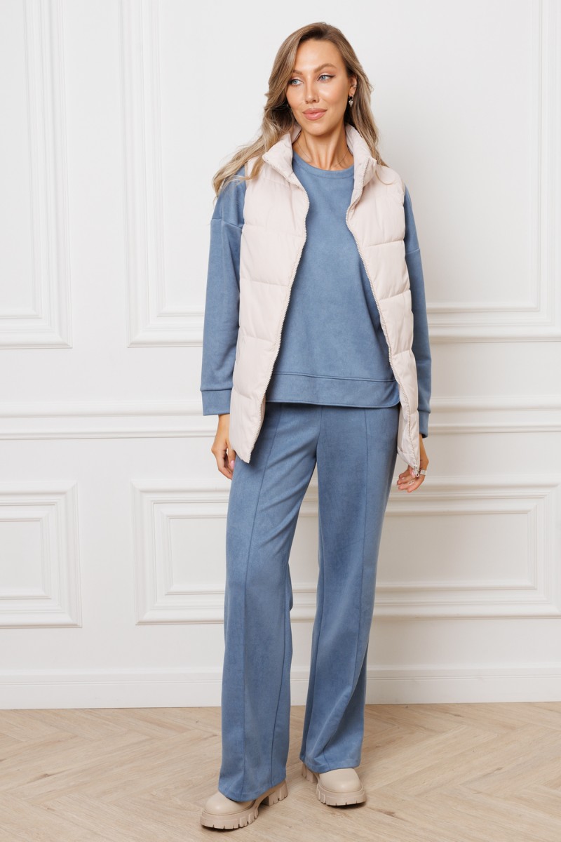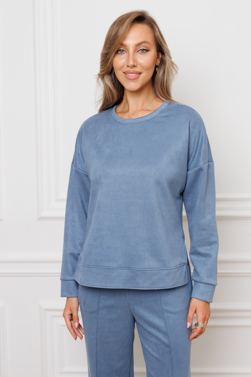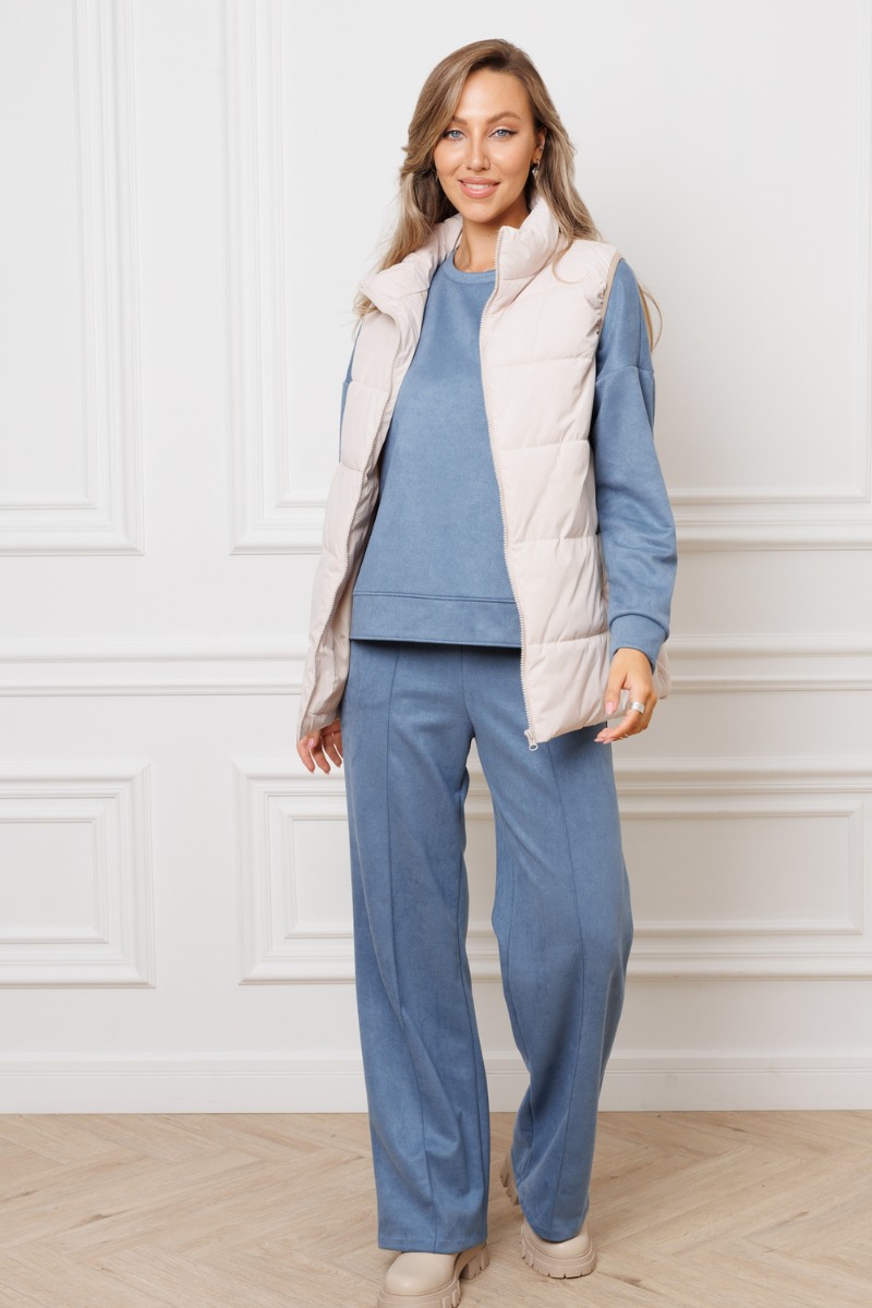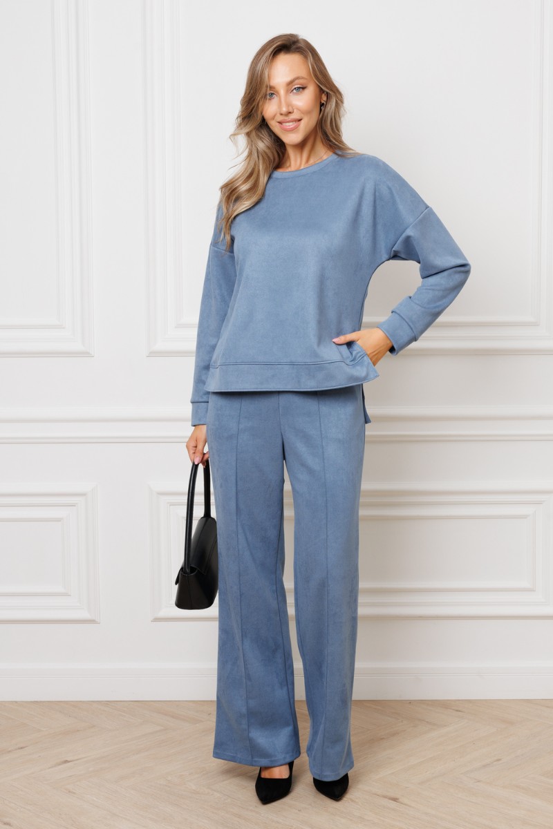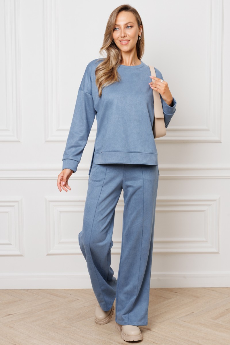 Представляем Вашему вниманию женский брючный замшевый костюм от российского производителя бренда женской одежды. Невероятно мягкий, удобный теплый комплект из замшевого материала приятного к телу в составе лонгслива и свободных брюк палаццо. Свитшот с длинным рукавом, округлым вырезом горловины. Разрезы по боковым швам кофты и асимметричный крой верха с удлиненной спинкой. Прямые брюки с широкой резинкой на поясе, карманами с отрезным бочком и эффектными отстроченными стрелками по фасаду изделия стройнят силуэт. Необычное дизайнерское решение позволило совместить элегантную классику и эффектный стиль.