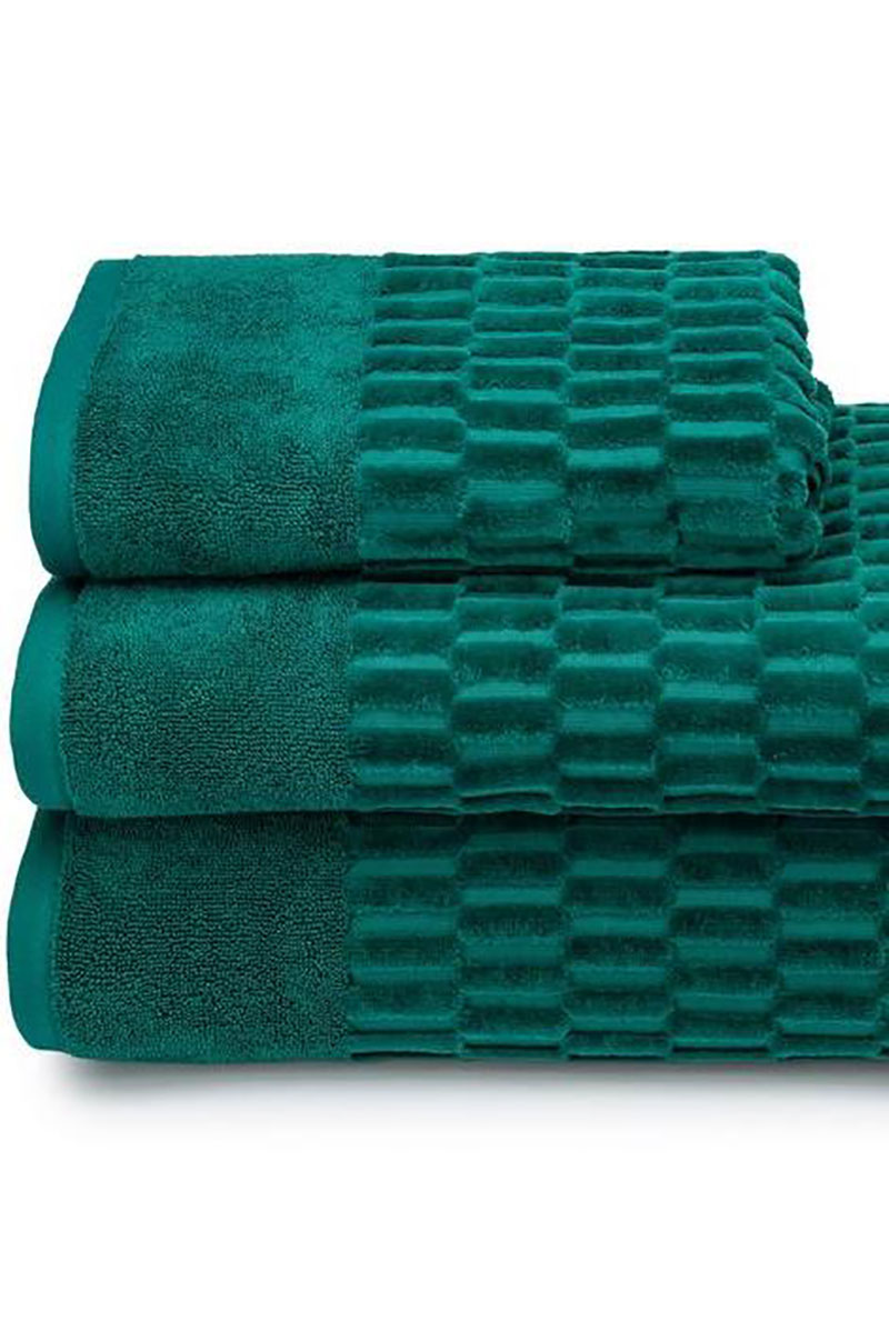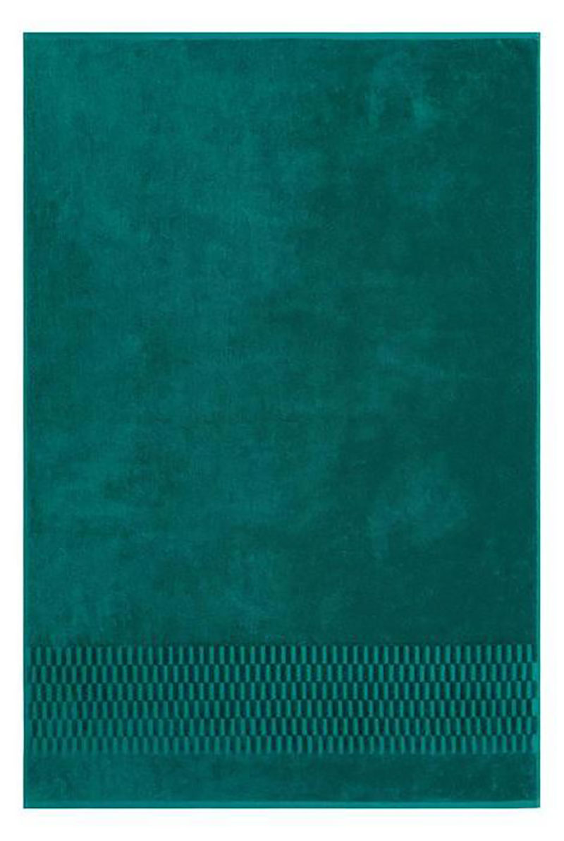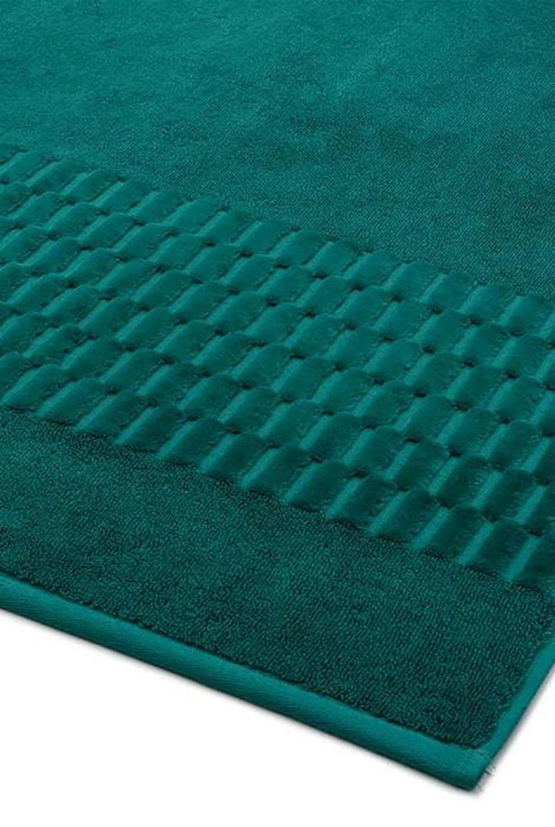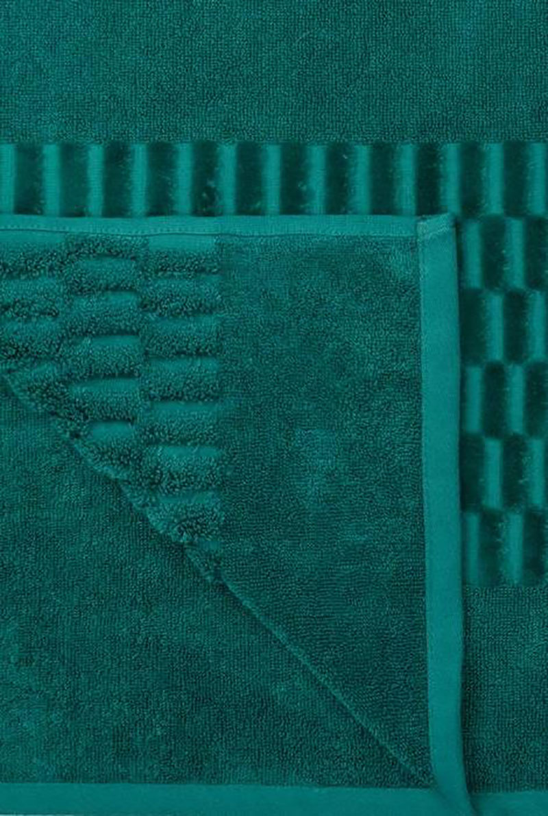 Махровое гладкокрашеное полотенце выполнено из премиального длинноволокнистого хлопка. Изделие из этой пряжи высокого качества обладает особой мягкостью. Полотенце цвета зеленого фикуса декорировано бордюром с геометрическим рельефным принтом из стриженых петель. Такая технология создает тактильный эффект нежной велюровой поверхности.