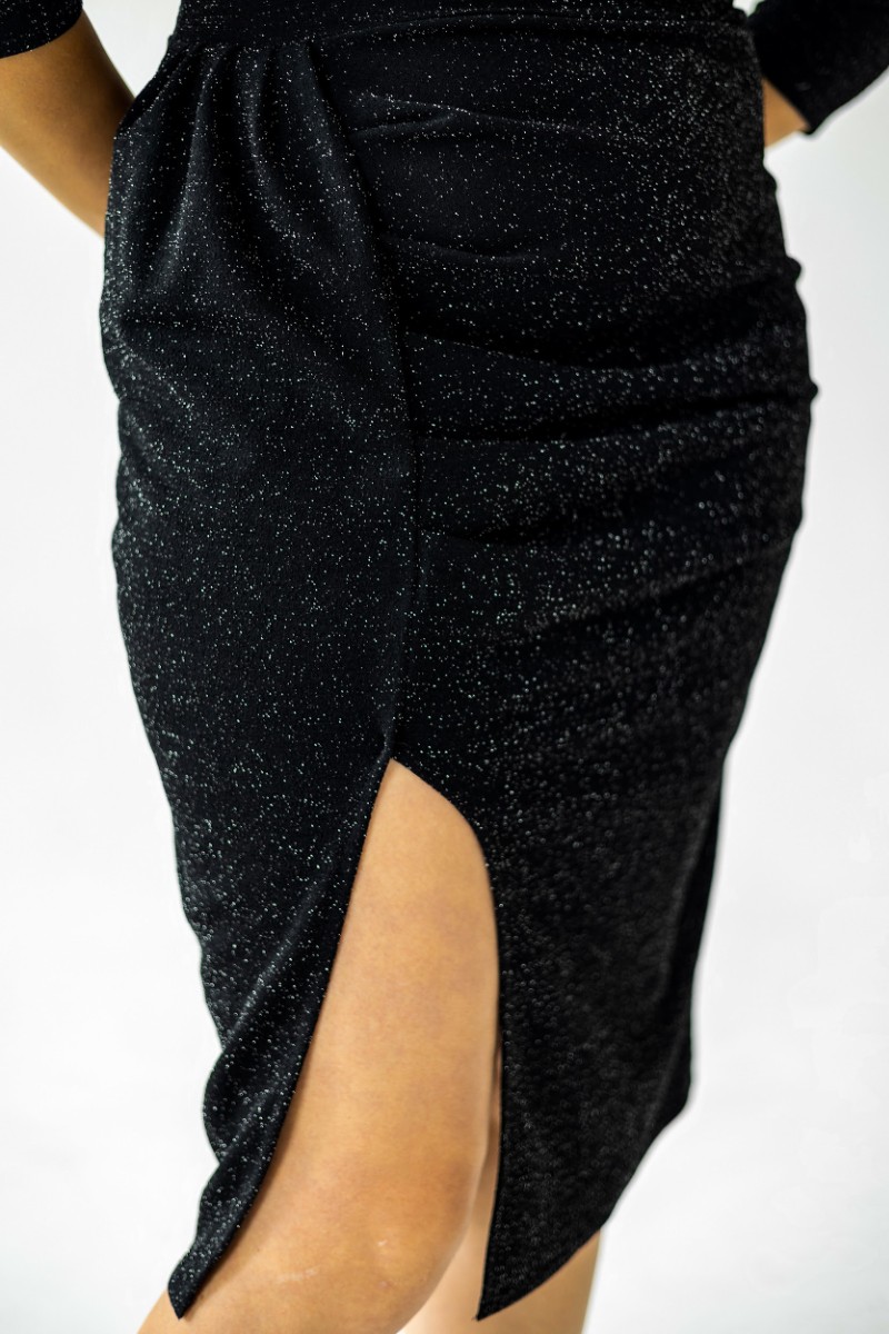 Представляем Вашему вниманию коктейльное женское платье, которое должно быть в гардеробе каждой девушки. «Изюминку» этому наряду задают блестки, а значит, он больше относится к торжественным одеяниям. Приталенная модель хорошо смотрится на стройных леди. Для того, чтобы добавить образу женственности, немного откройте плечи. Пояс выделяет талию, а разрез придает даме пикантности.
