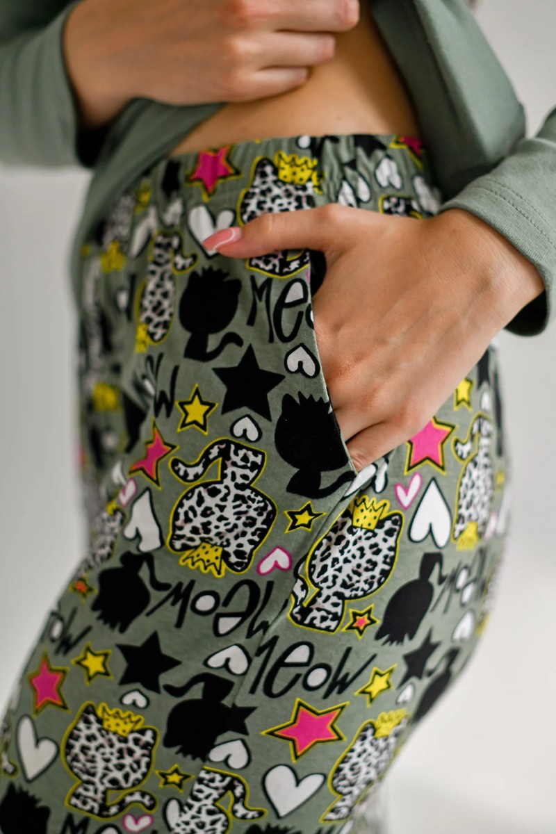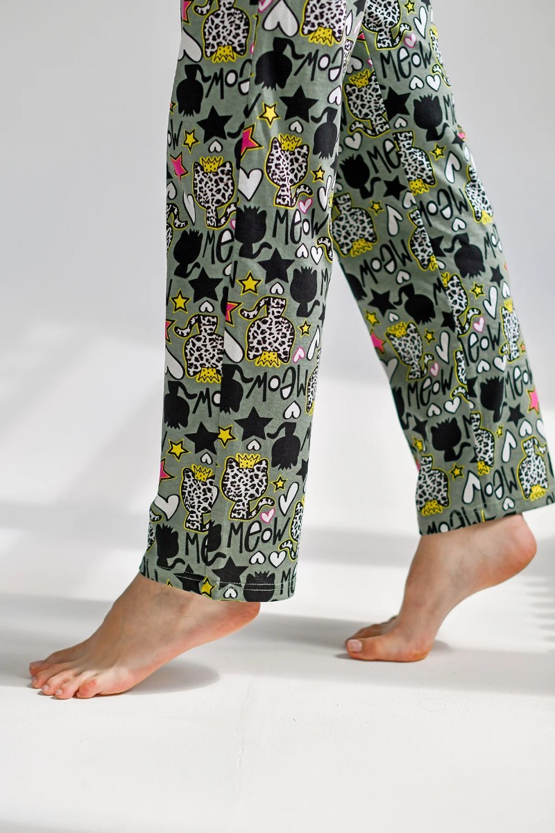 Пижама женская "Мяу" 2128-Р/К (брюки) кулирка+рибана (последний размер) зеленый 50