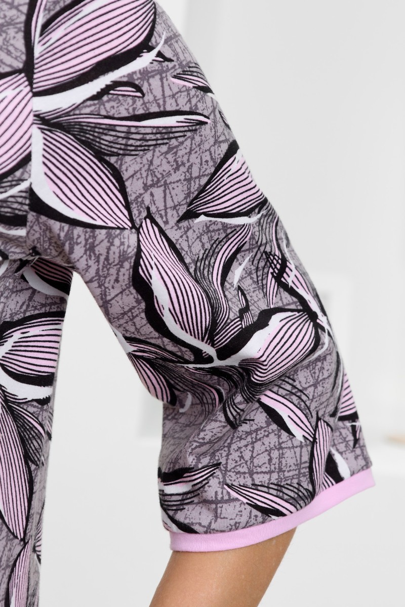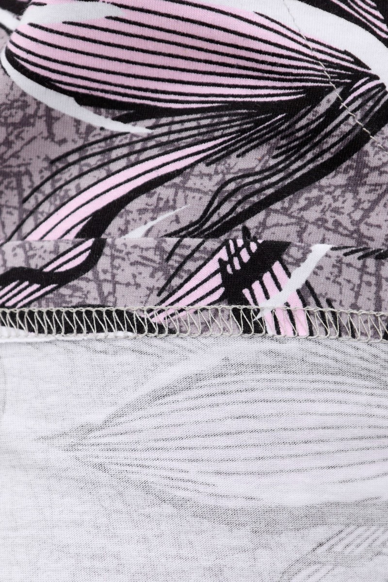 Представляем Вашему вниманию халат женский из трикотажного полотна «кулирка» с набивным рисунком, прямого силуэта, с короткими втачными рукавами, горловиной овальной формы, карманами в боковых швах и центральной бортовой застежкой на тесьму «молния». Бортовые срезы, горловина и входы в карманы окантованы контрастным материалом.