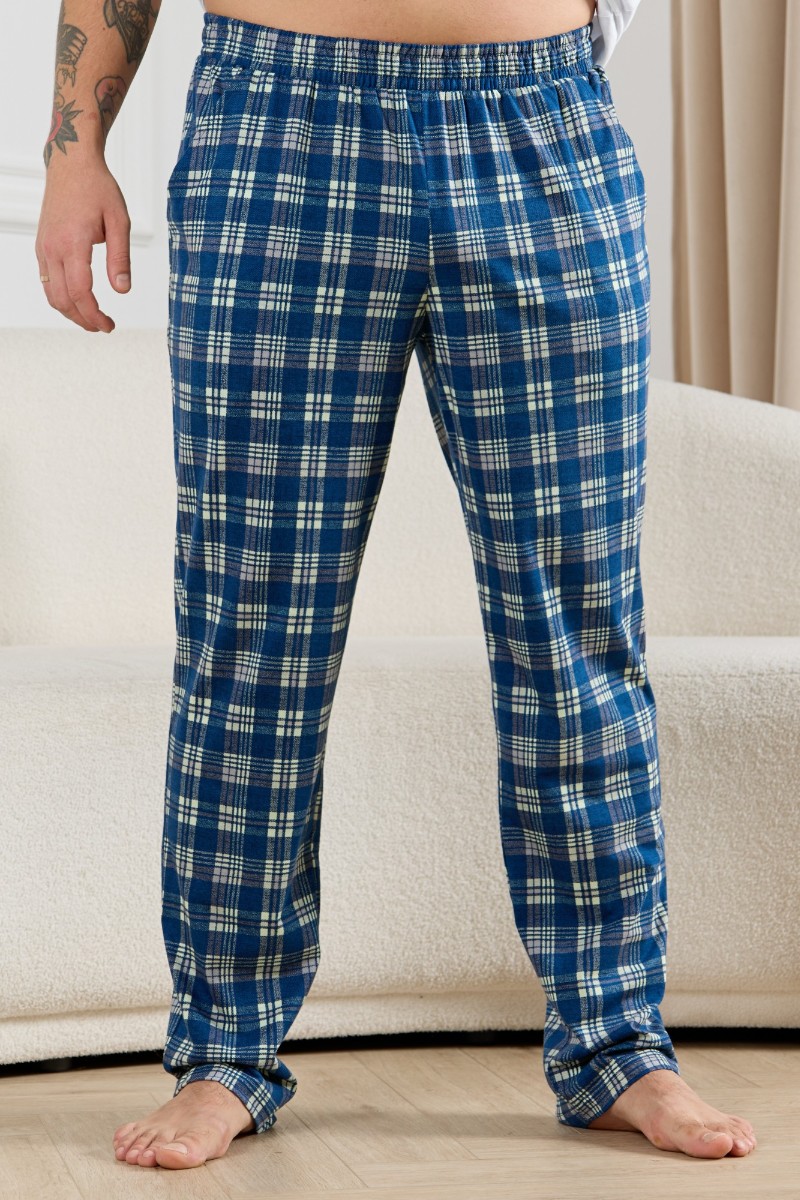 Представляем Вашему вниманию брюки мужские из трикотажного полотна "кулирка" в клетку, свободного покроя, на притачном поясе с эластичной тесьмой внутри, с карманами в боковых швах. Нижние срезы обработаны подгибкой.