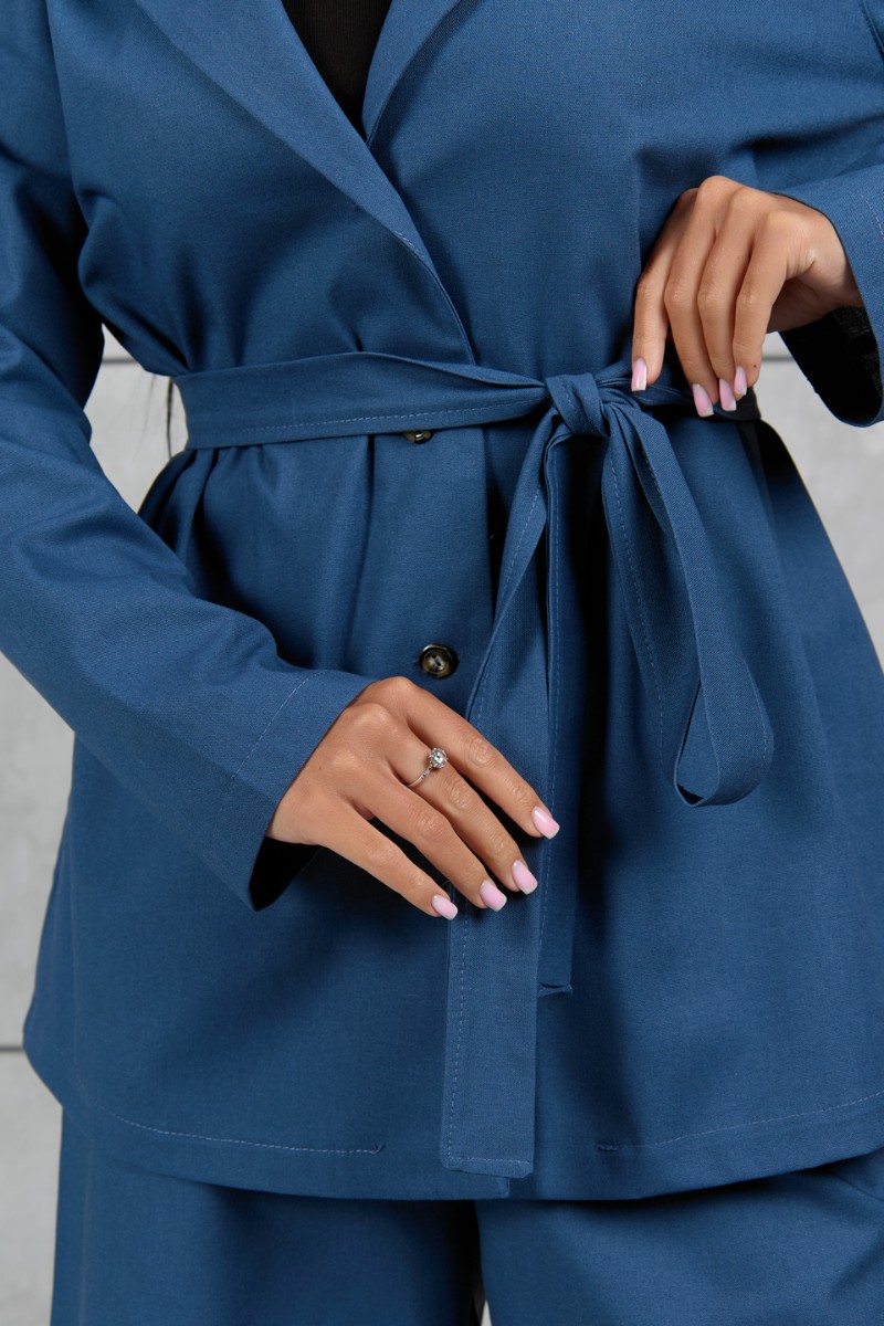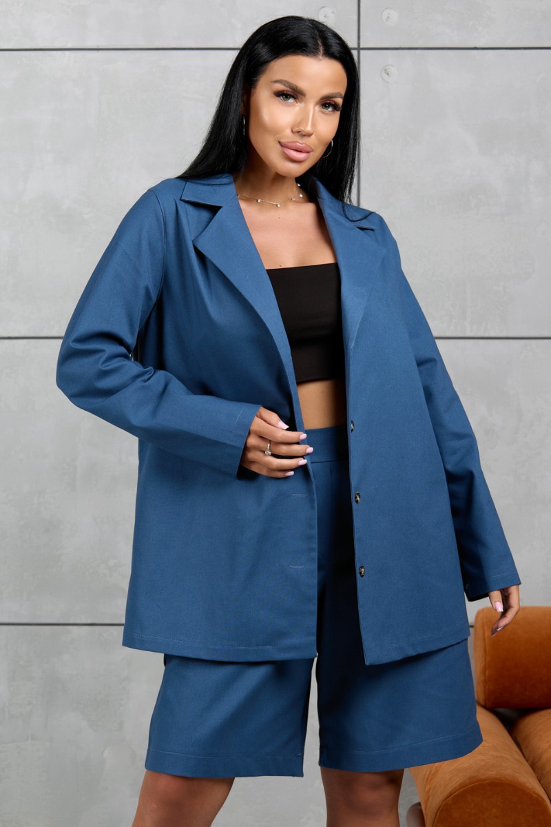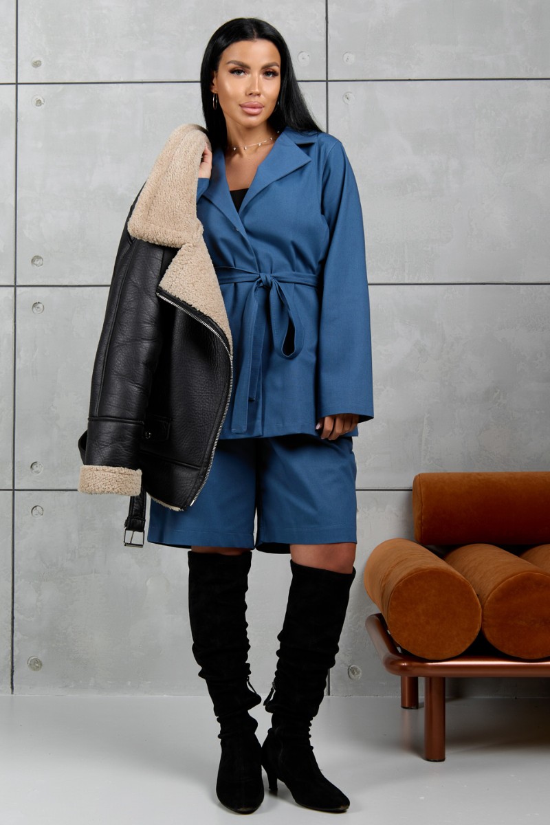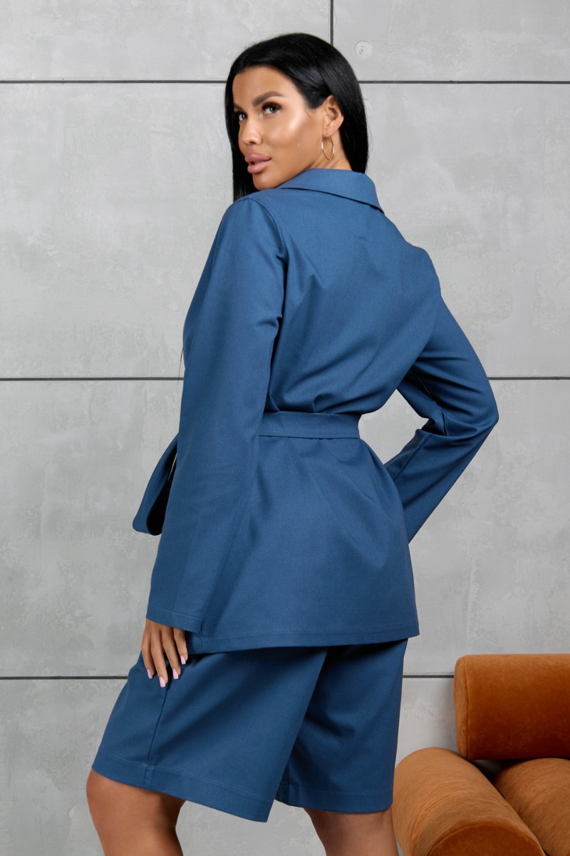 Представляем Вашему вниманию костюм женский из льна. В составе костюма: Однобортный пиджак умеренного объёма, с базовым втачным рукавом, застежкой на 4 пуговицы и поясом-кушаком. Шорты-бермуды длиной до колена с имитацией гульфика, карманами спереди и поясом с резинкой по задней части шорт.