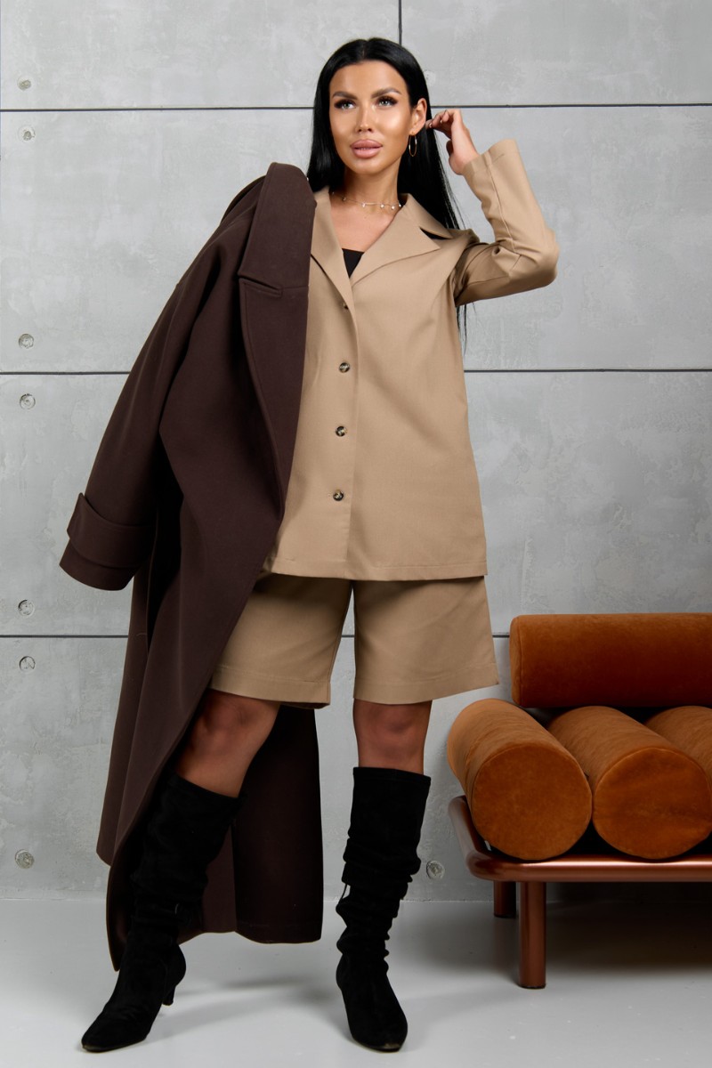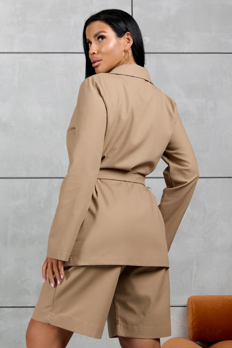 Представляем Вашему вниманию костюм женский из льна. В составе костюма: Однобортный пиджак умеренного объёма, с базовым втачным рукавом, застежкой на 4 пуговицы и поясом-кушаком. Шорты-бермуды длиной до колена с имитацией гульфика, карманами спереди и поясом с резинкой по задней части шорт.