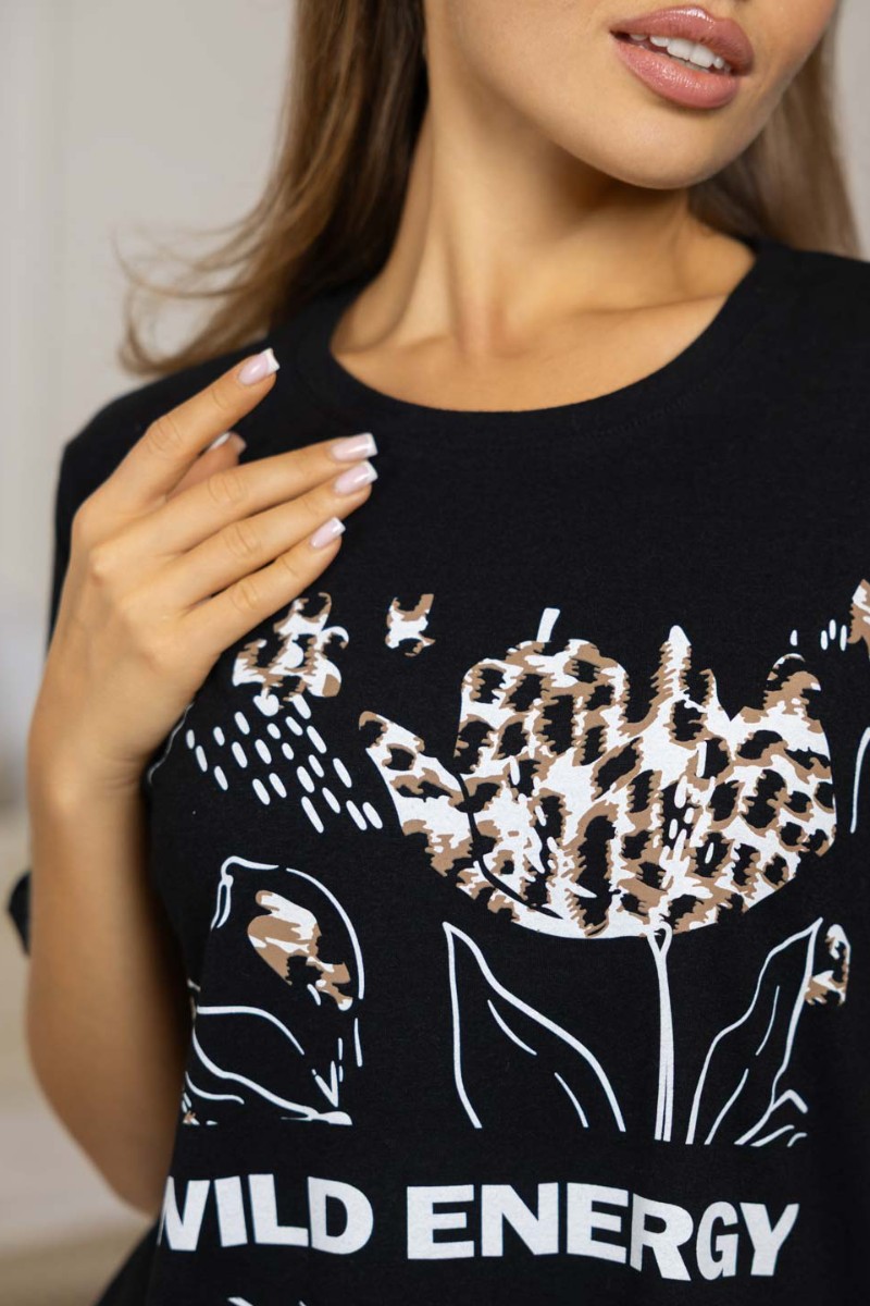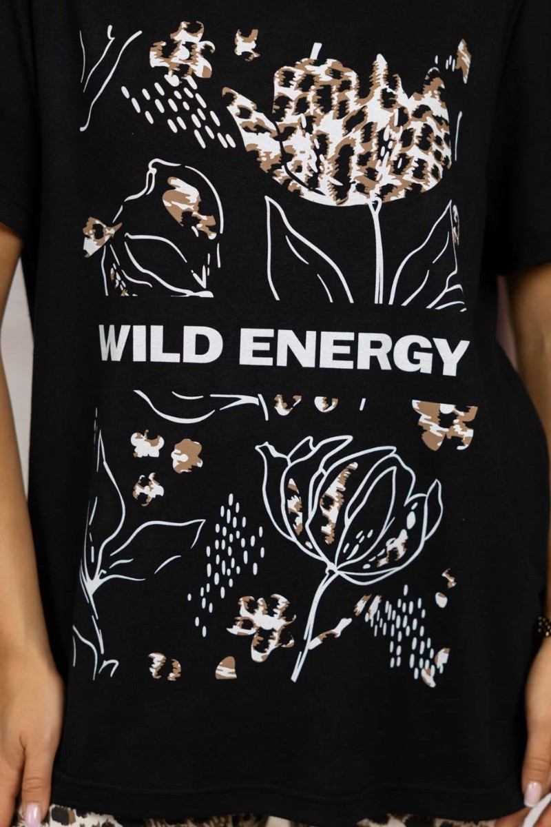 Представляем Вашему вниманию костюм женский из трикотажного полотна, состоящий из бридж и футболки. Футболка полуприлегающего силуэта длинной чуть ниже уровня бёдер с принтом на полке. Вырез горловины О-образный. Бриджи из трикотажного полотна длинной ниже уровня колена.