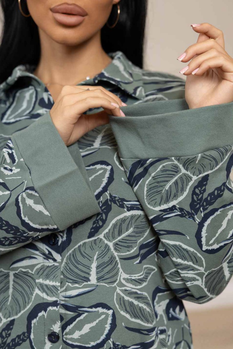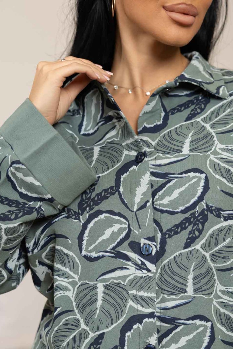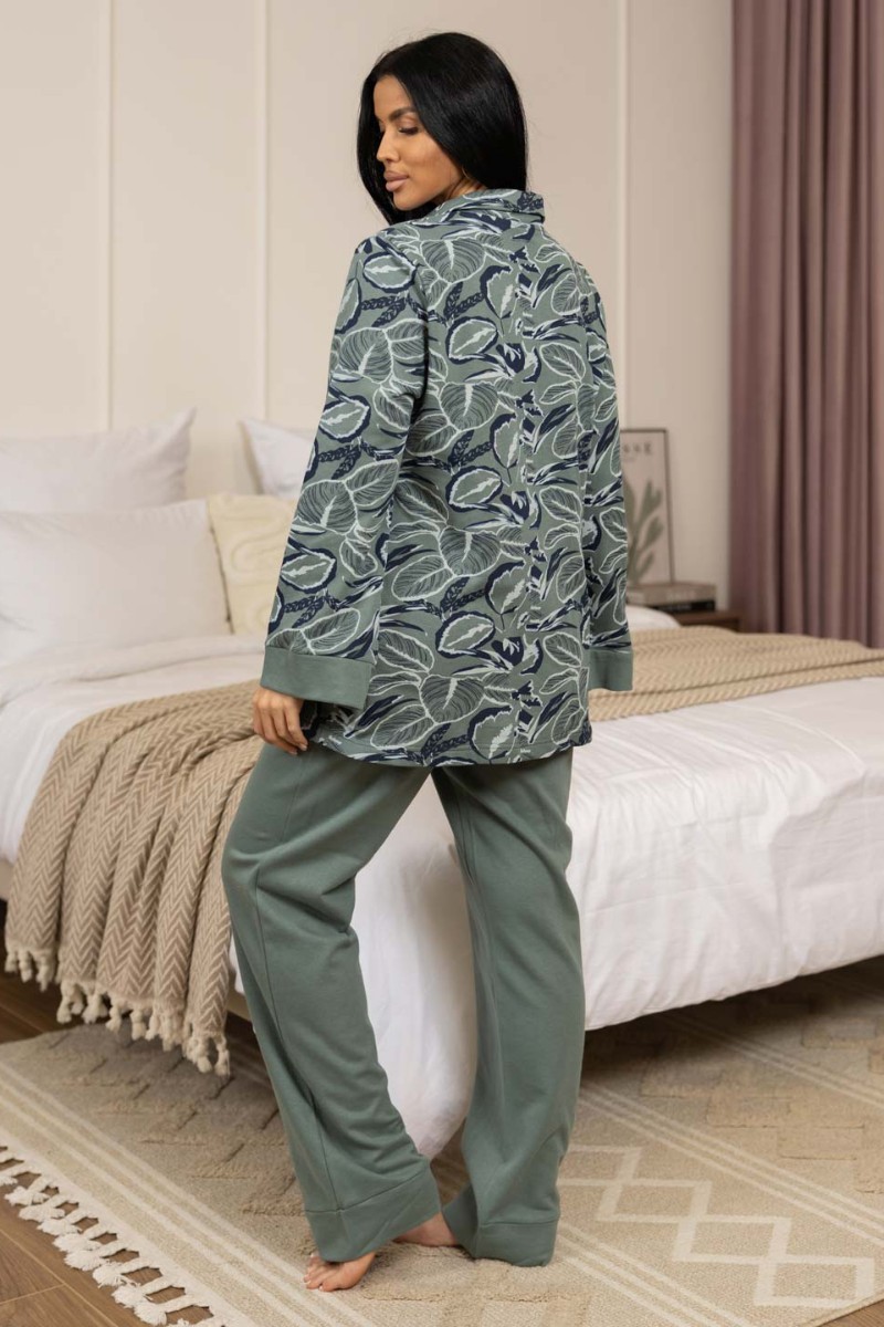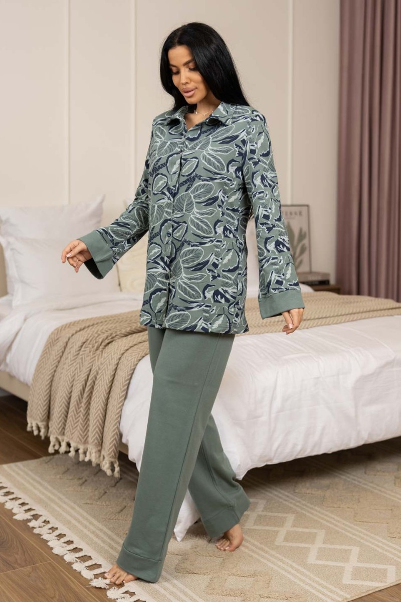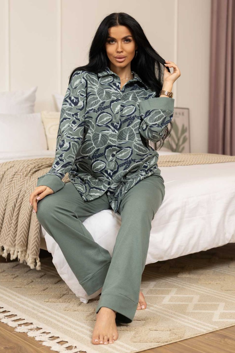 Представляем Вашему вниманию женскую пижаму, сшитую из футера начёса. Верх - рубашка с отложным воротником на пуговицах, рукав длинный с манжетой в цвет брюк. Брюки прямые, полной длины, на резинке, без карманов, с манжетами по низу, при необходимости можно отогнуть манжеты и сделать брюки длиной 7/8.