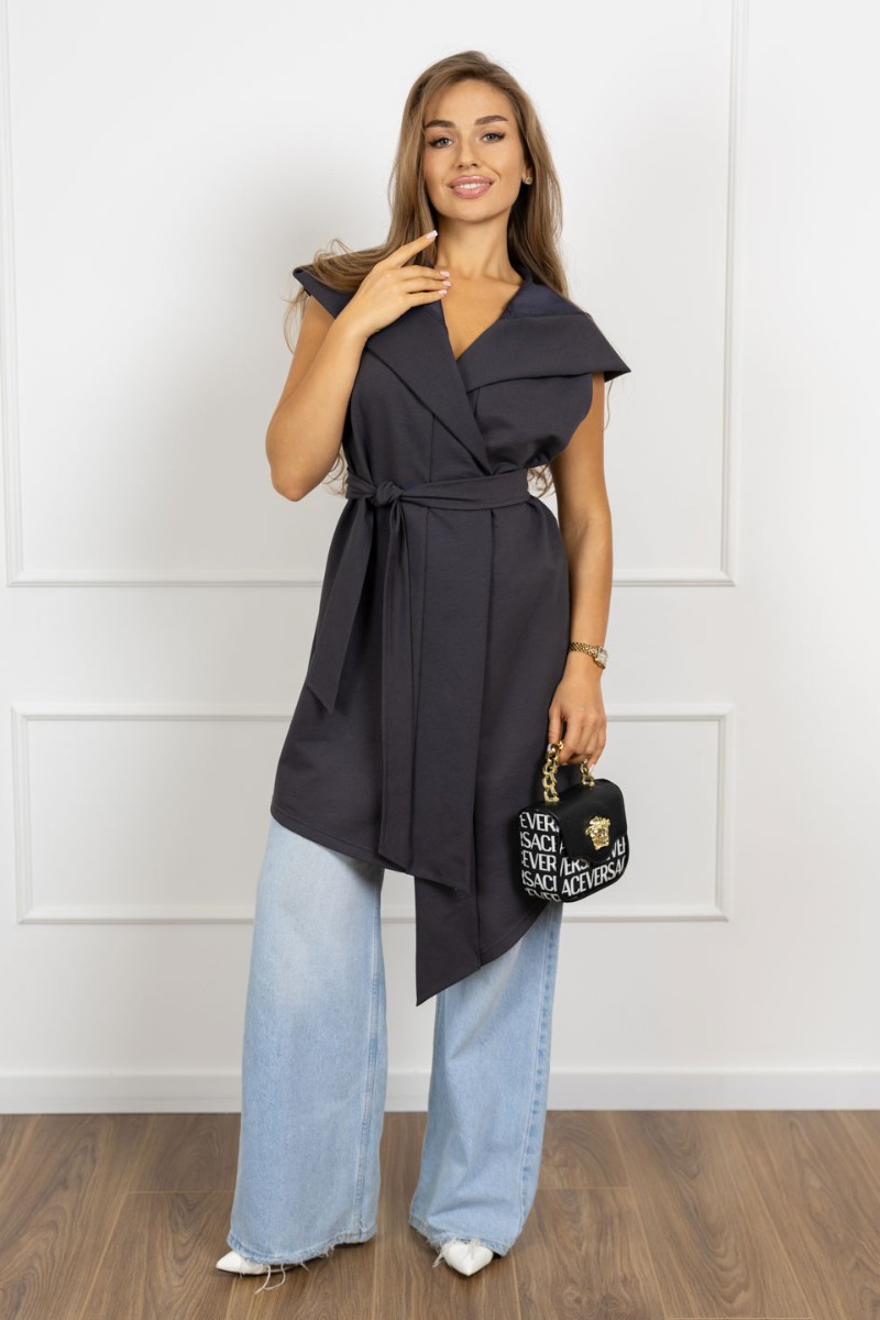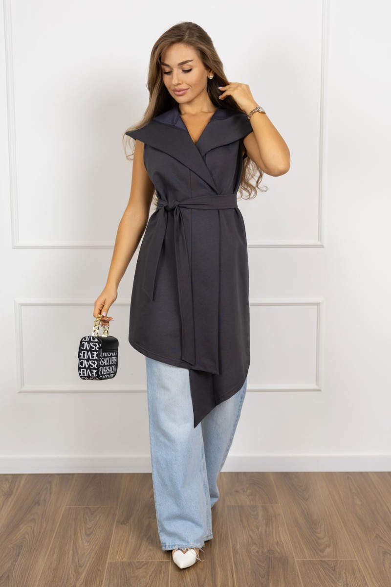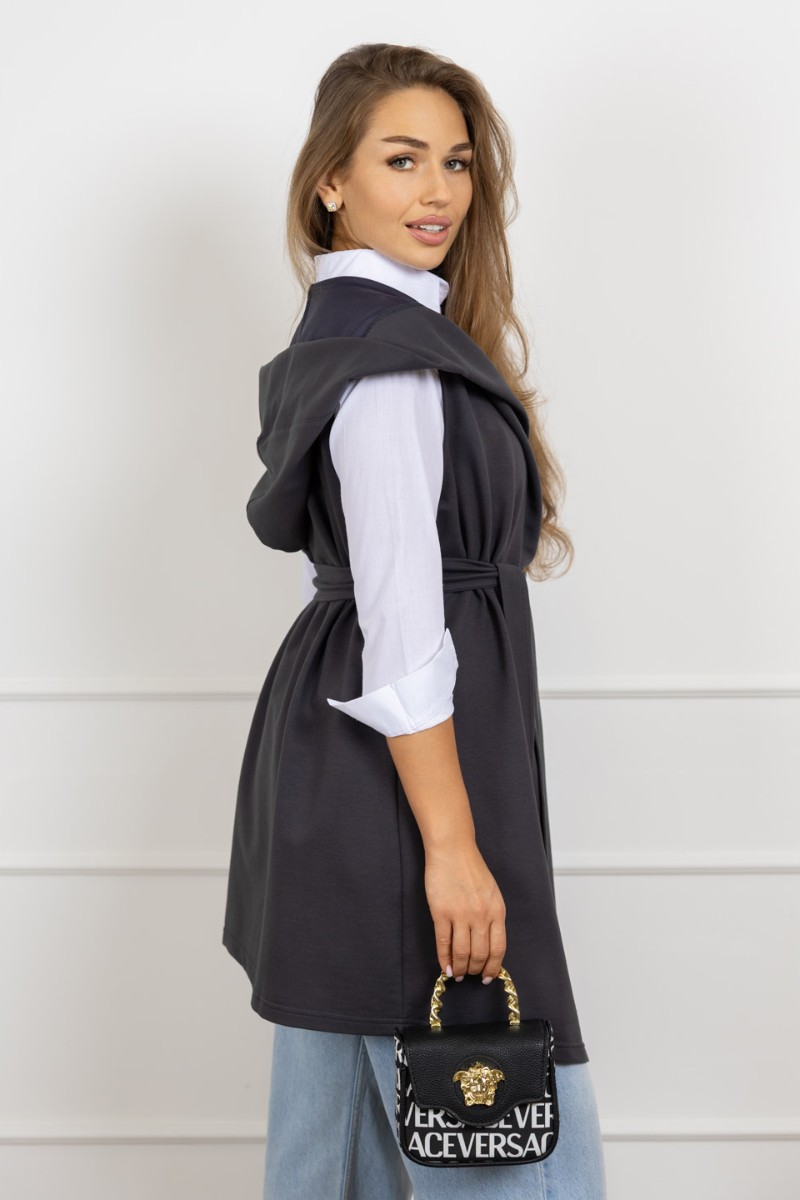 Представляем Вашему вниманию жилетку-мантию из футера. Модель с капюшоном и кушаком, асимметричный борт придает изюминку образу. С нашей жилеткой можно создать множество образов - от деловых до вечерних.