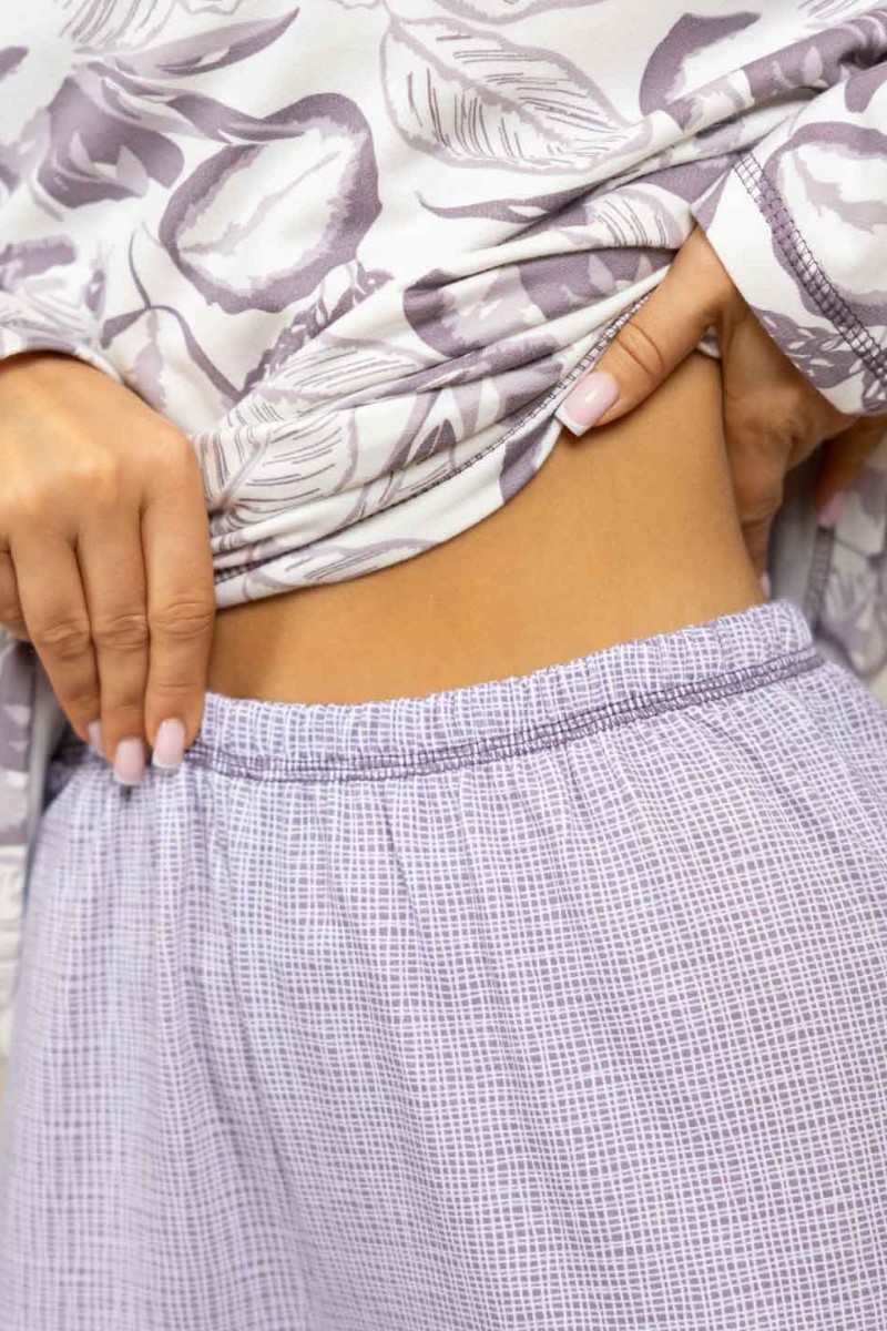 Представляем Вашему вниманию женскую пижаму, сшитую из приятной трикотажной ткани с мягким начесом. Отличный комплект для сна и отдыха, в нем Вы будете засыпать с комфортом. Пижама выполнена из тканей компаньонов, которые идеально подходят друг другу. Верх свободного силуэта, не сковывает движения, с кокеткой на запах. Брюки свободного силуэта, полноценной длины, без карманов.