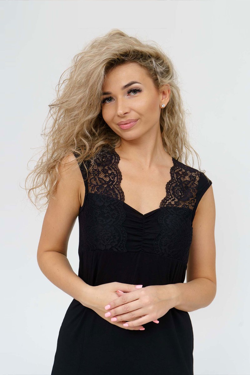 Представляем Вашему вниманию женскую ночную сорочку прилегающего силуэта, сшитую из трикотажного полотна вискоза. Длиной выше уровня колена. На полочке присутствует кокетка с кружевной вставкой, переходящей в бретели. Рукав – крылышко. Вырез горловины П-образный.