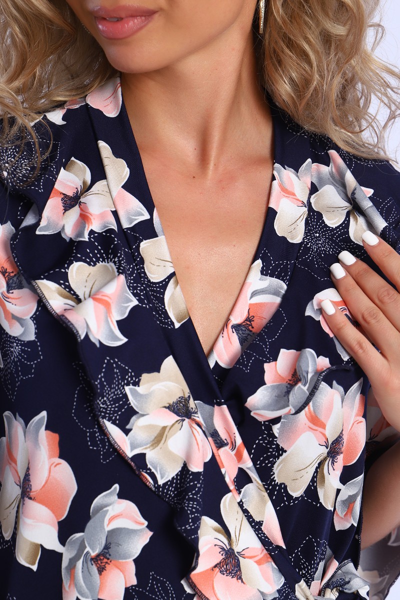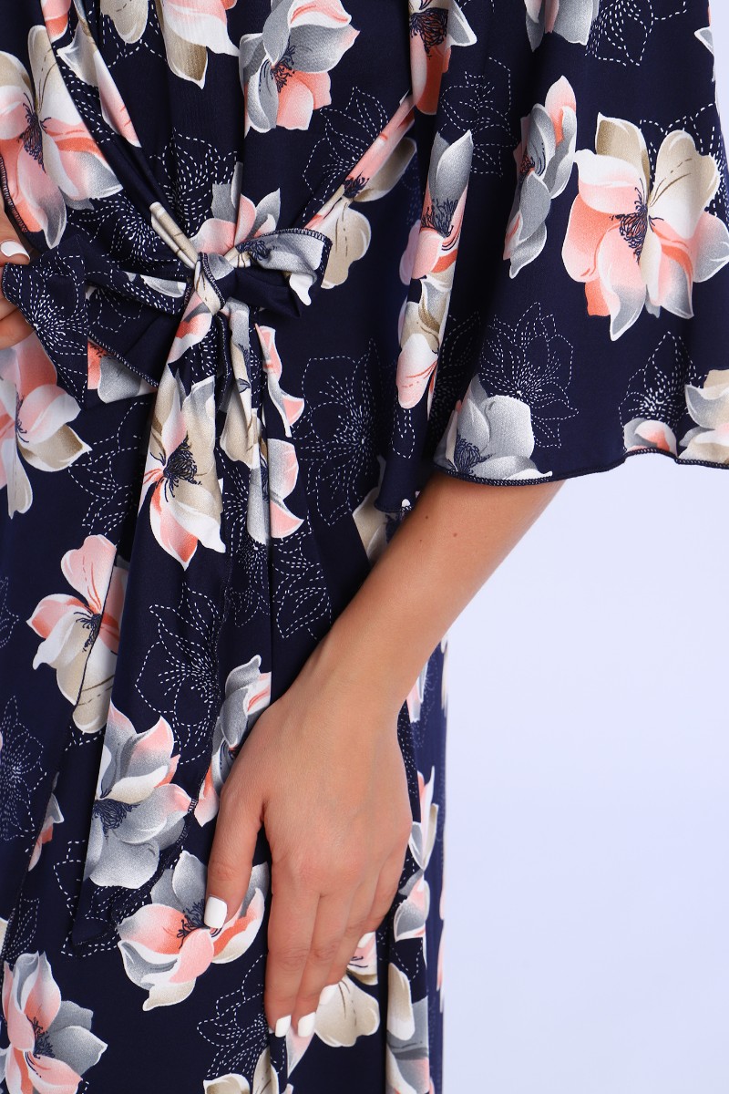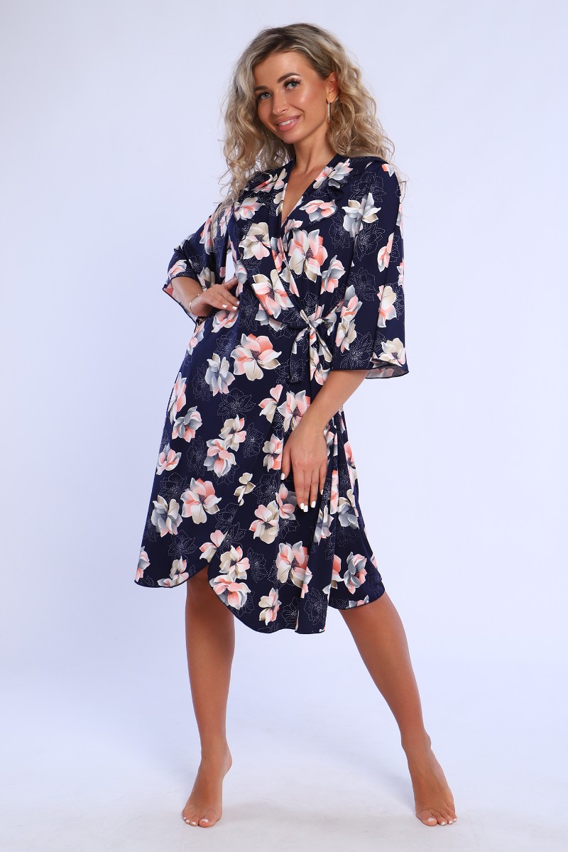 Представляем Вашему вниманию оригинальный женский халат из струящейся ткани с расклешенными рукавами. Срезы халаты обработаны специальной строчкой, вырез горловины украшен оборкой.