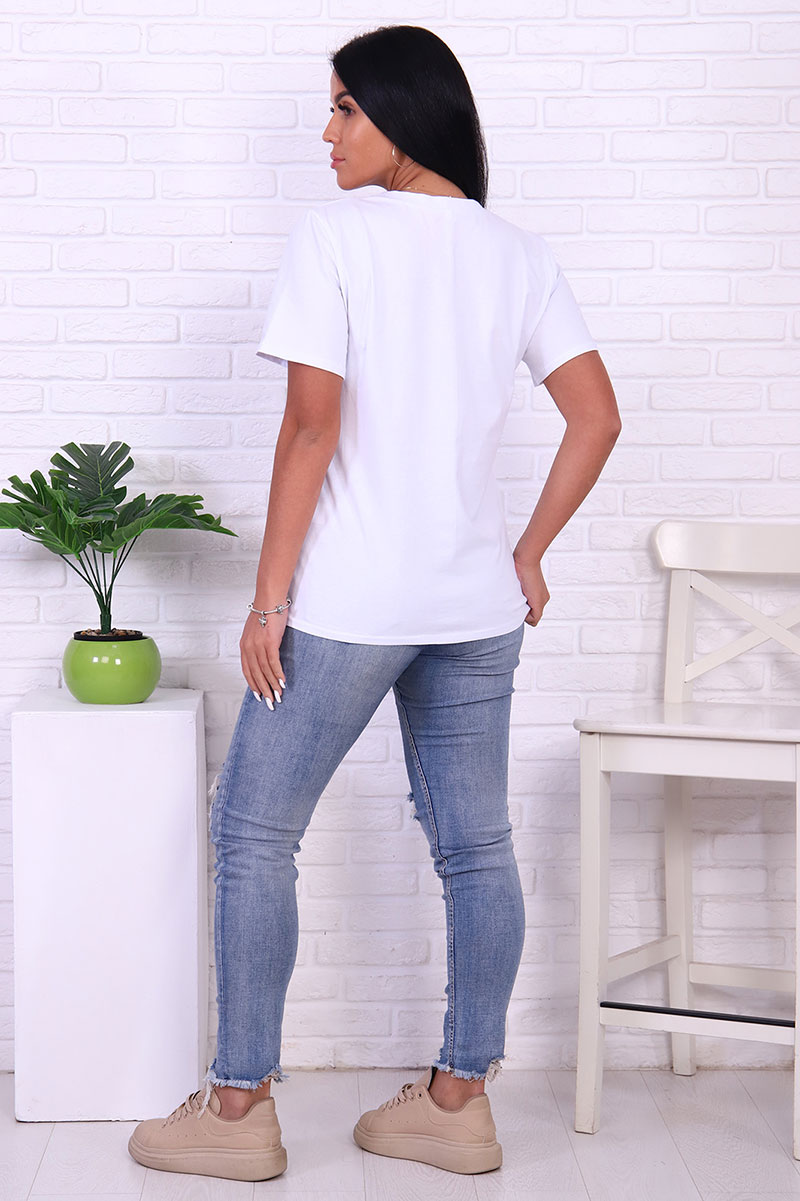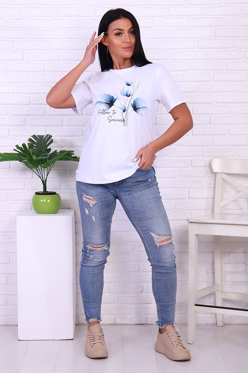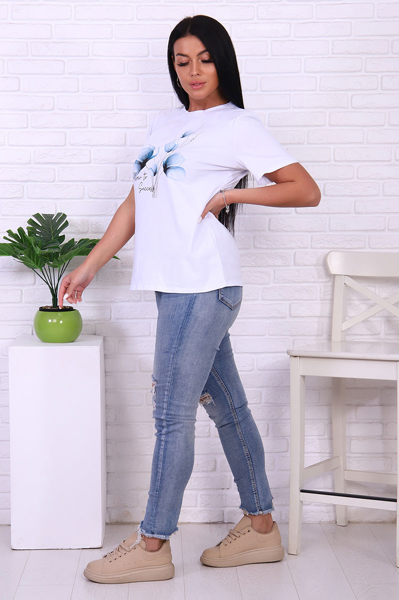 Представляем Вашему вниманию изящную женскую футболку с коротким втачным рукавом, горловина круглой формы, на детали переда печать. Модель сшита из приятного телу, высококачественного, 100% натурального хлопка, который отлично пропускает воздух, позволяя коже дышать.