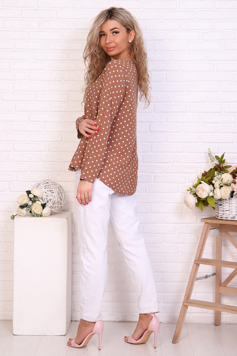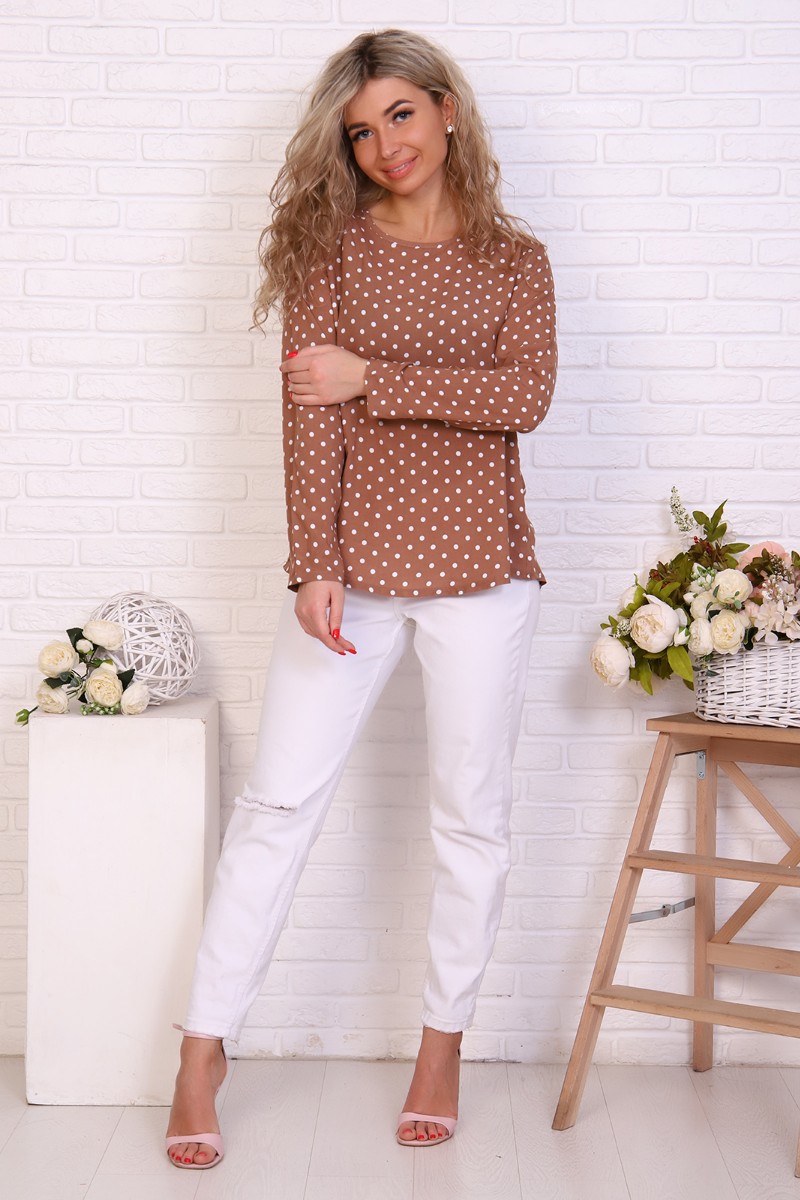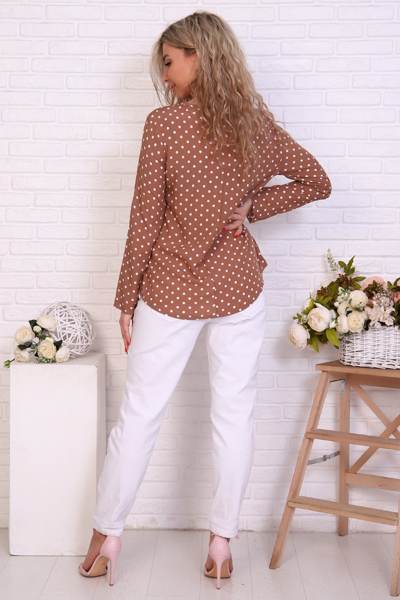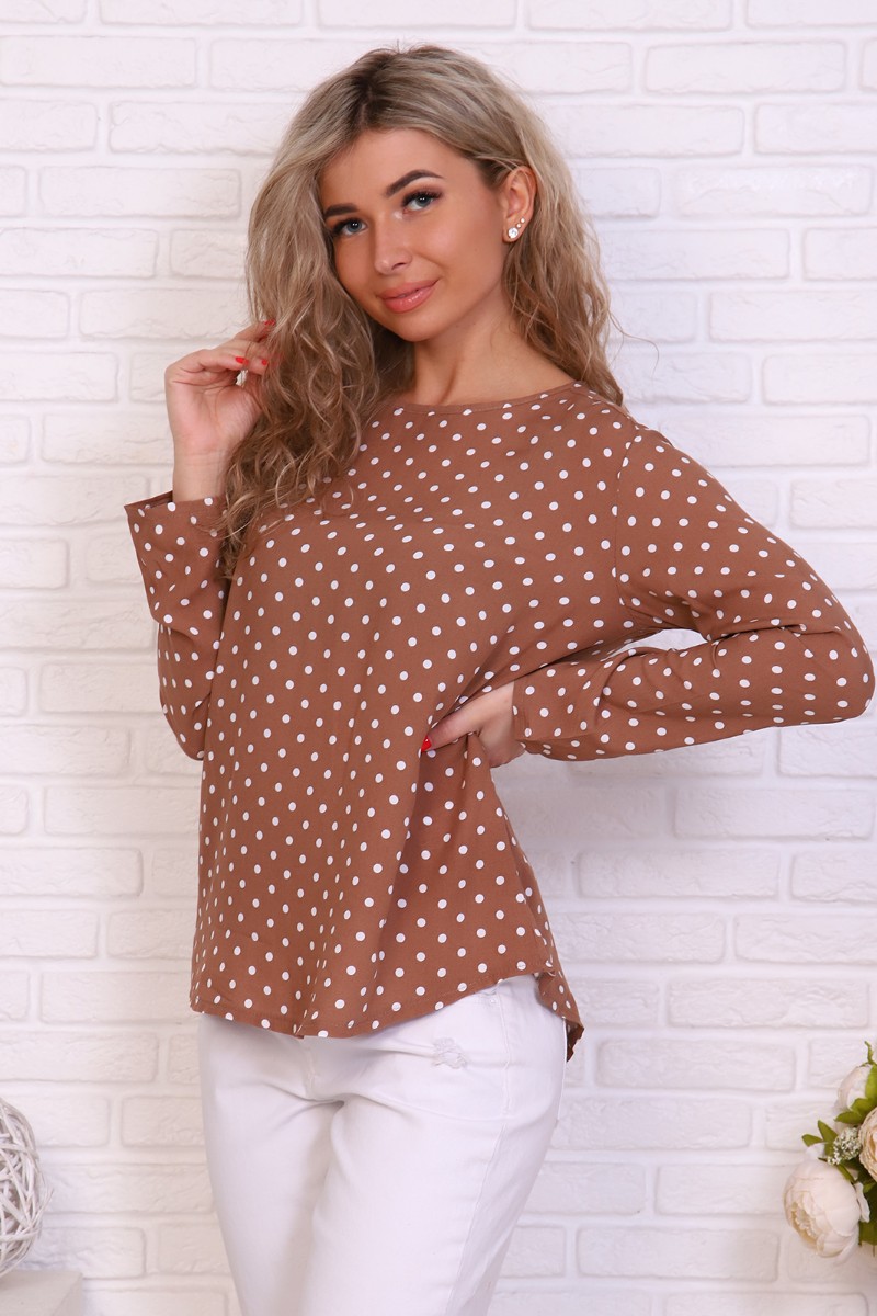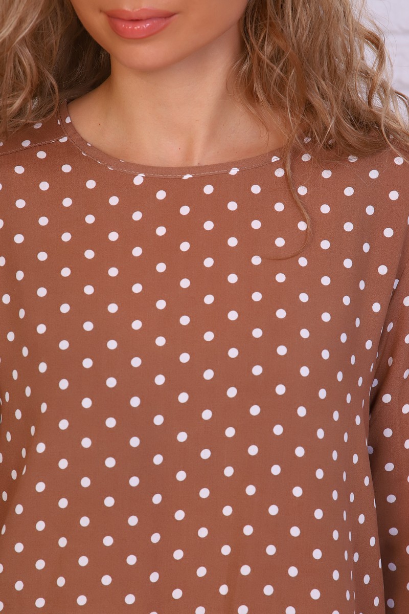 Представляем Вашему вниманию изящную женскую тунику с принтом горох и переходящими на перед кокетками. Горловина окантована, рукава и низ туники подшиты на прямострочке.