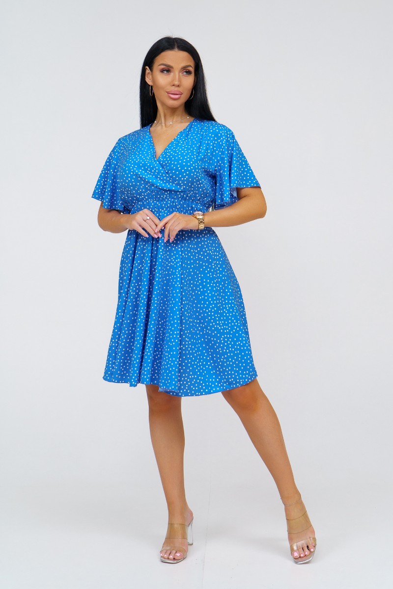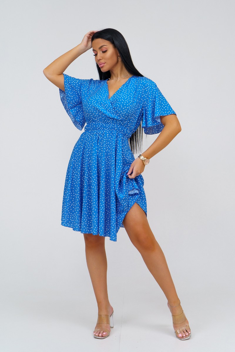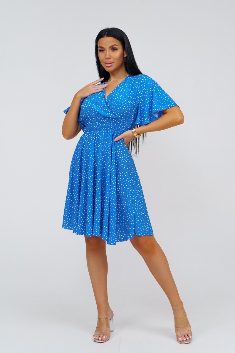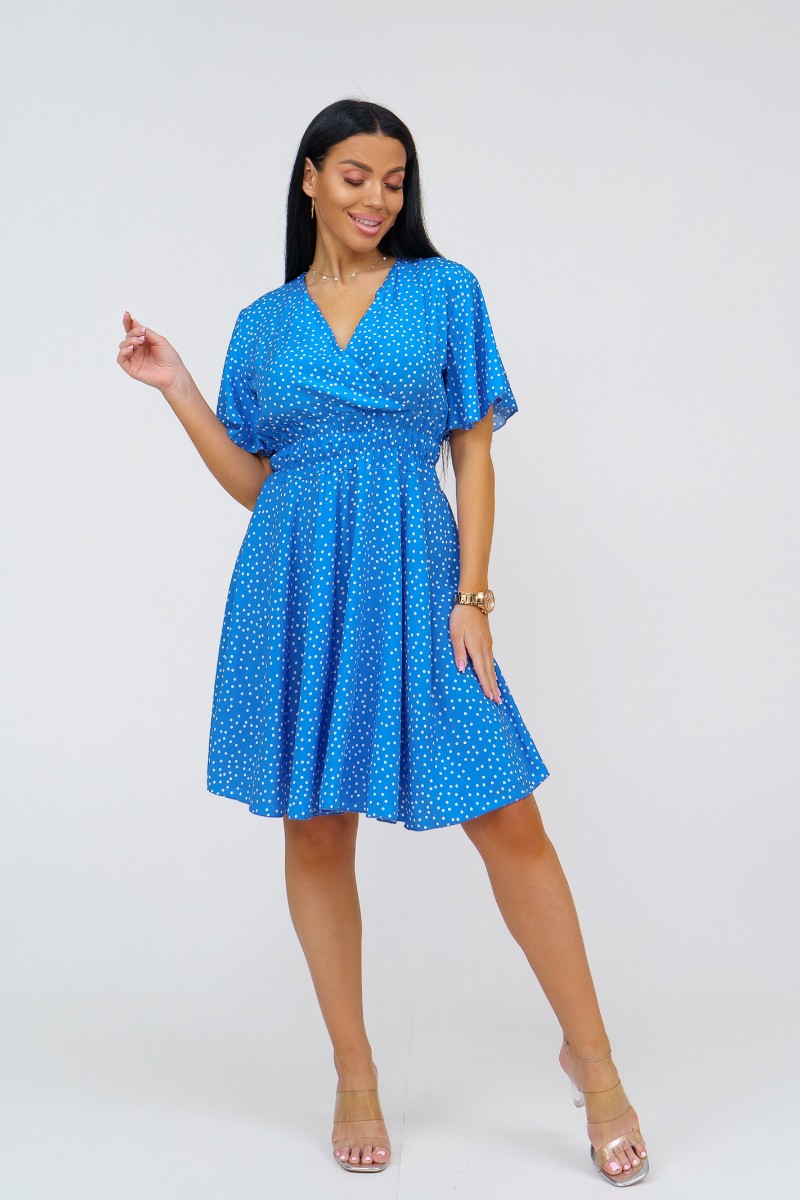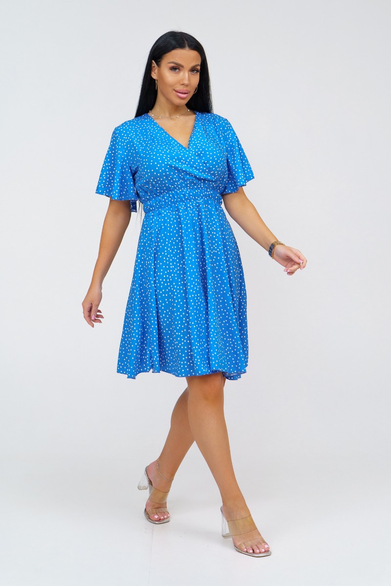 Представляем Вашему вниманию стильное платье из штапеля выше колена. Треугольный вырез с запахом и короткий рукав-бабочка добавляют легкости и непринужденности образу. Талия подчеркнута резинкой.