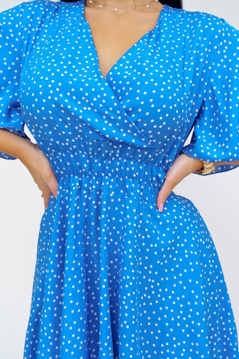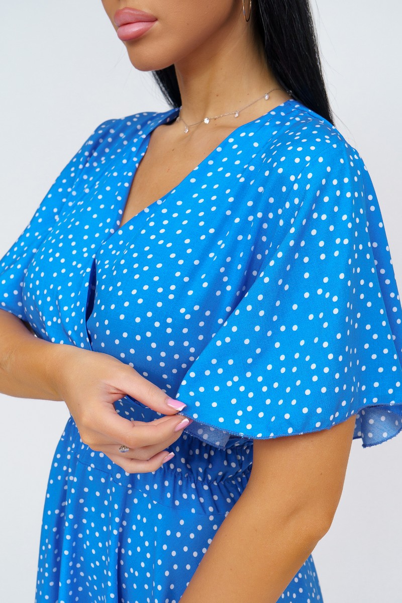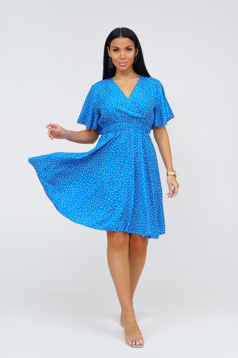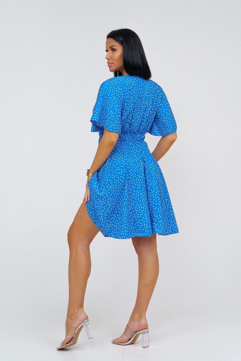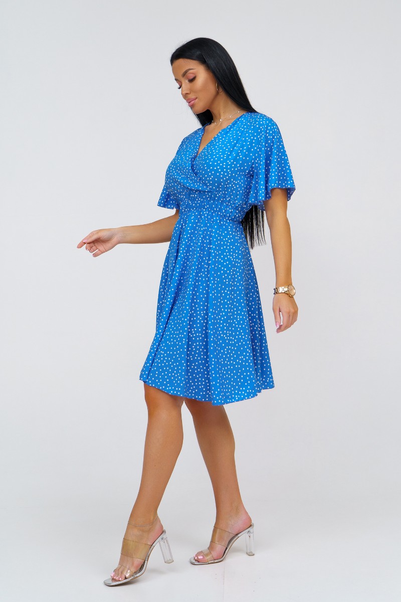 Представляем Вашему вниманию стильное платье из штапеля выше колена. Треугольный вырез с запахом и короткий рукав-бабочка добавляют легкости и непринужденности образу. Талия подчеркнута резинкой.