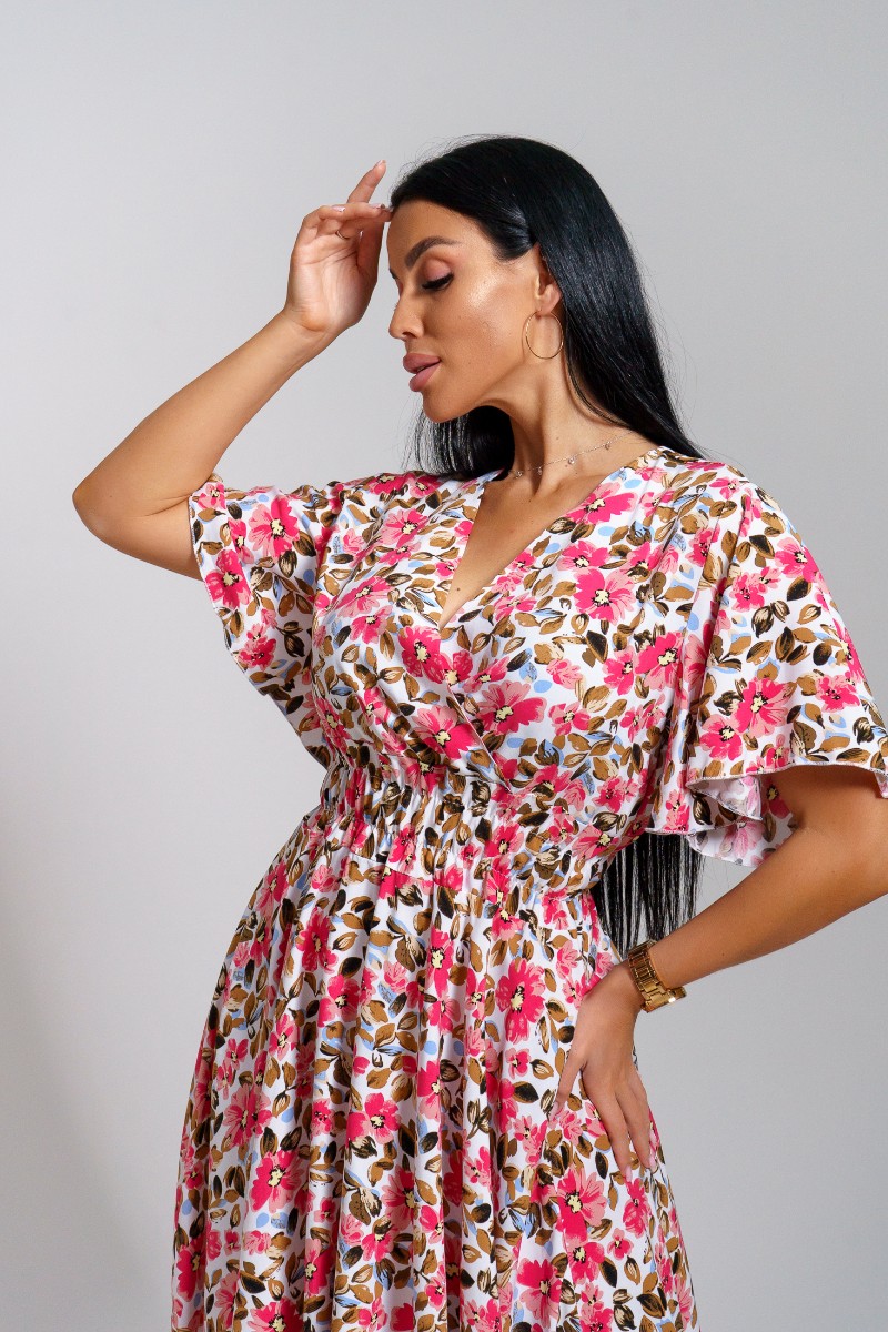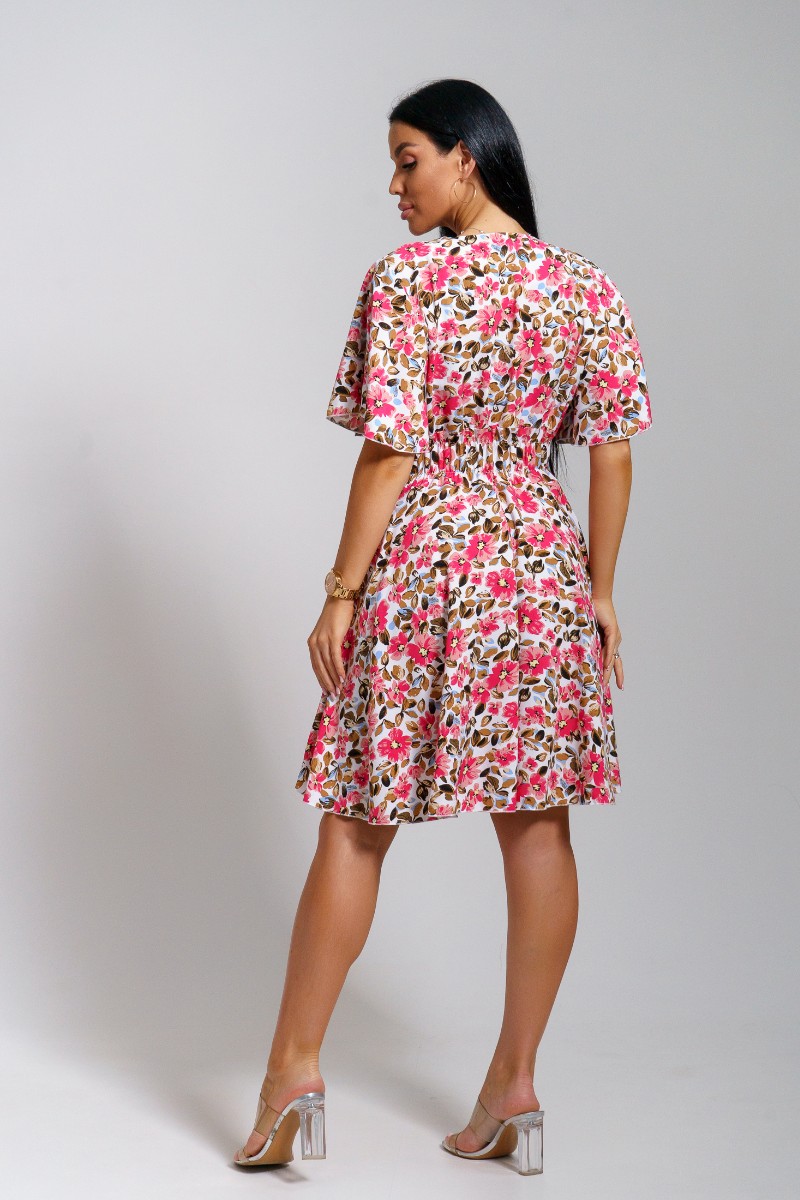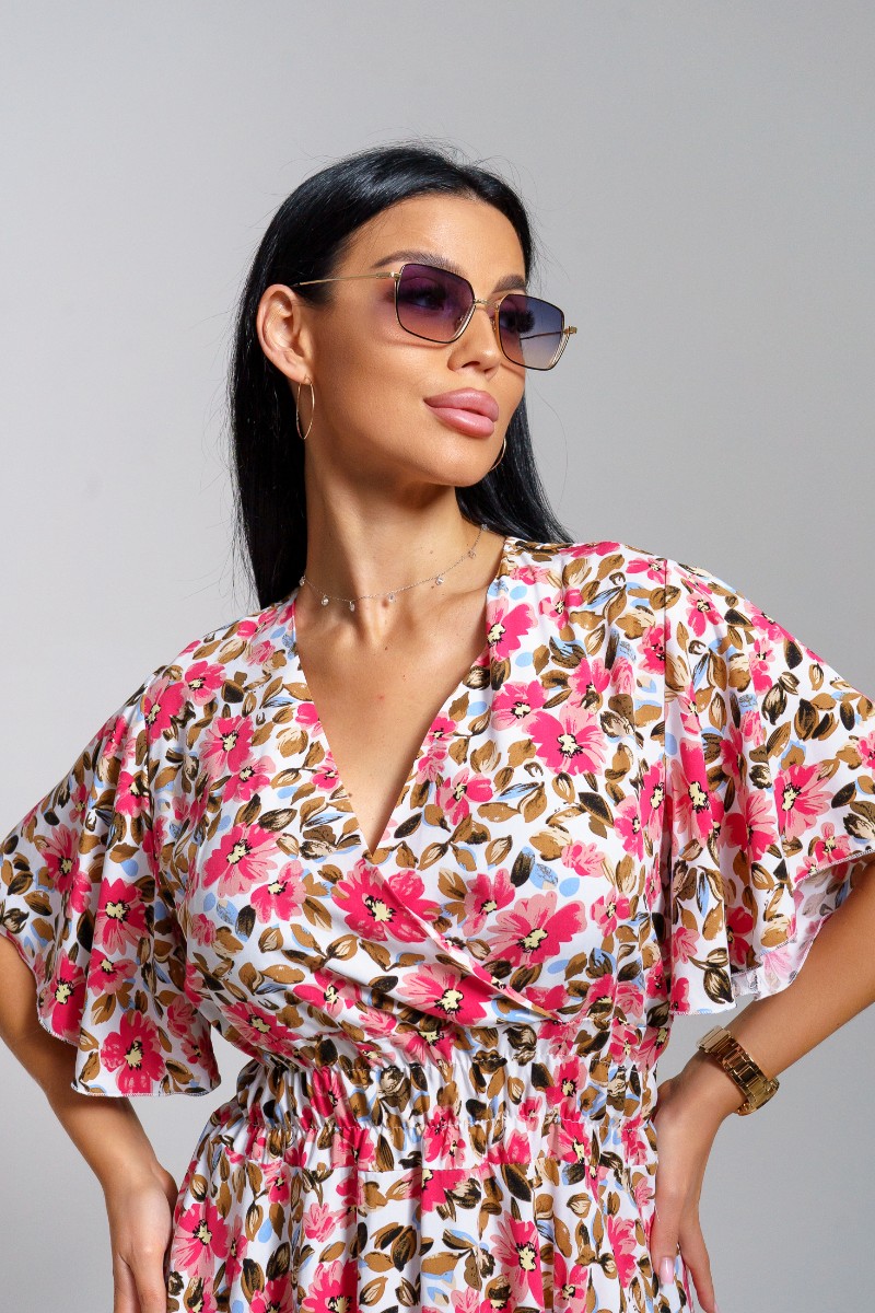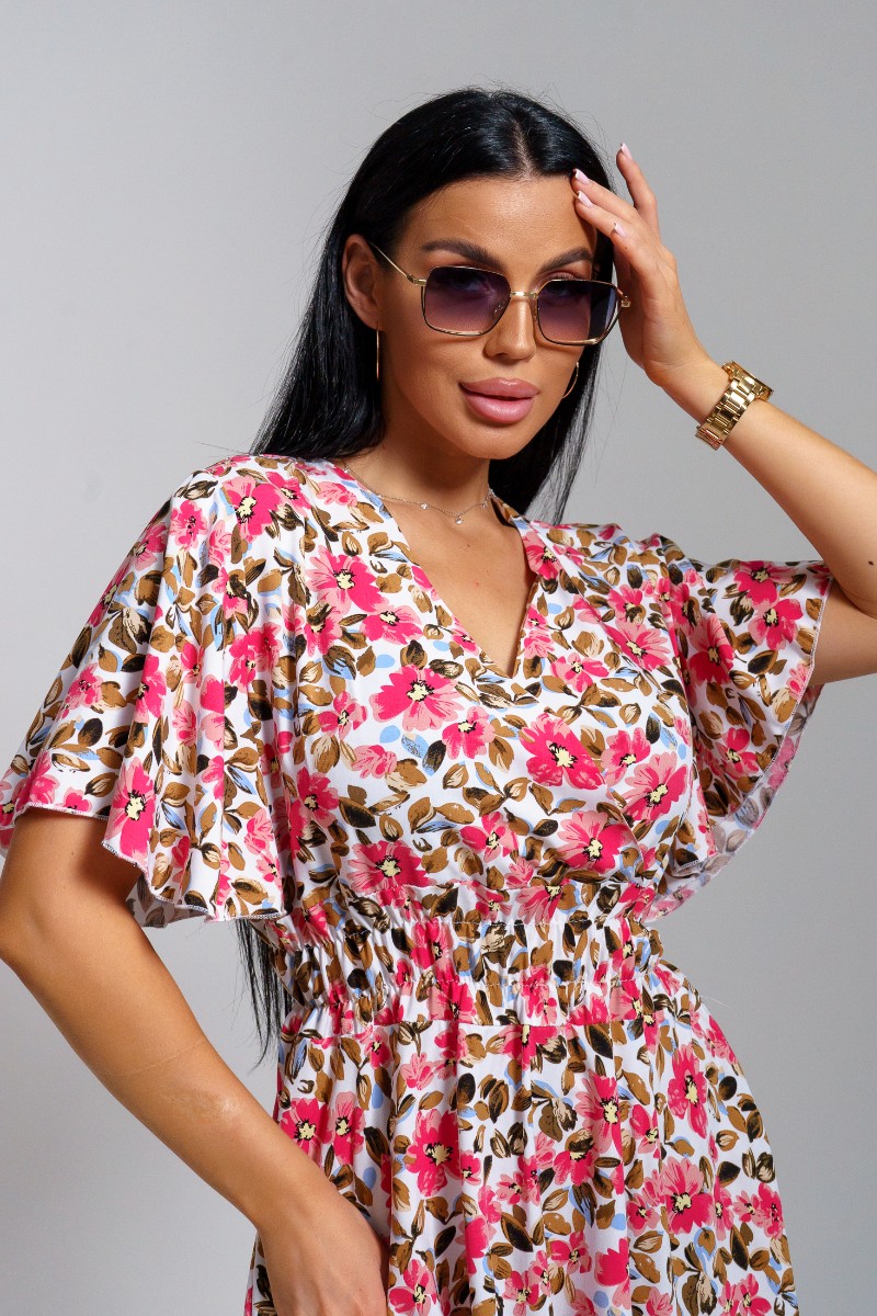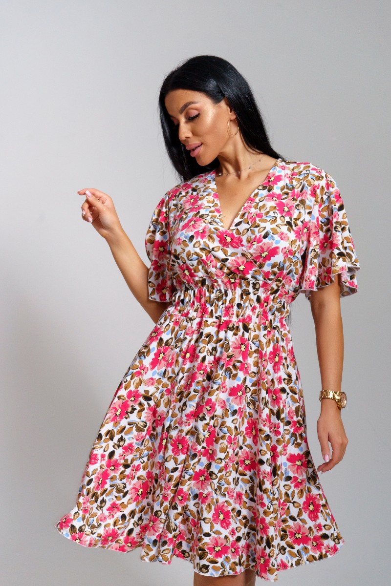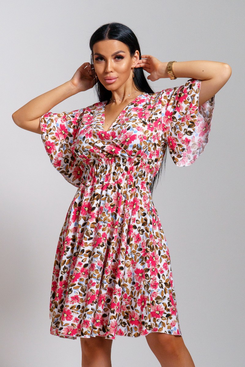 Представляем Вашему вниманию стильное платье из штапеля выше колена. Треугольный вырез с запахом и короткий рукав-бабочка добавляют легкости и непринужденности образу. Талия подчеркнута резинкой.