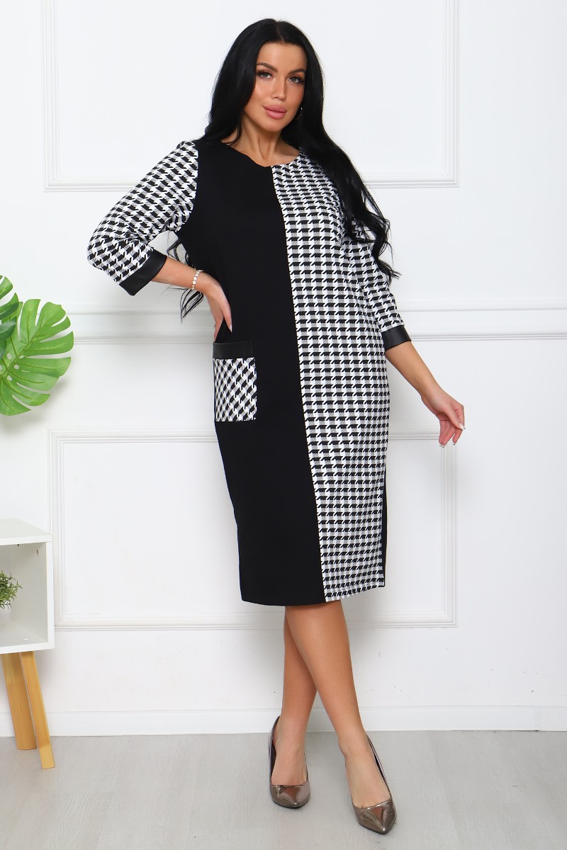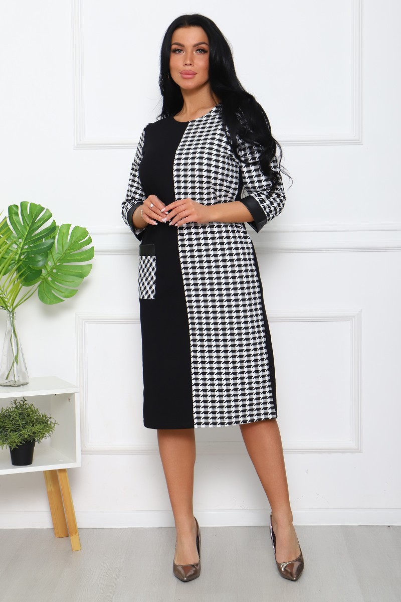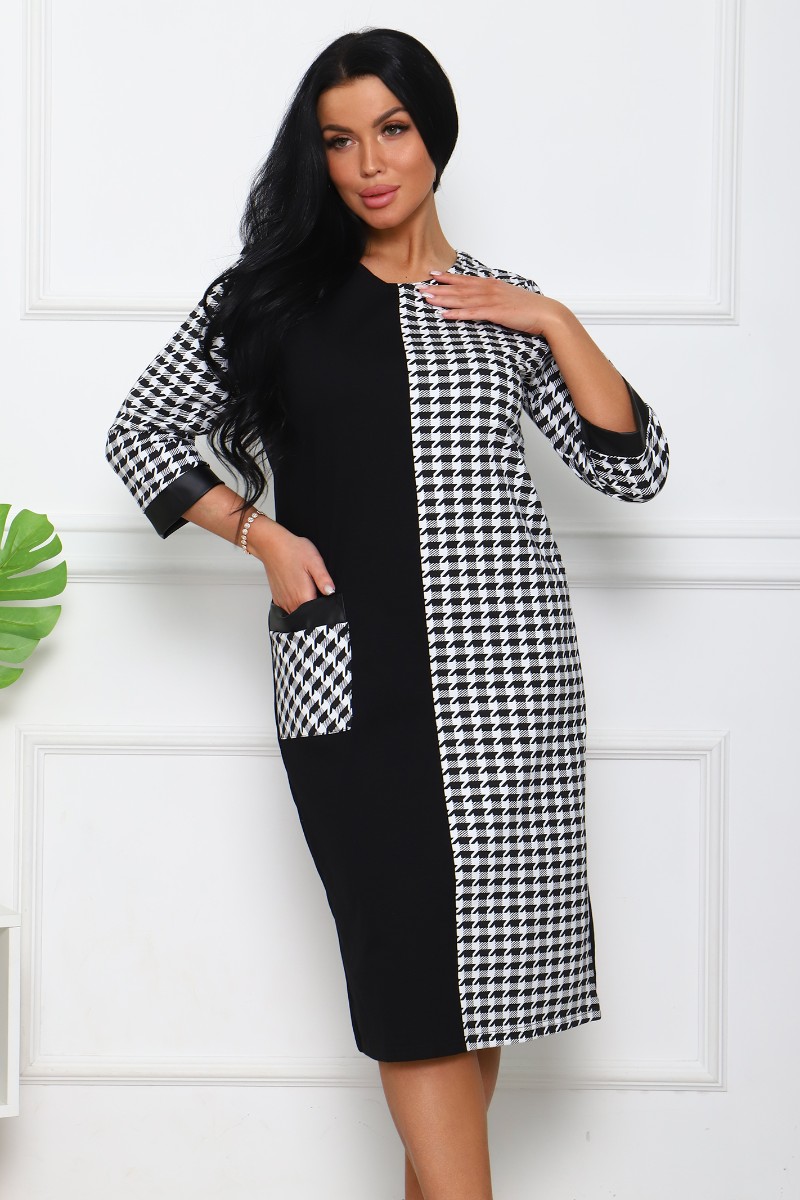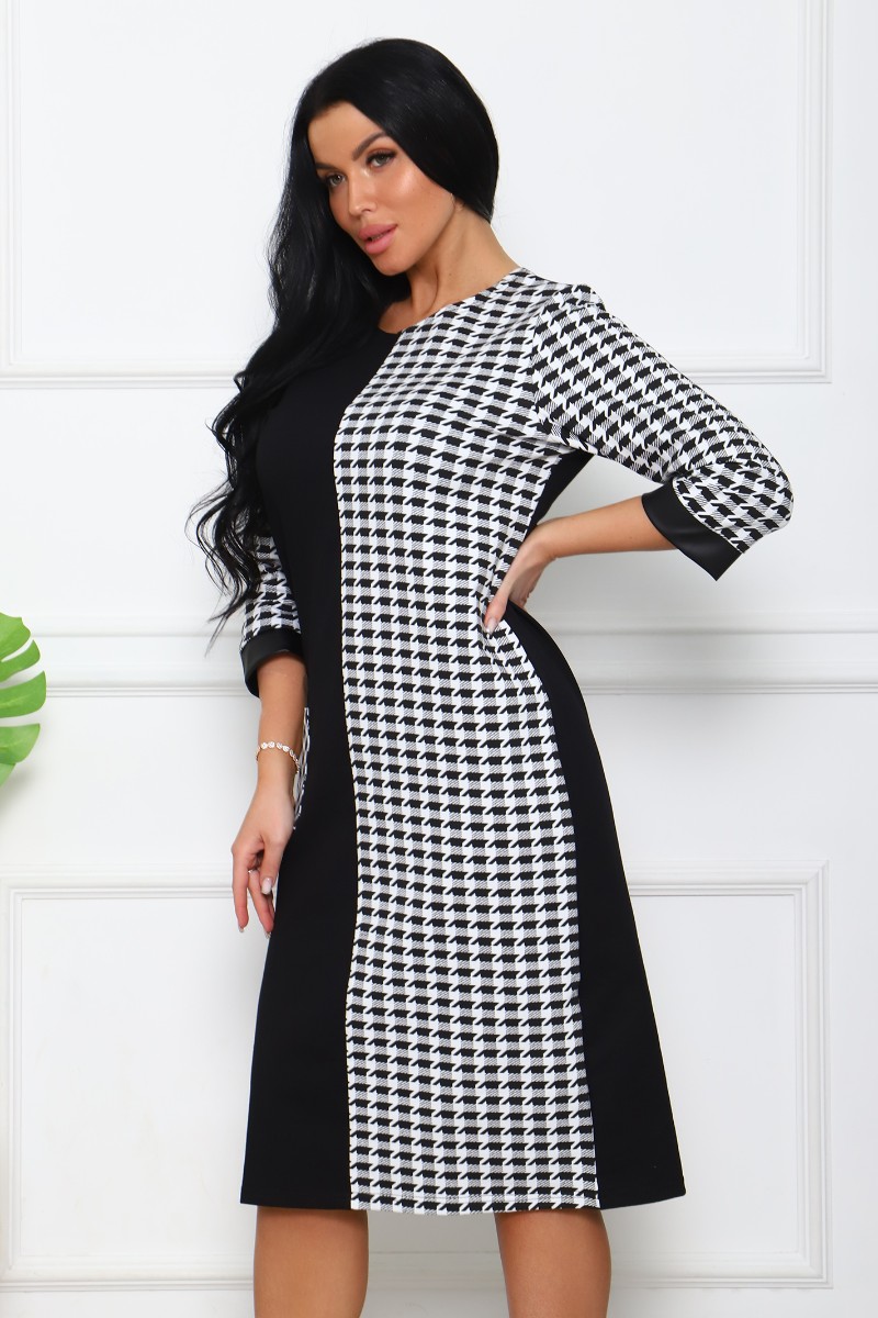 Представляем Вашему вниманию изысканное женское платье свободного покроя с рукавом средней длины, с оригинальным сочетанием направленности рисунка.