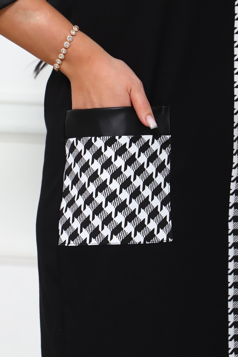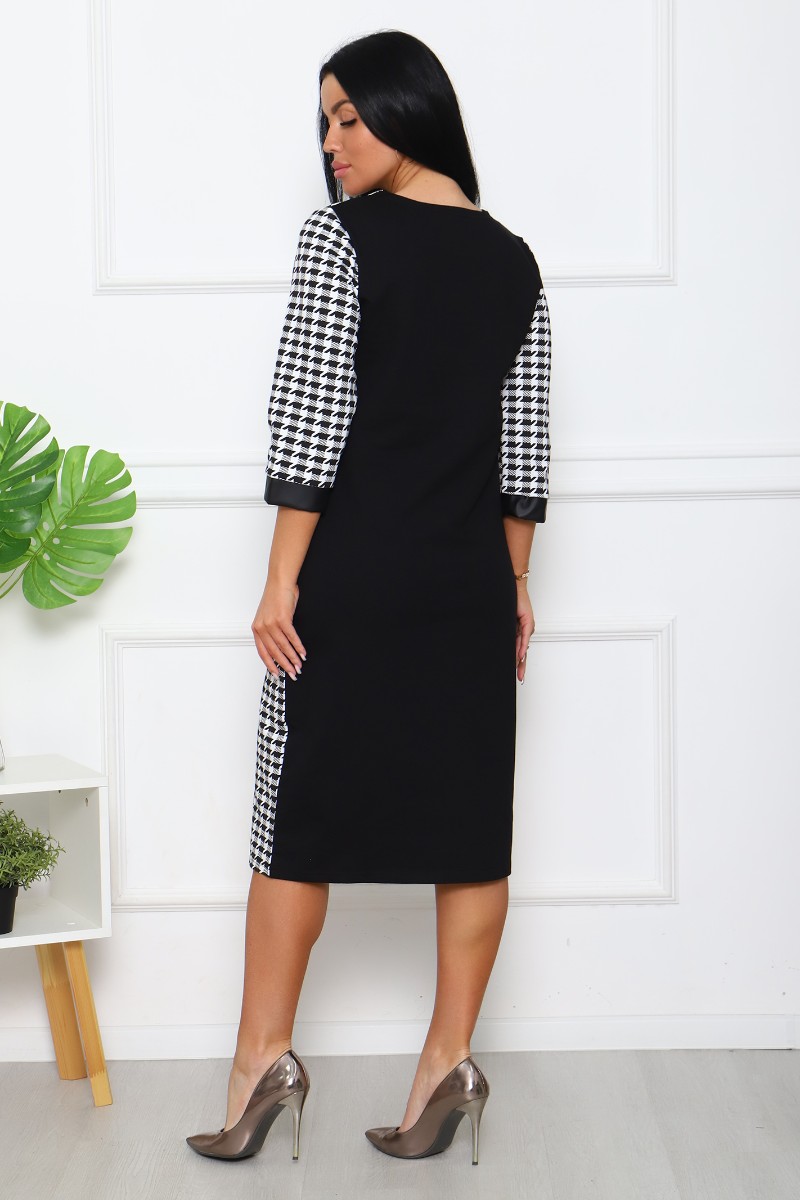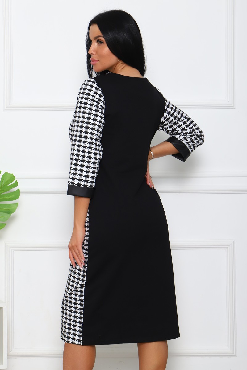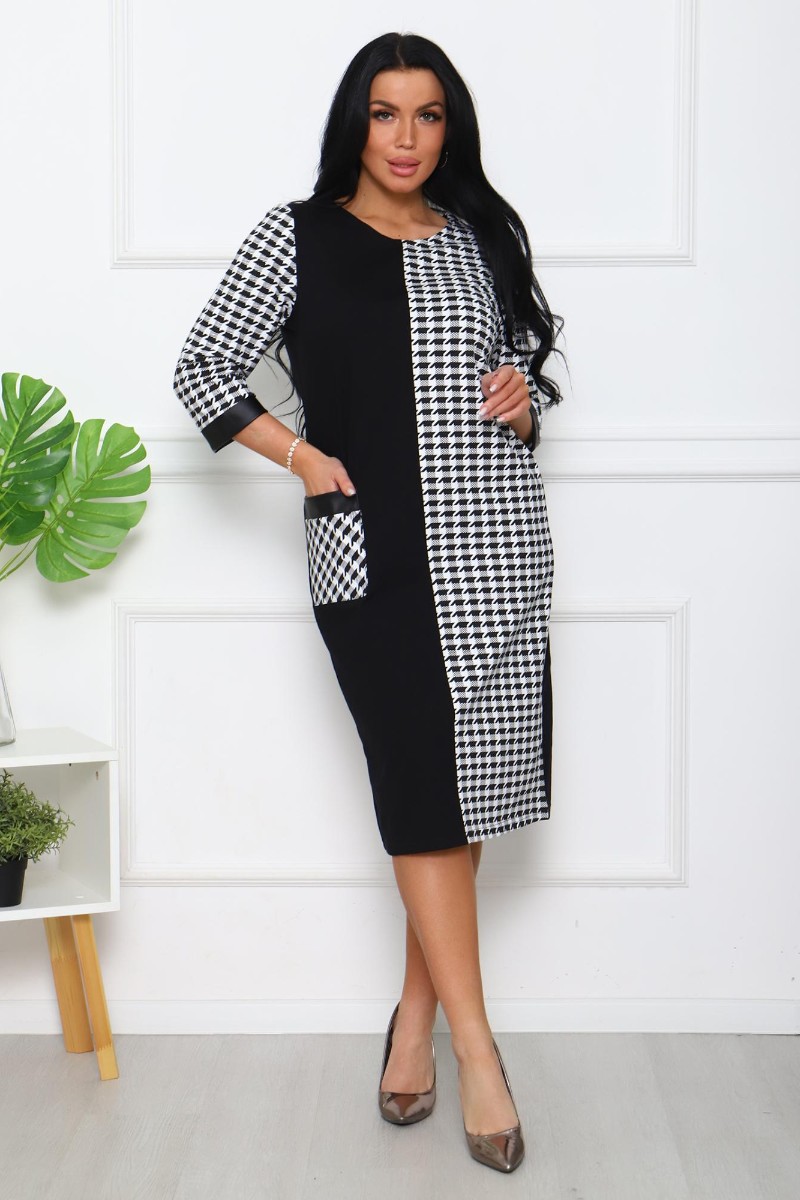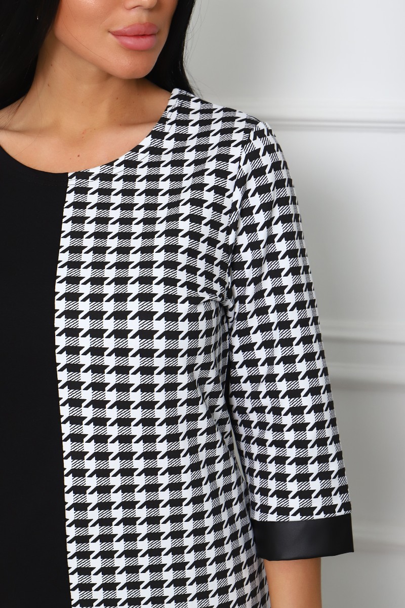 Представляем Вашему вниманию изысканное женское платье свободного покроя с рукавом средней длины, с оригинальным сочетанием направленности рисунка.